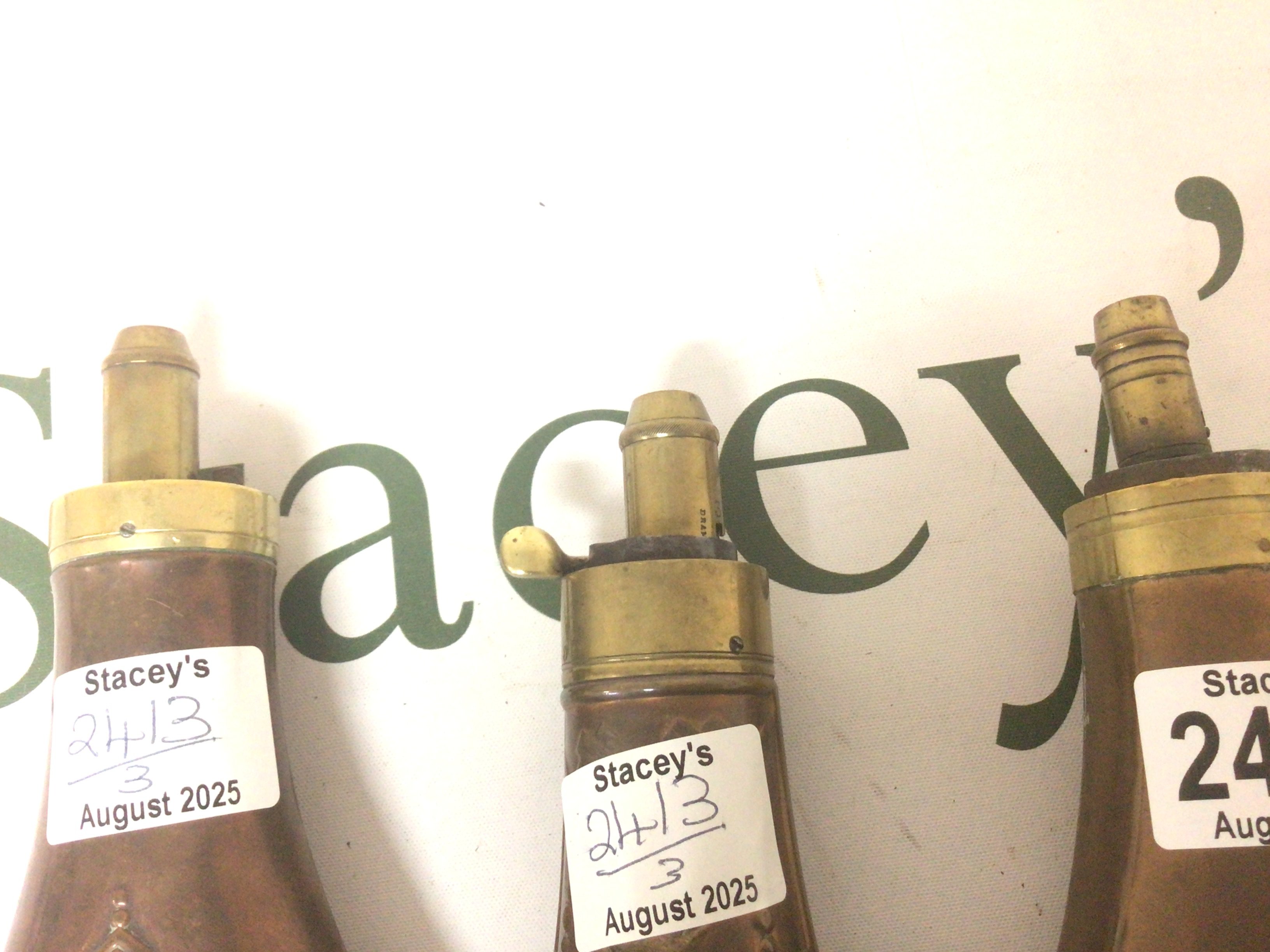 Three 19th Century copper powder flasks. Repousse chased decoration with game birds and brass mounts (3)