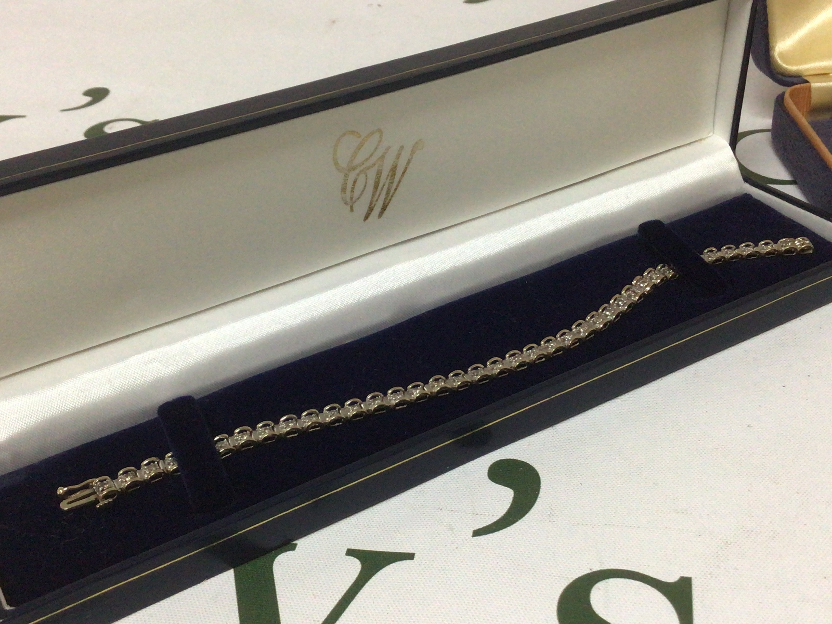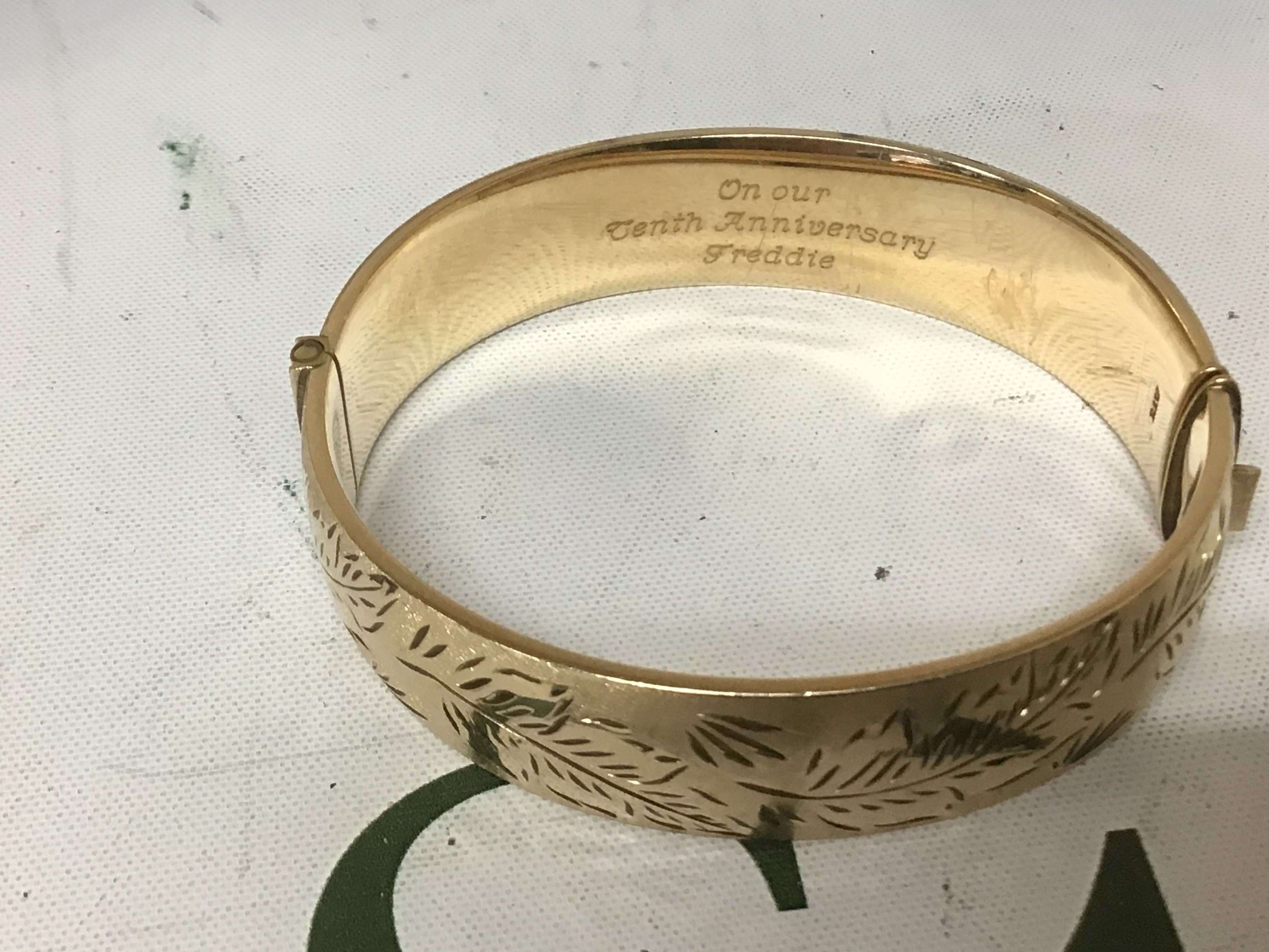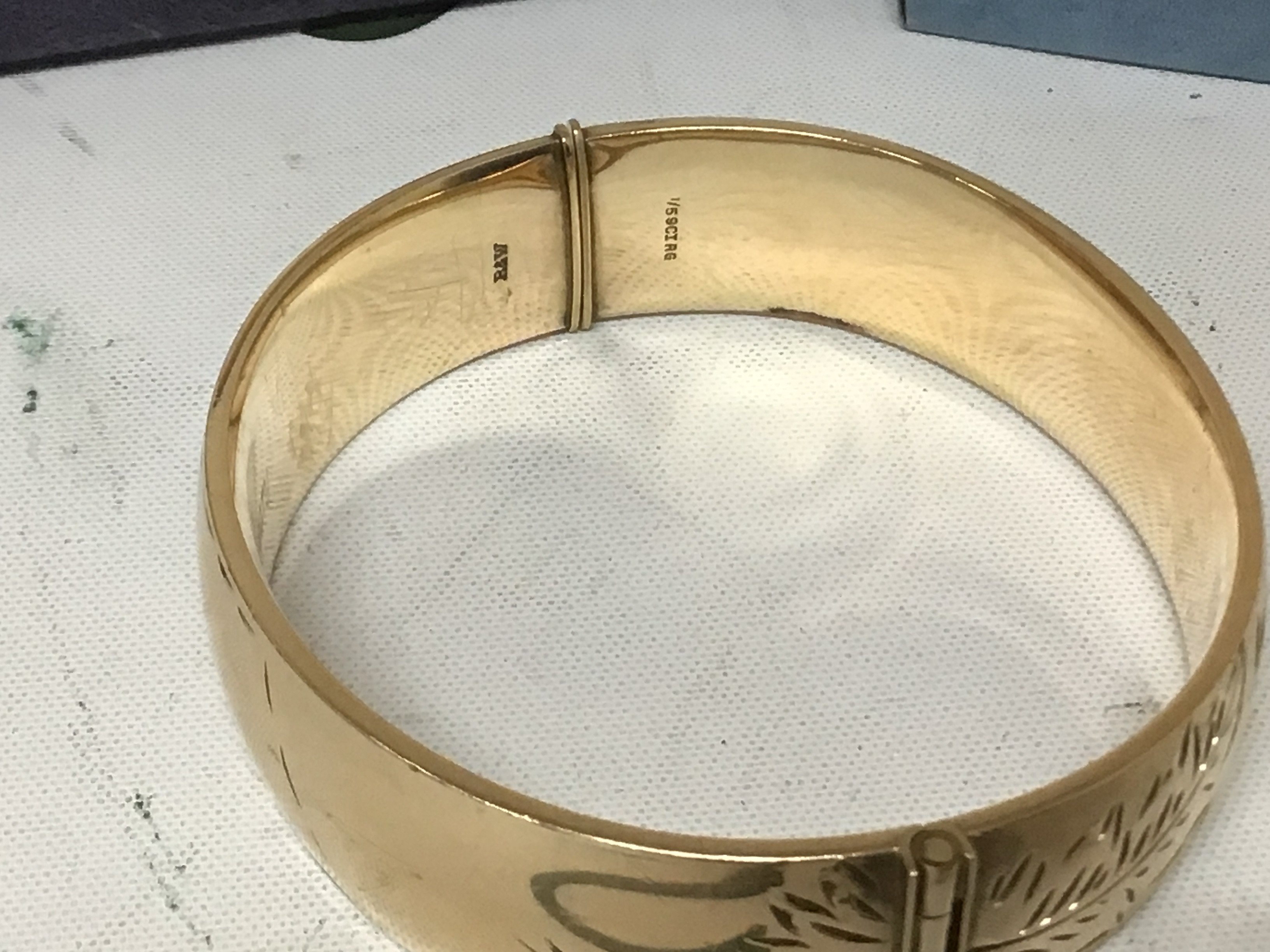 A 9carat gold bracelet weight 7g and a gold 1/5 bangle and a boxed simulated pearl necklace.