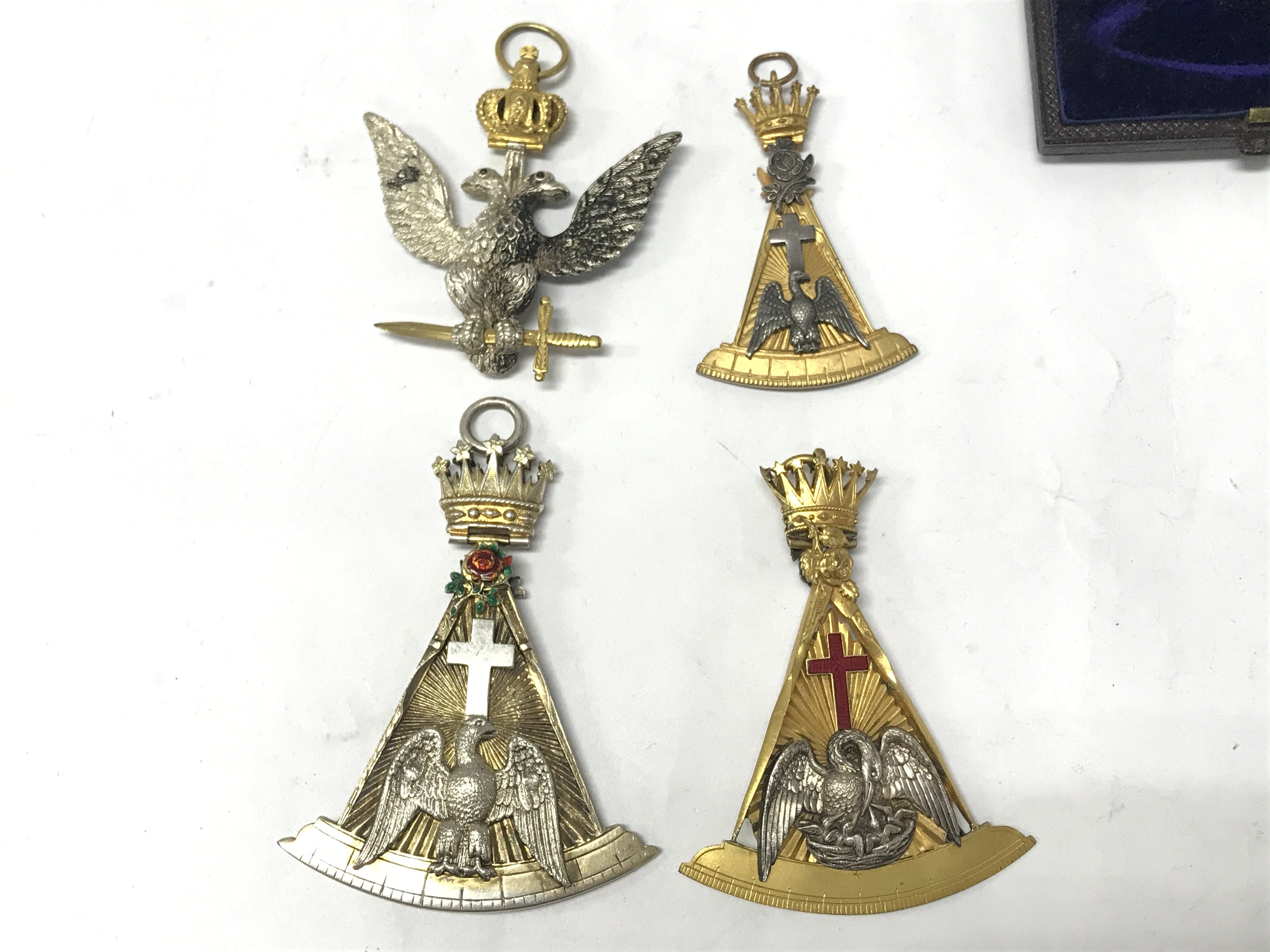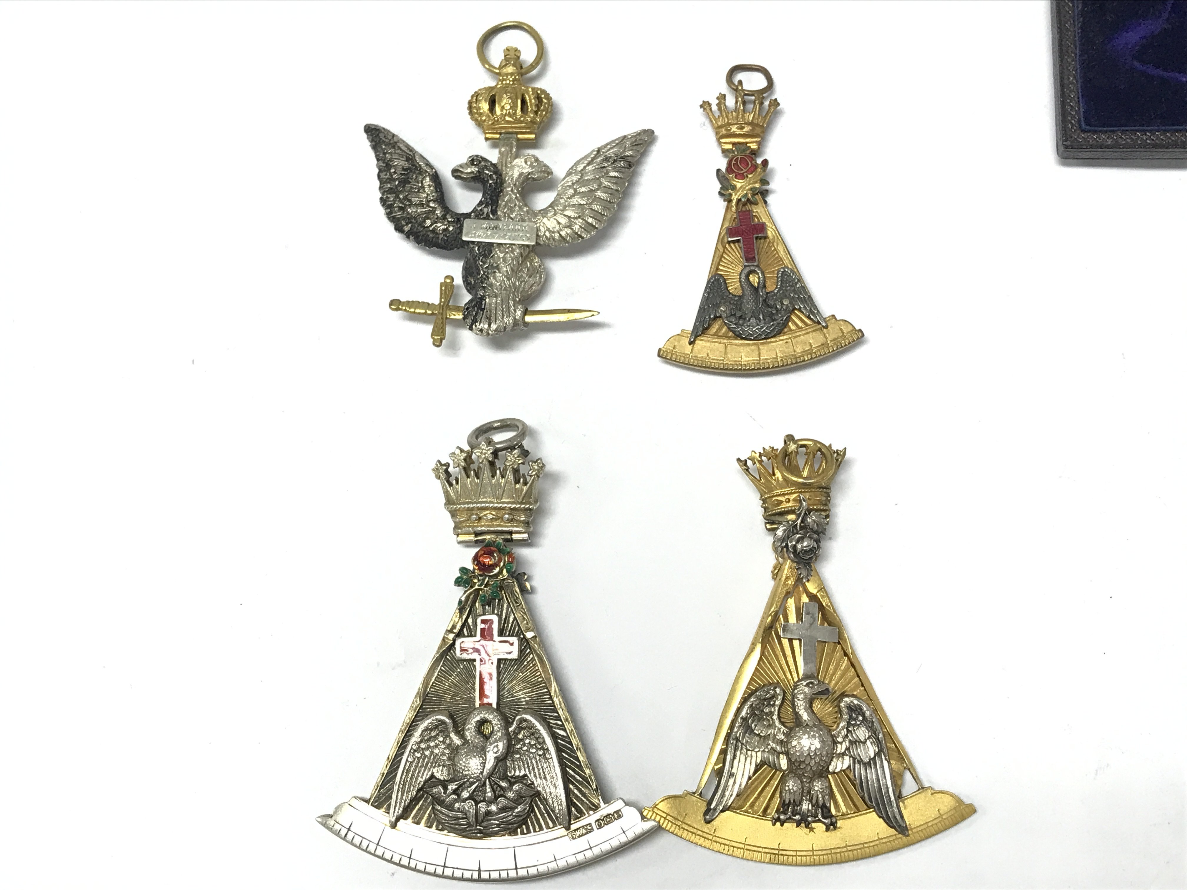 A cased gilt metal Masonic Regalia Rose Croix 18th degree jewel maker Joseph Strakley in a fitted case a similar silver rose Croix a 32nd degree eagle the reverse with date 1873 and one other Croix. Postage category A
