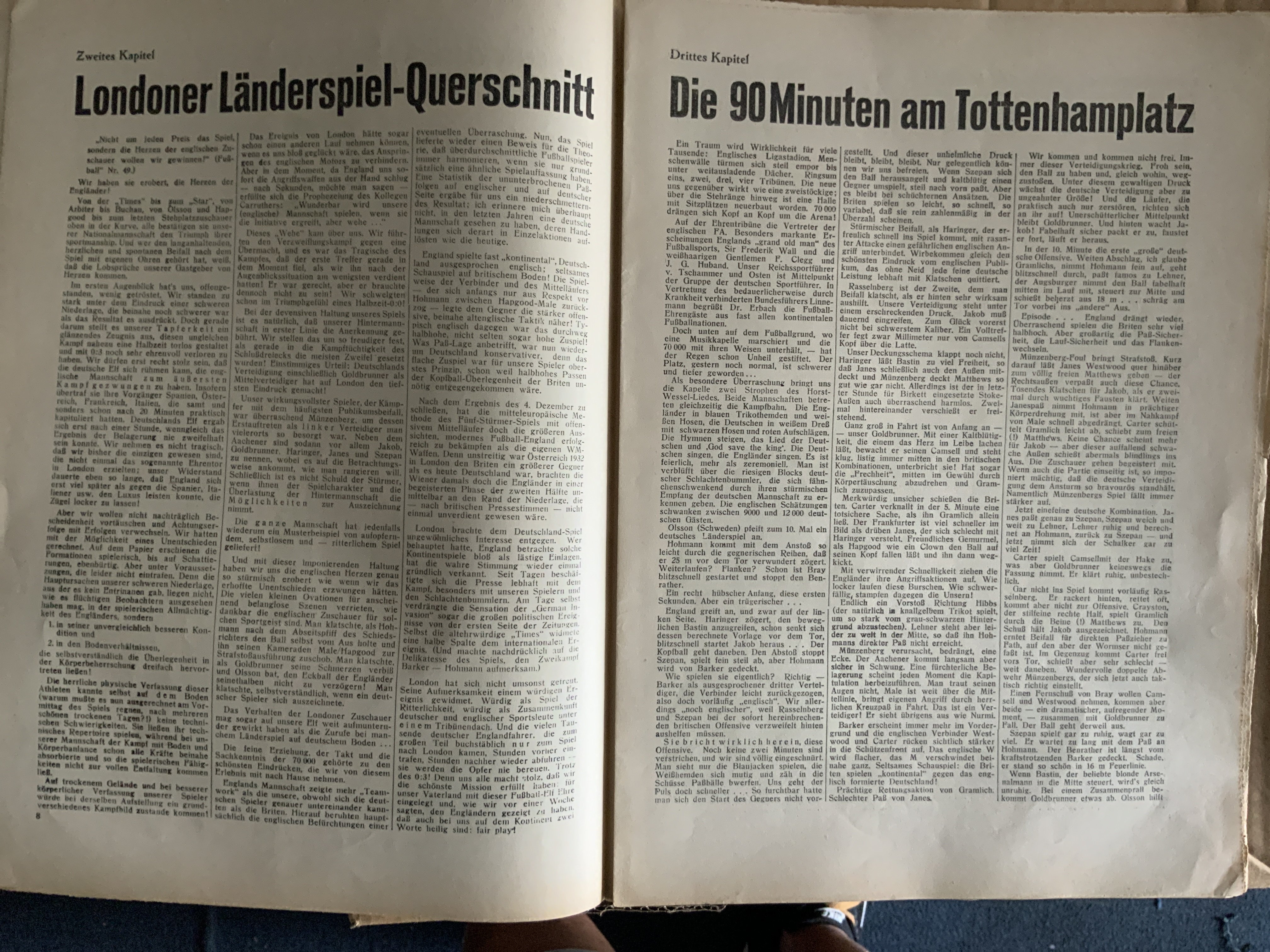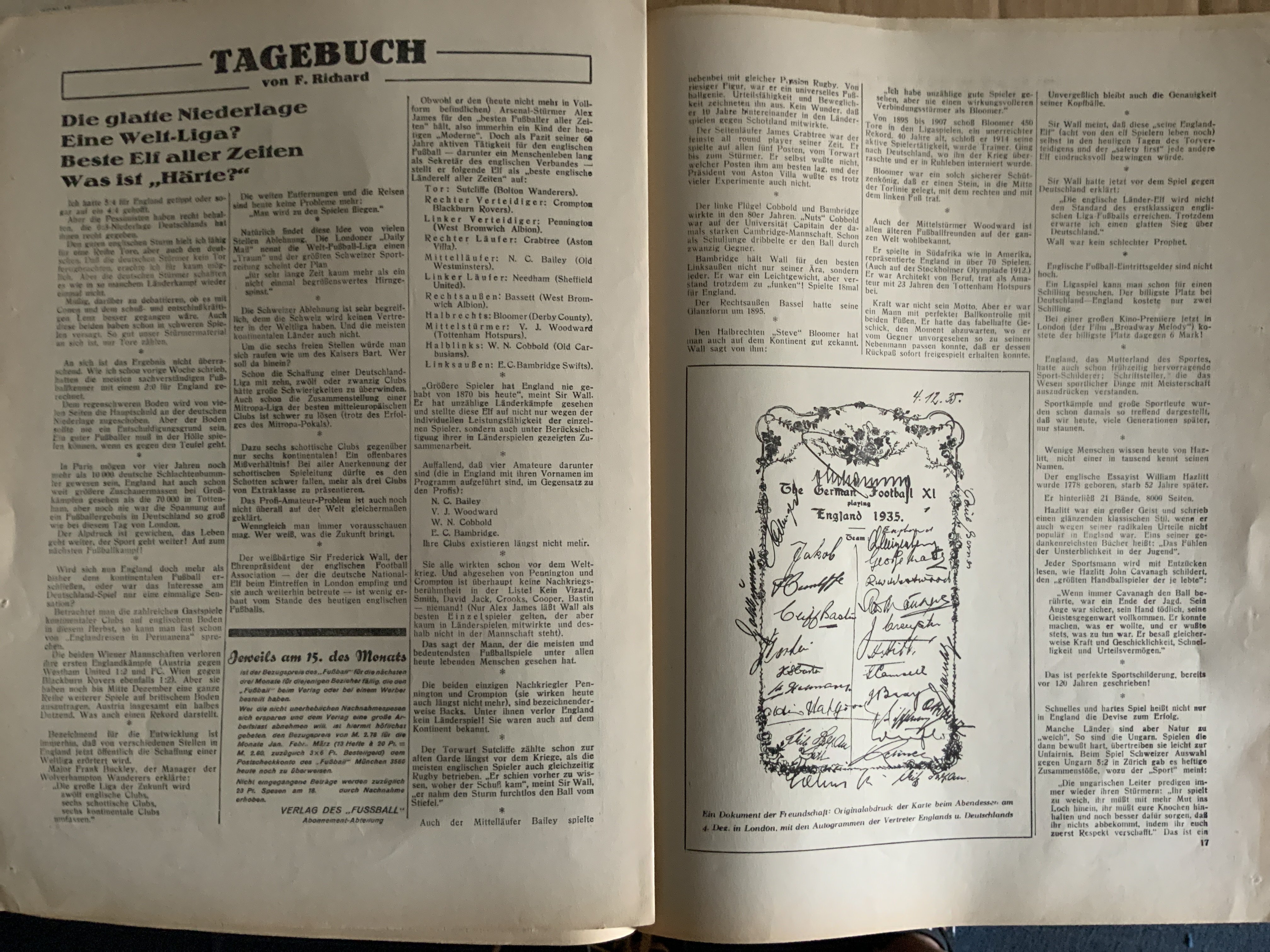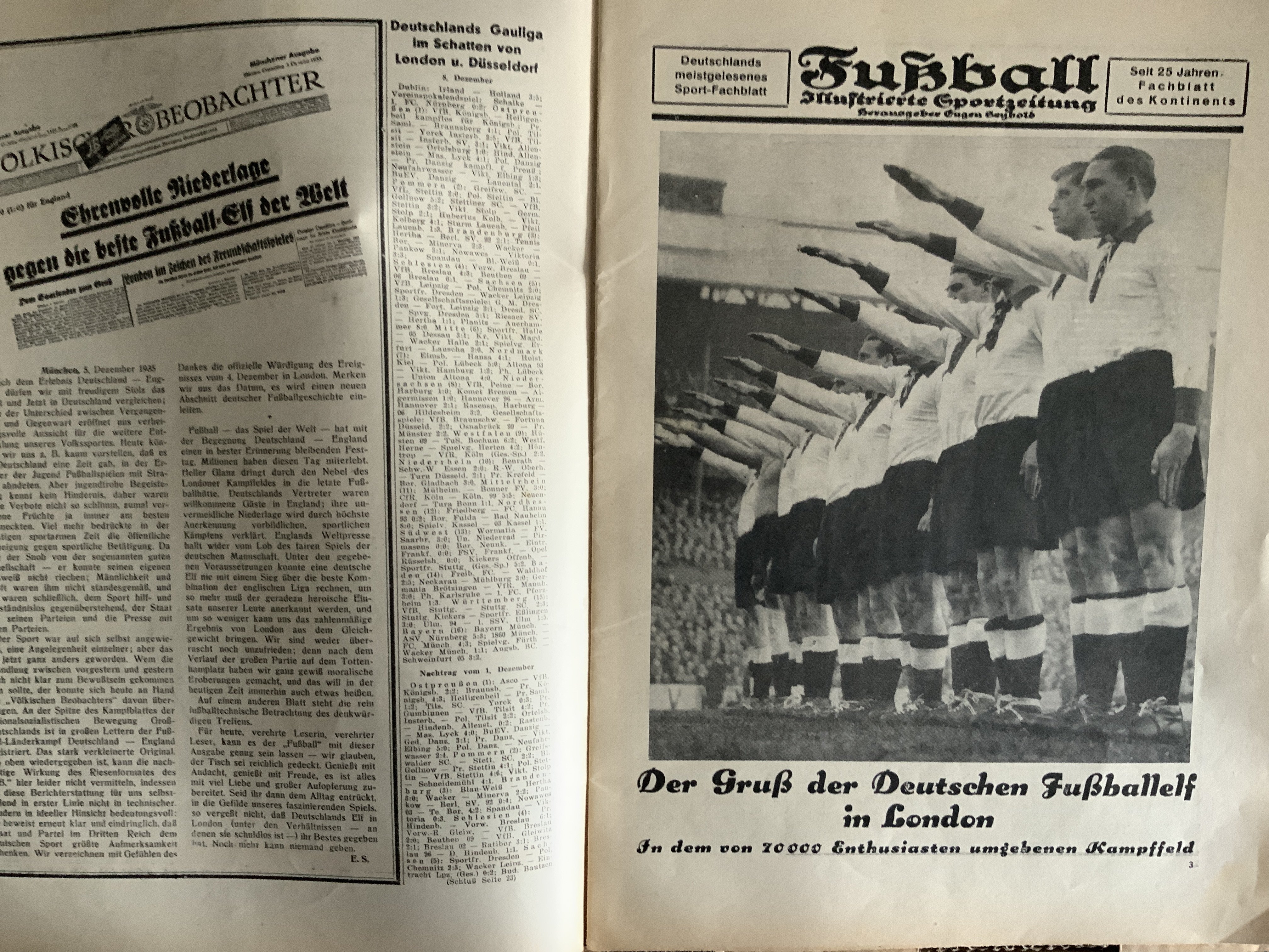 1935 England v Germany At Tottenham Football Newspaper: Infamous match in which the German team all gestured the nazi salute in a ground with a high Jewish support. 24 page German paper is excellent and is devoted just to this match with photos and match reports.