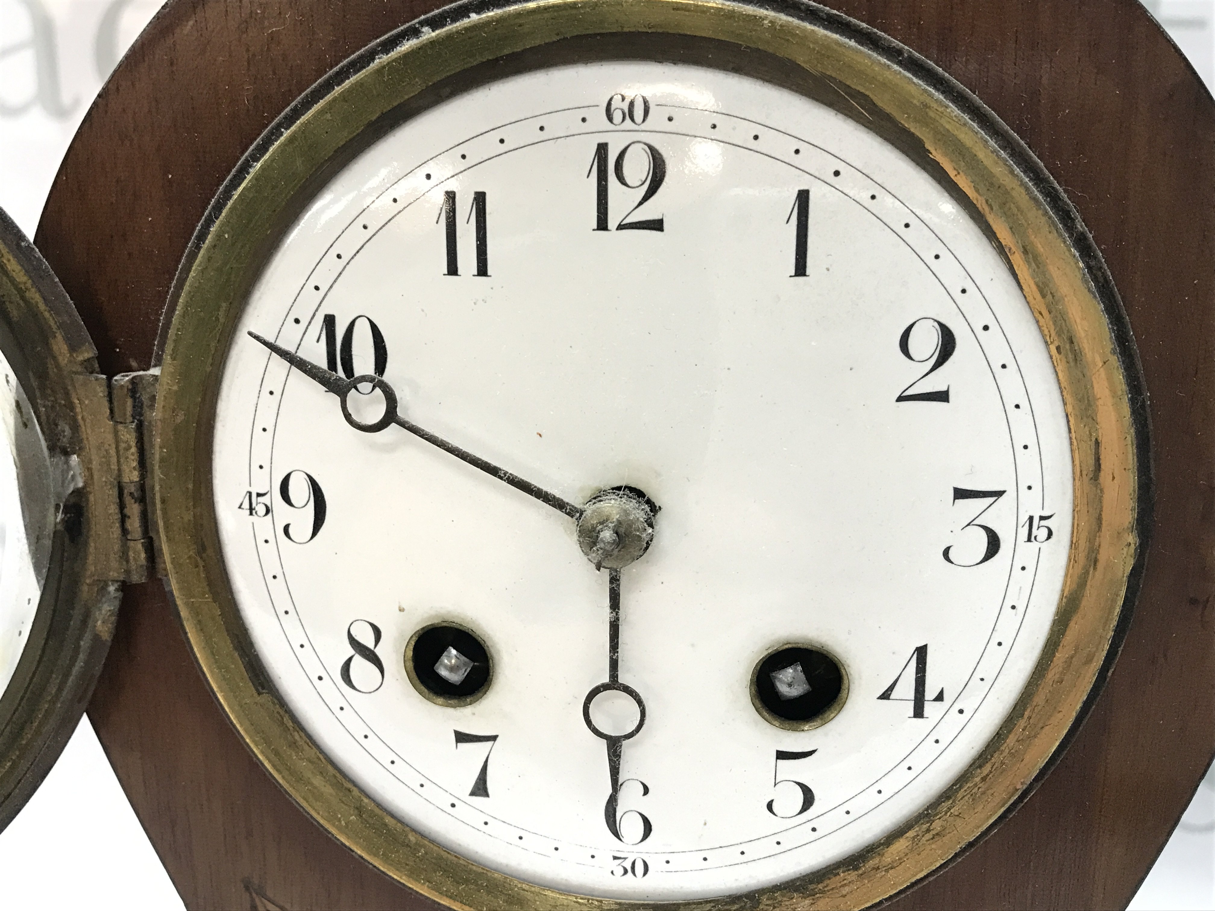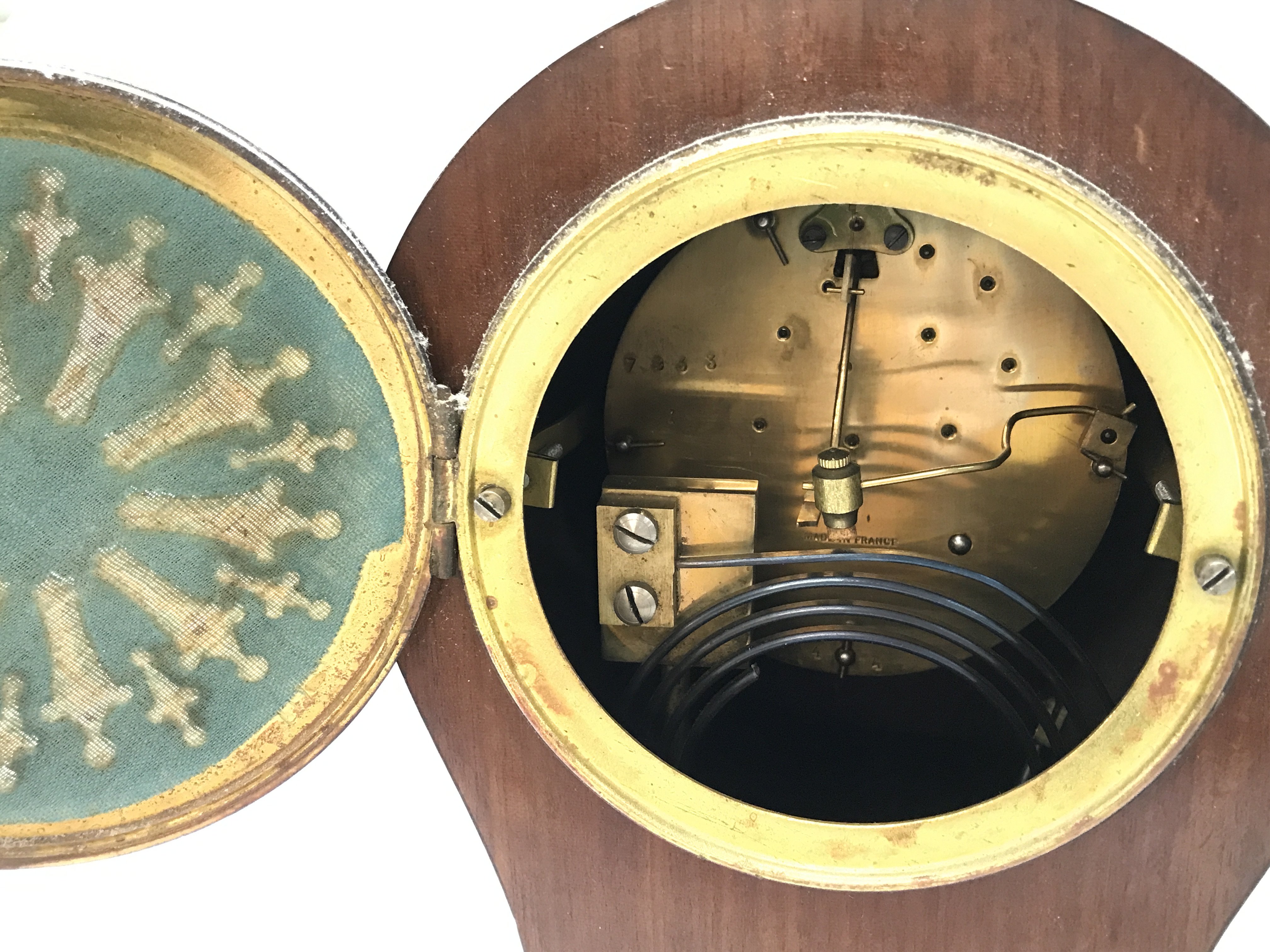 A mantle clock with inlaid design and French movement , this lot cannot be posted