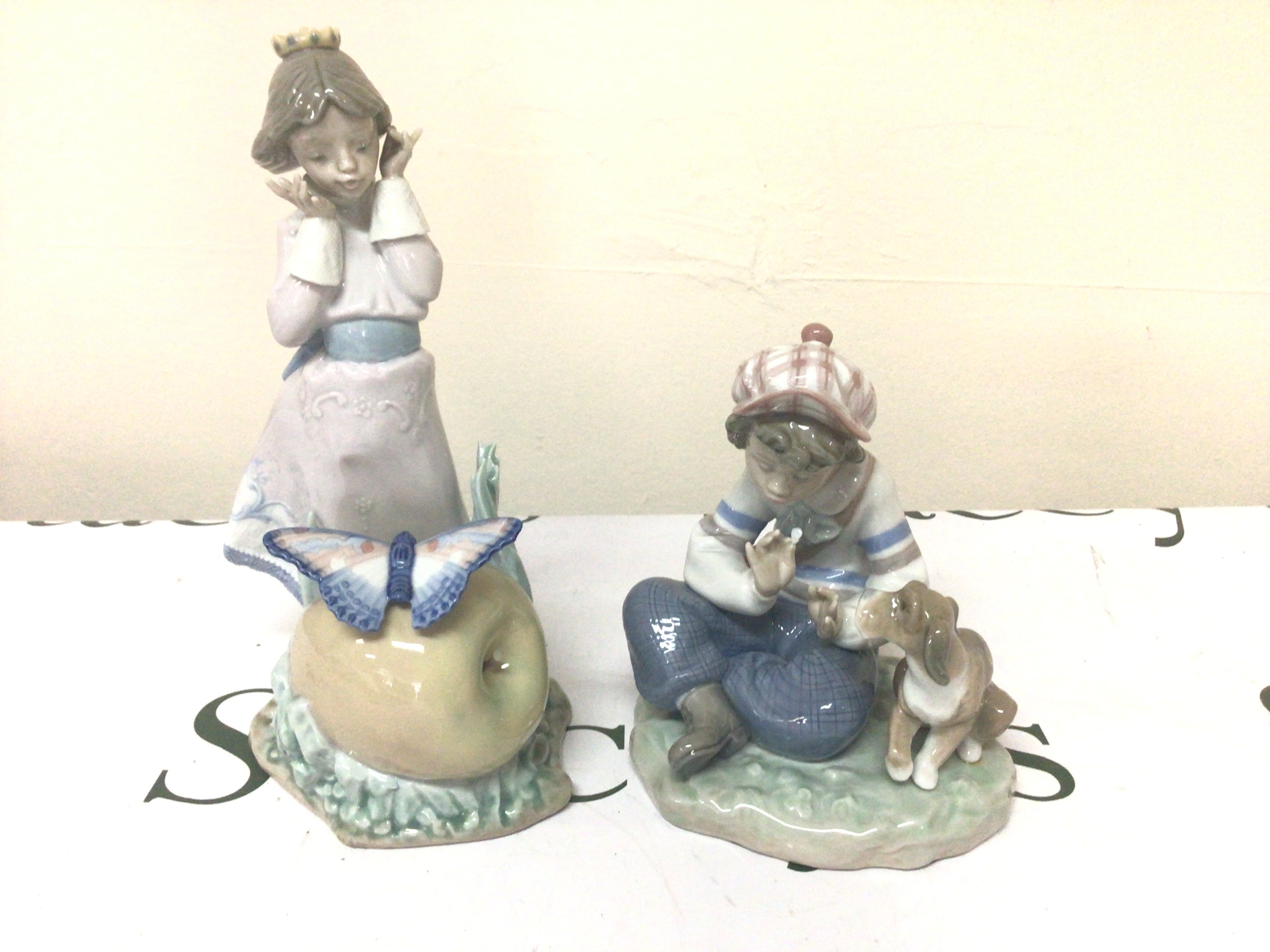 Two Lladro figures a boy seated with his dog and young girl with a butterfly (2)