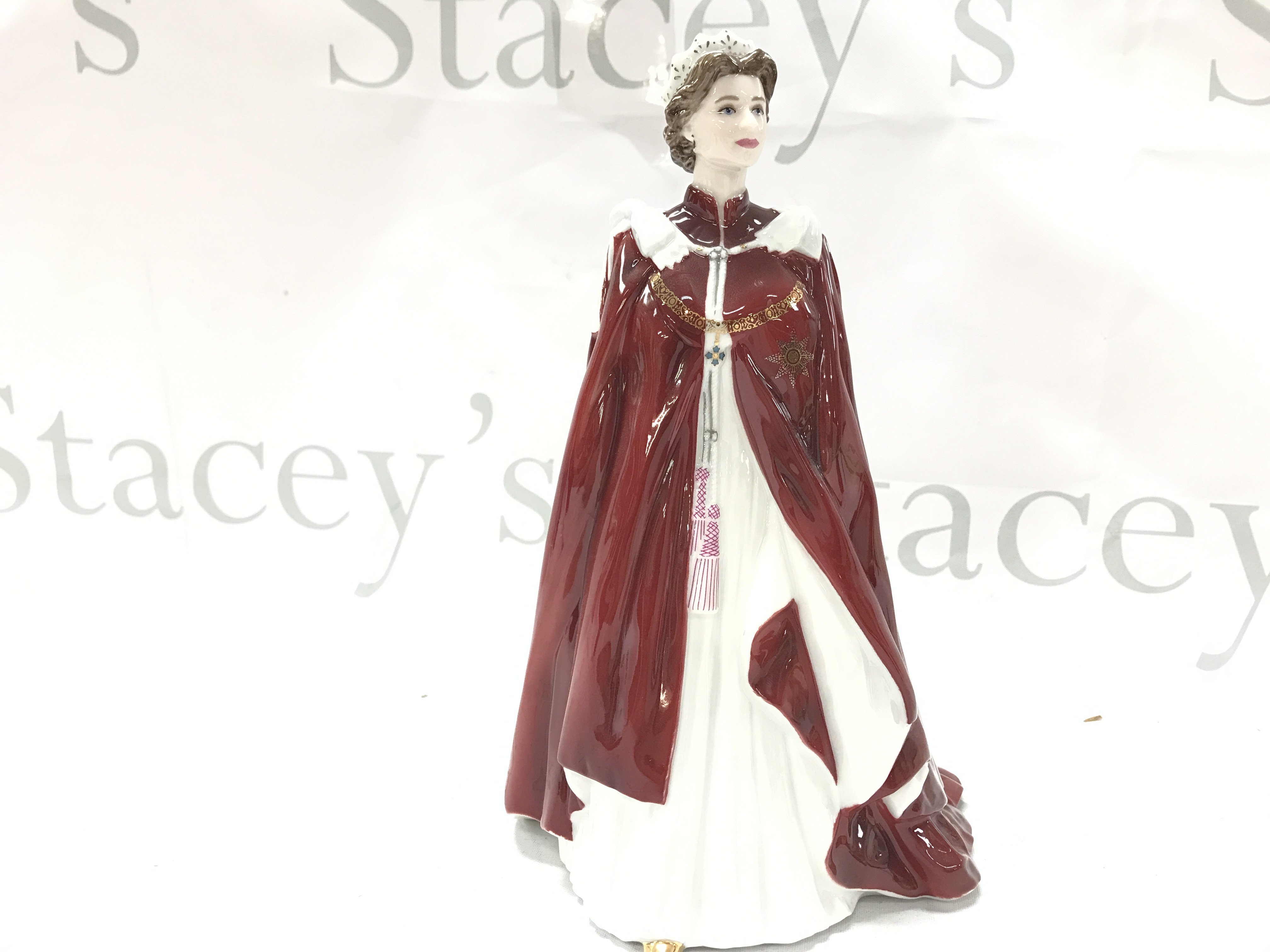 A collection of coloured glass including red, blue and Green cups, late 19th century pewter German pair of vases , Royal Horticultural Chelsea flower show porcelain plates, cut glass brandy decanter, Royal Worcester Queen figure. This lot cannot be posted