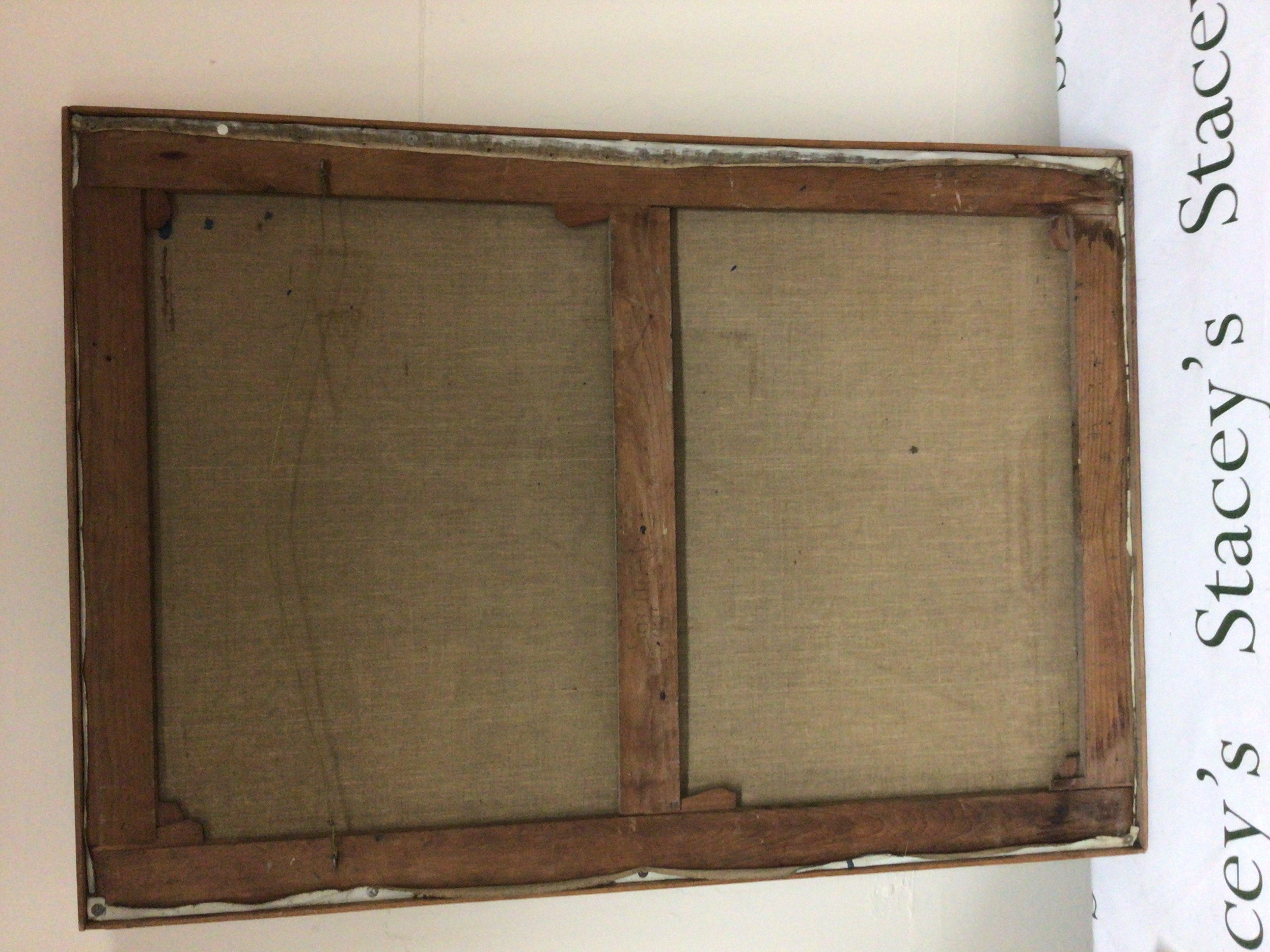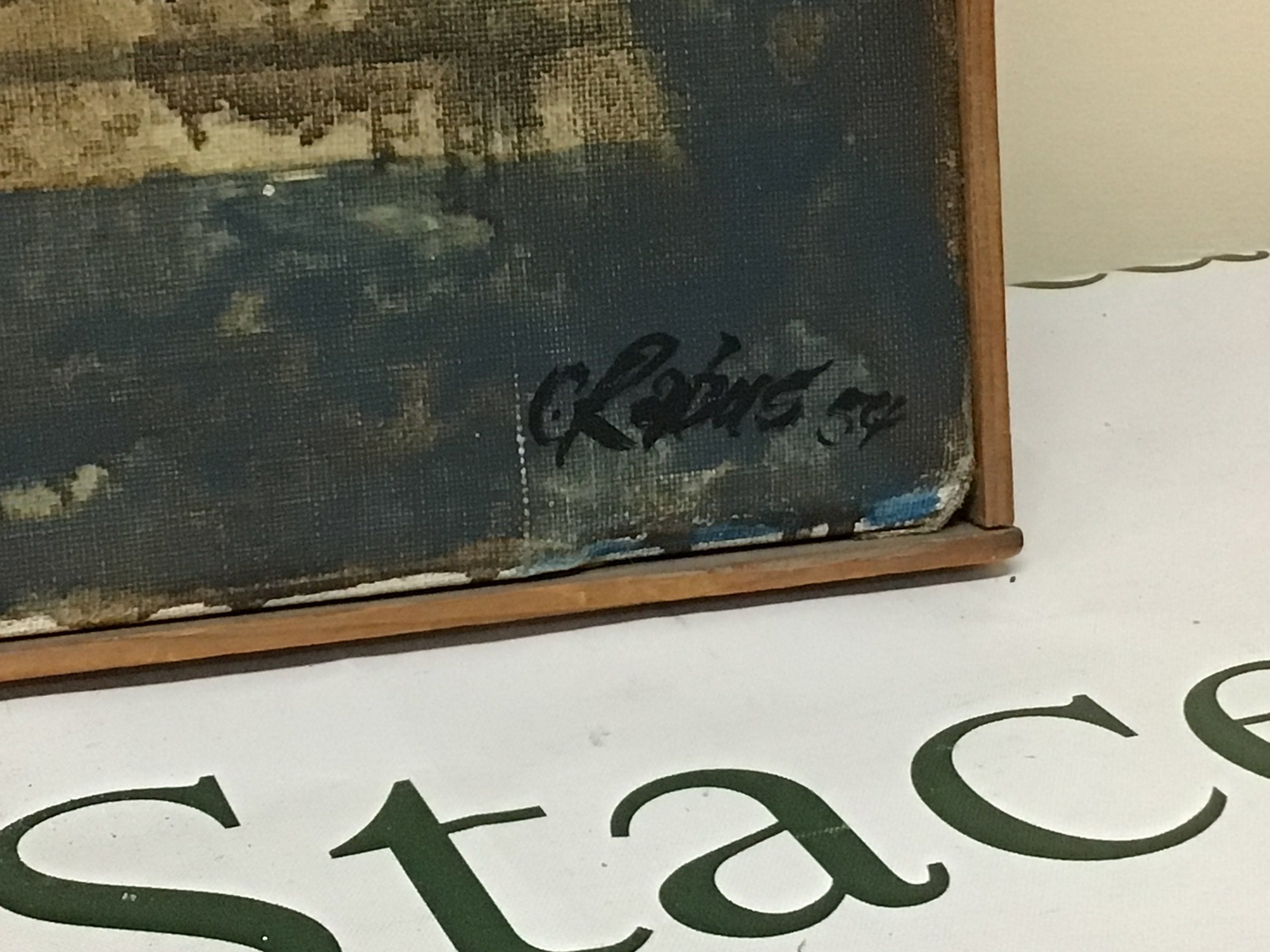 A mid 20th century oil painting on canvas abstract with coloured and outlined rectangles. Signed lower right. CRabas54. 67x94cm