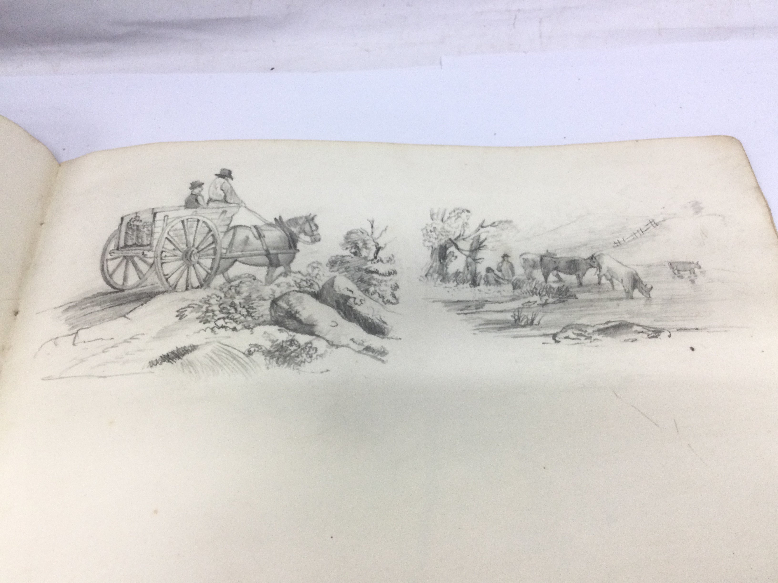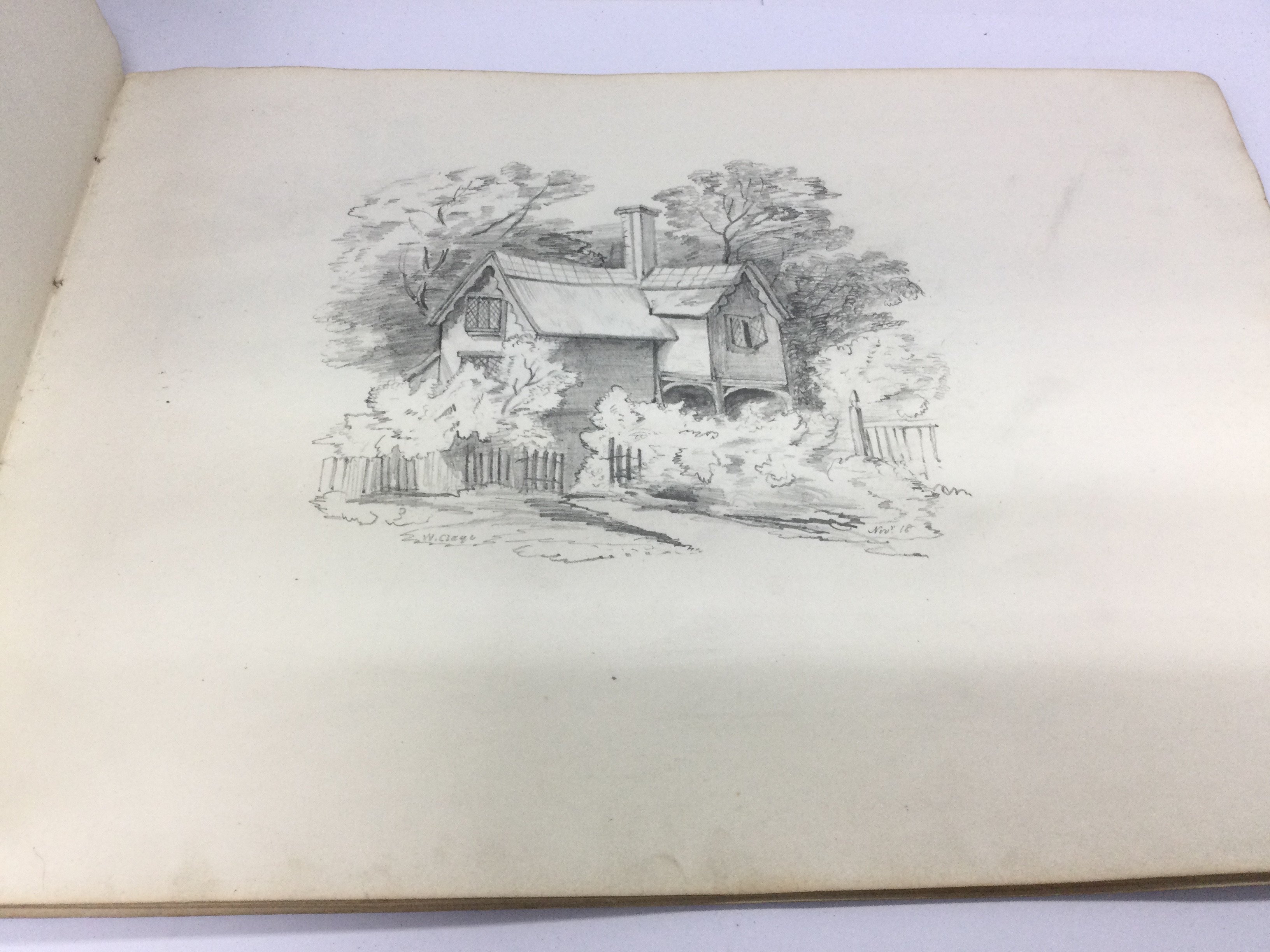 A sketch book containing various pencil drawings and a watercolour. Shipping category A.