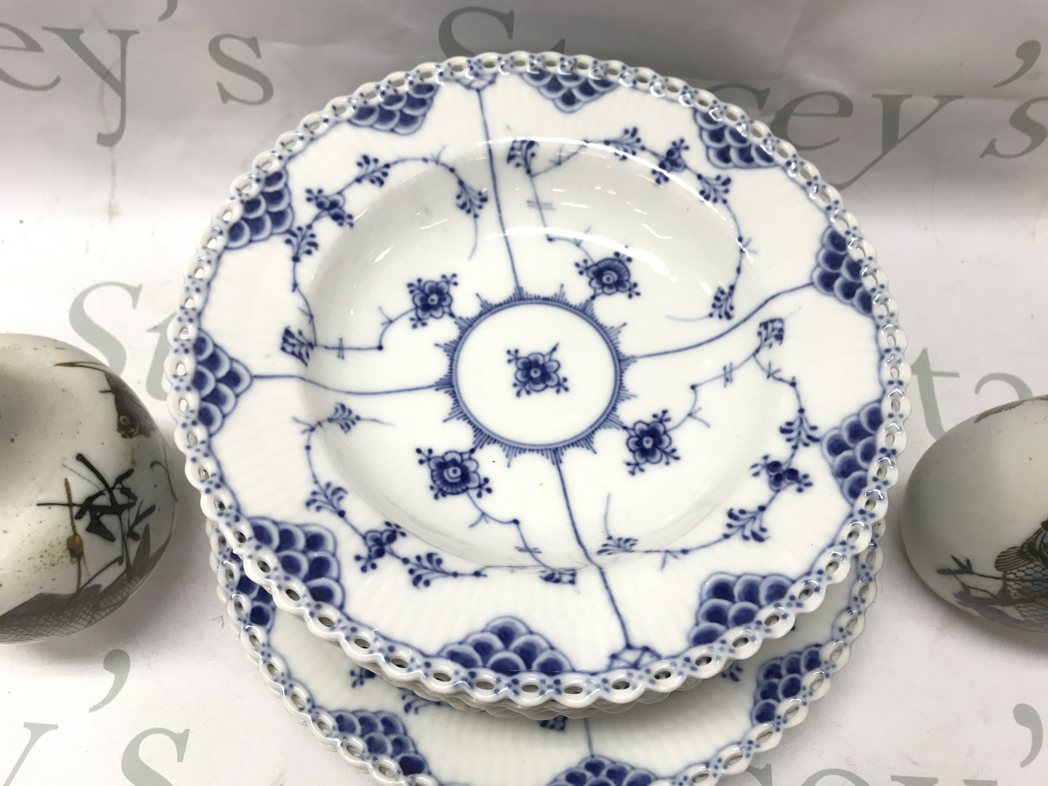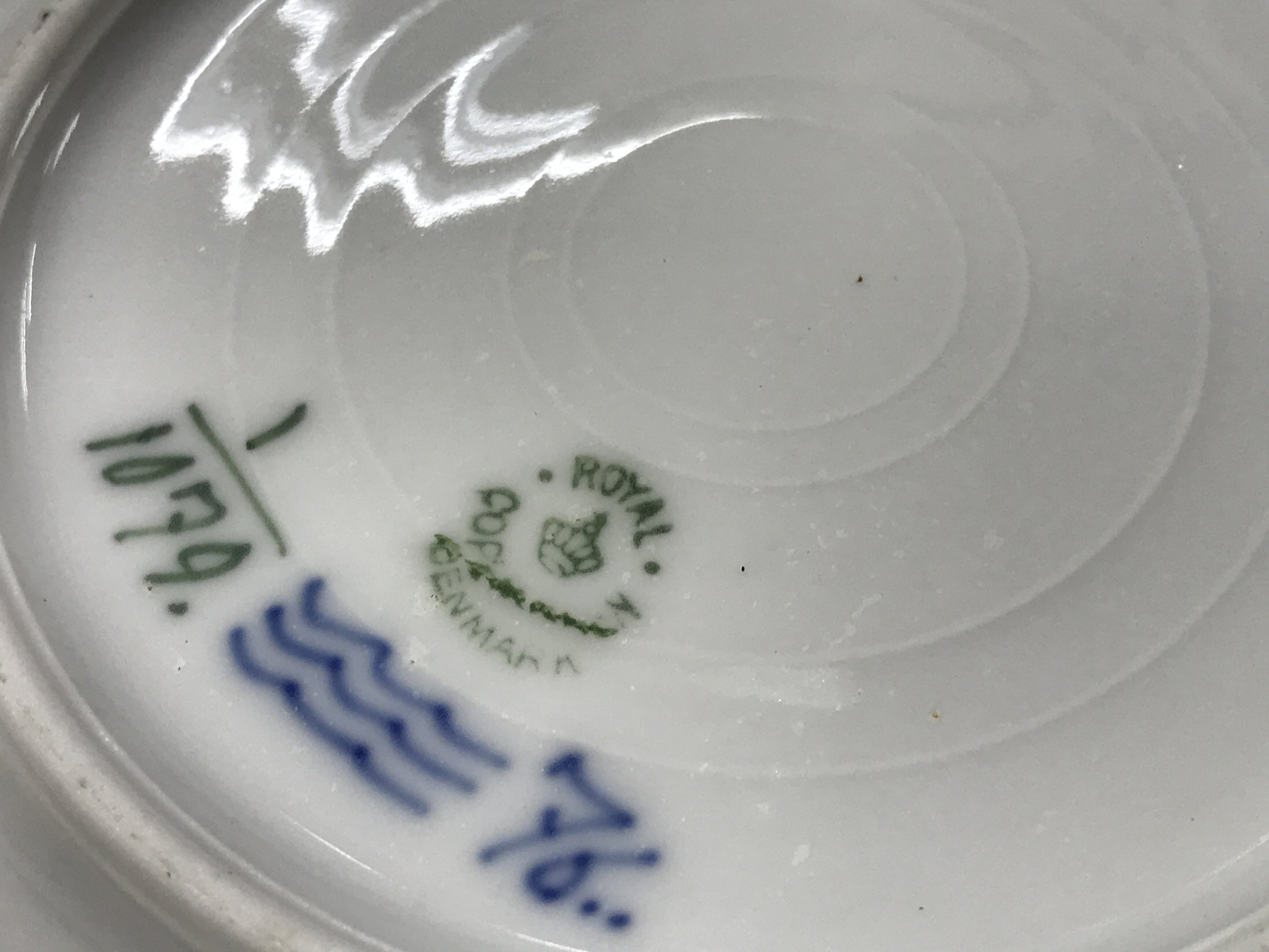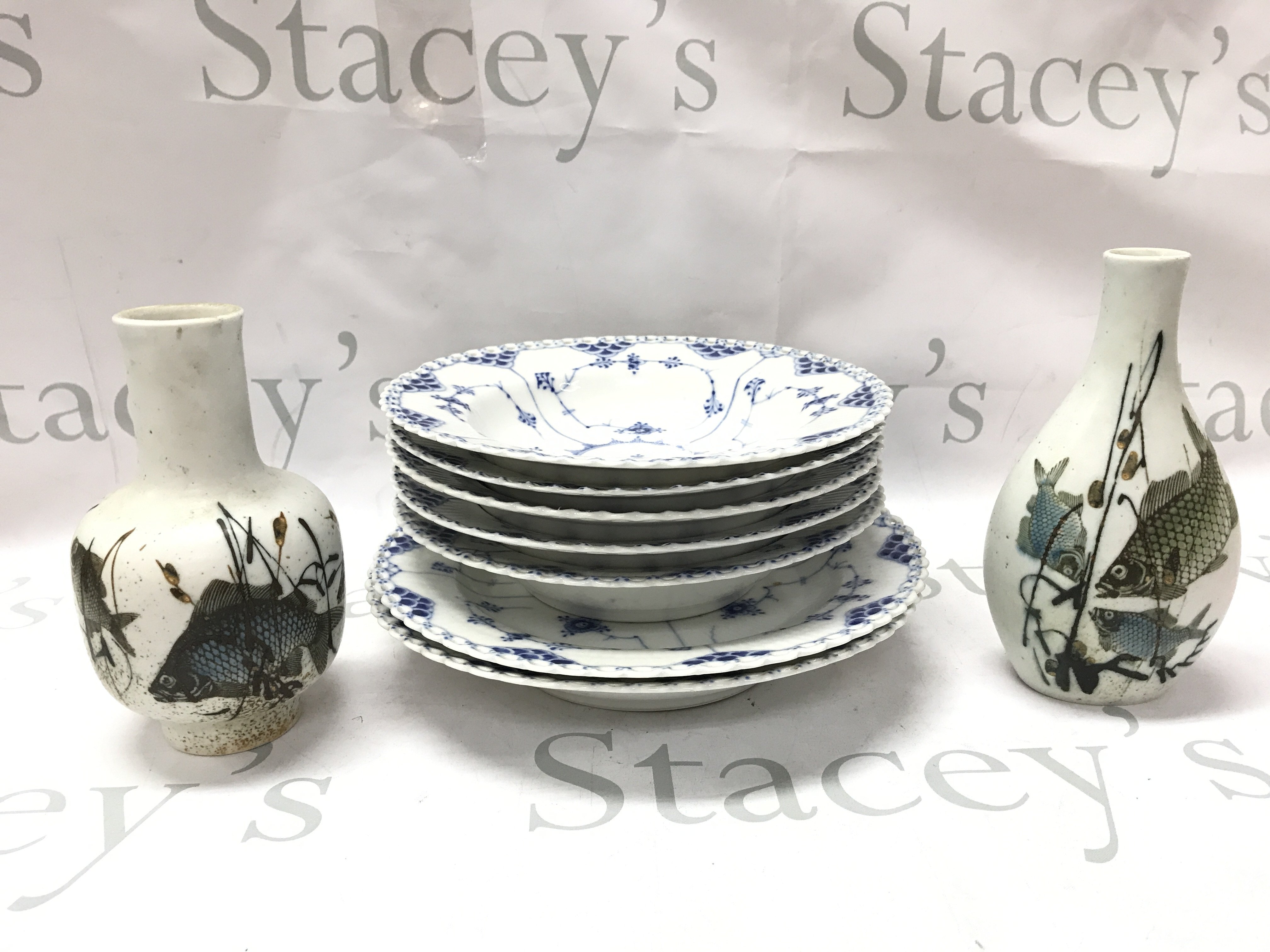 Royal Copenhagen blue fluted full lace plates and Diana Faience Copenhagen fish vases . This lot cannot be posted