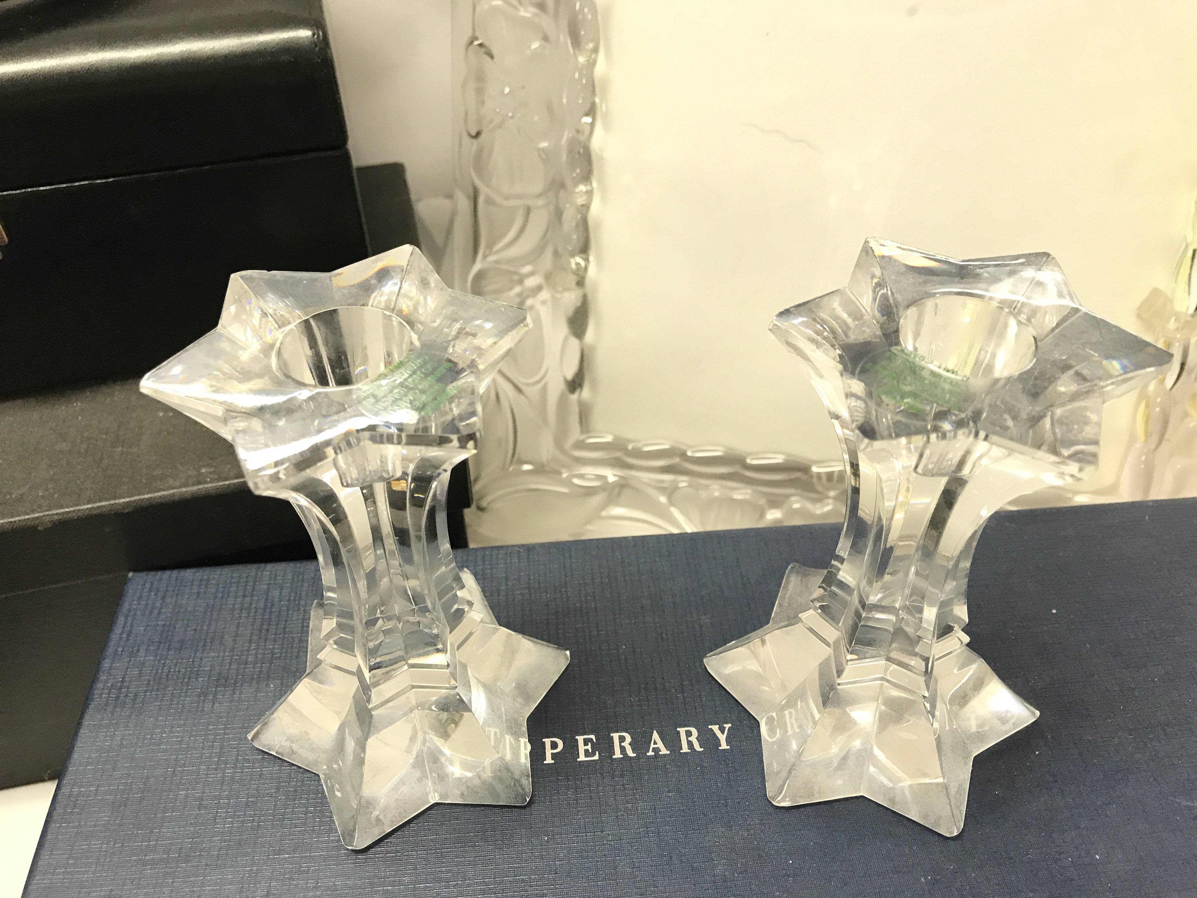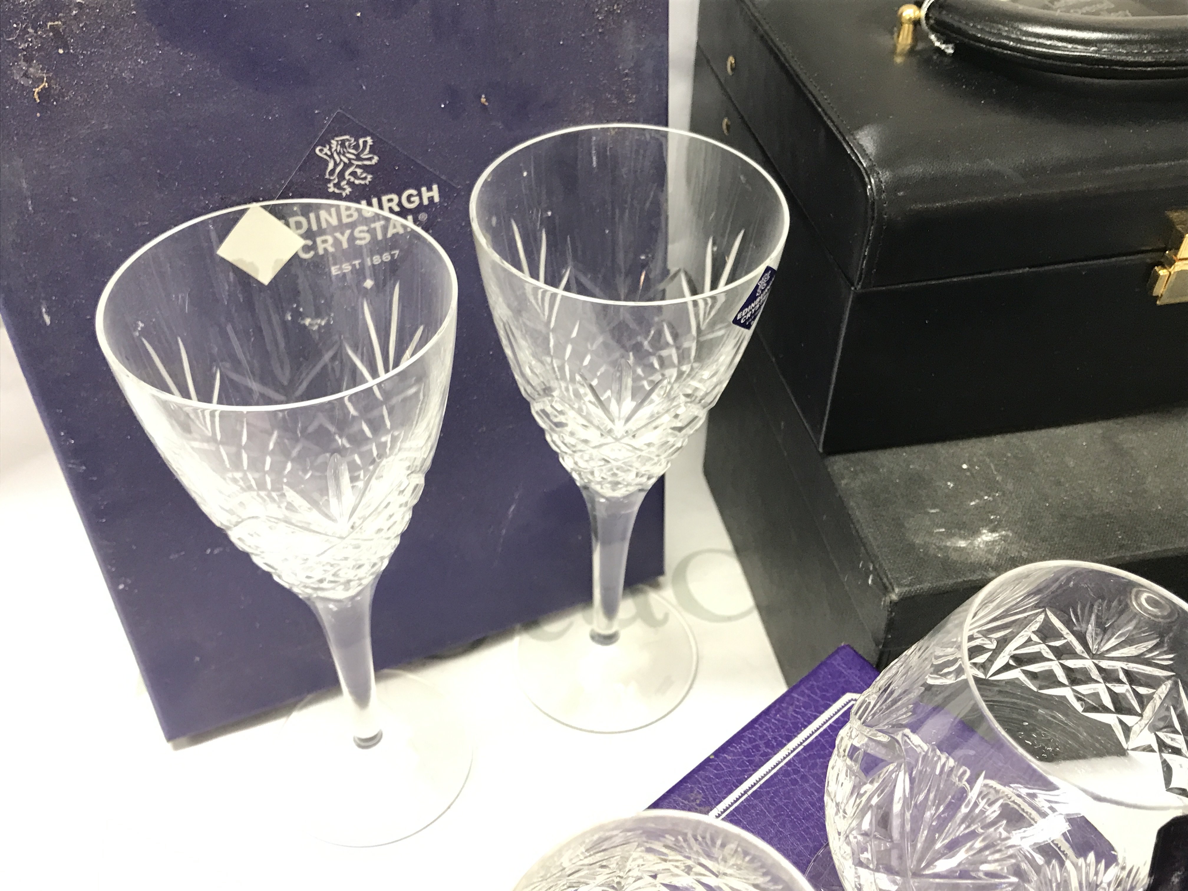 Boxed crystal class including Edinburgh crystal glasses, Tipperary crystal candlesticks, boxed as new leather covered jewellery box, marouisby Waterford glass photo frame . This lot cannot be posted