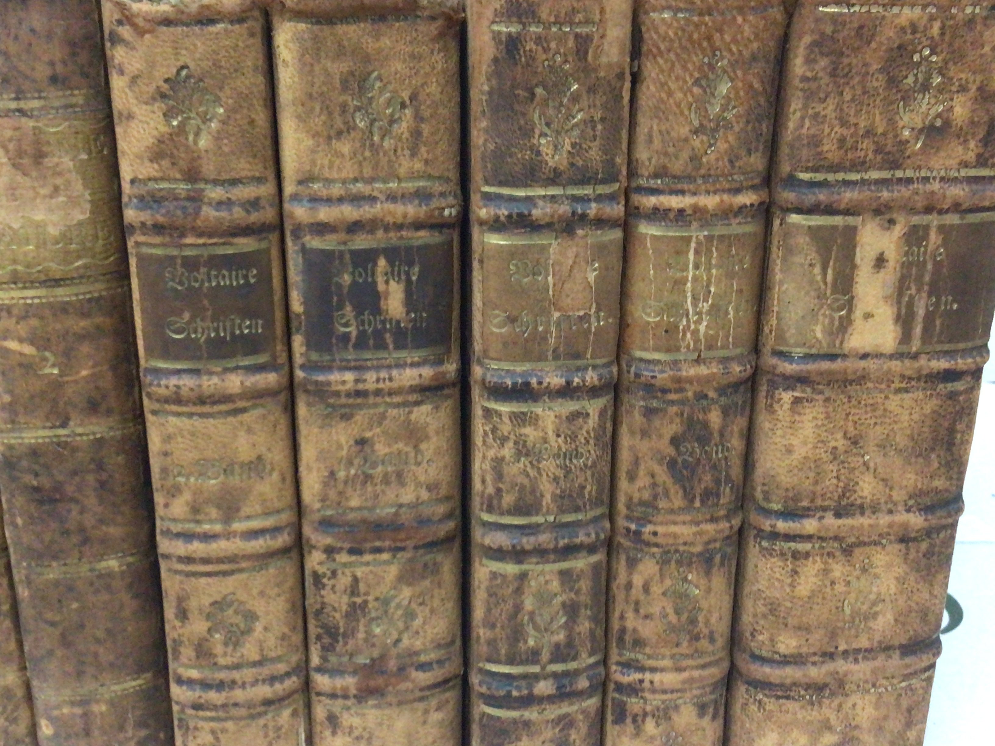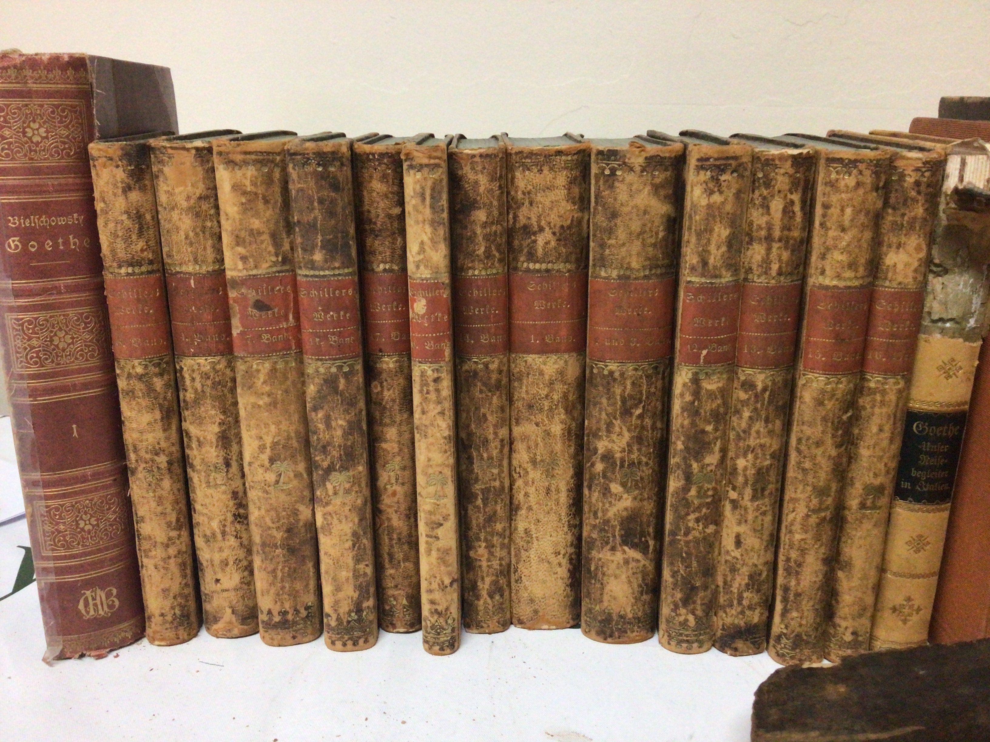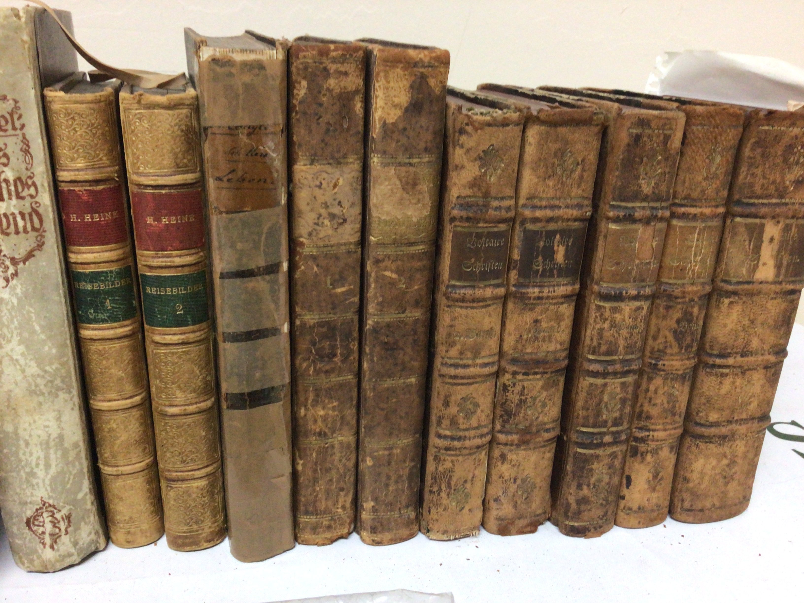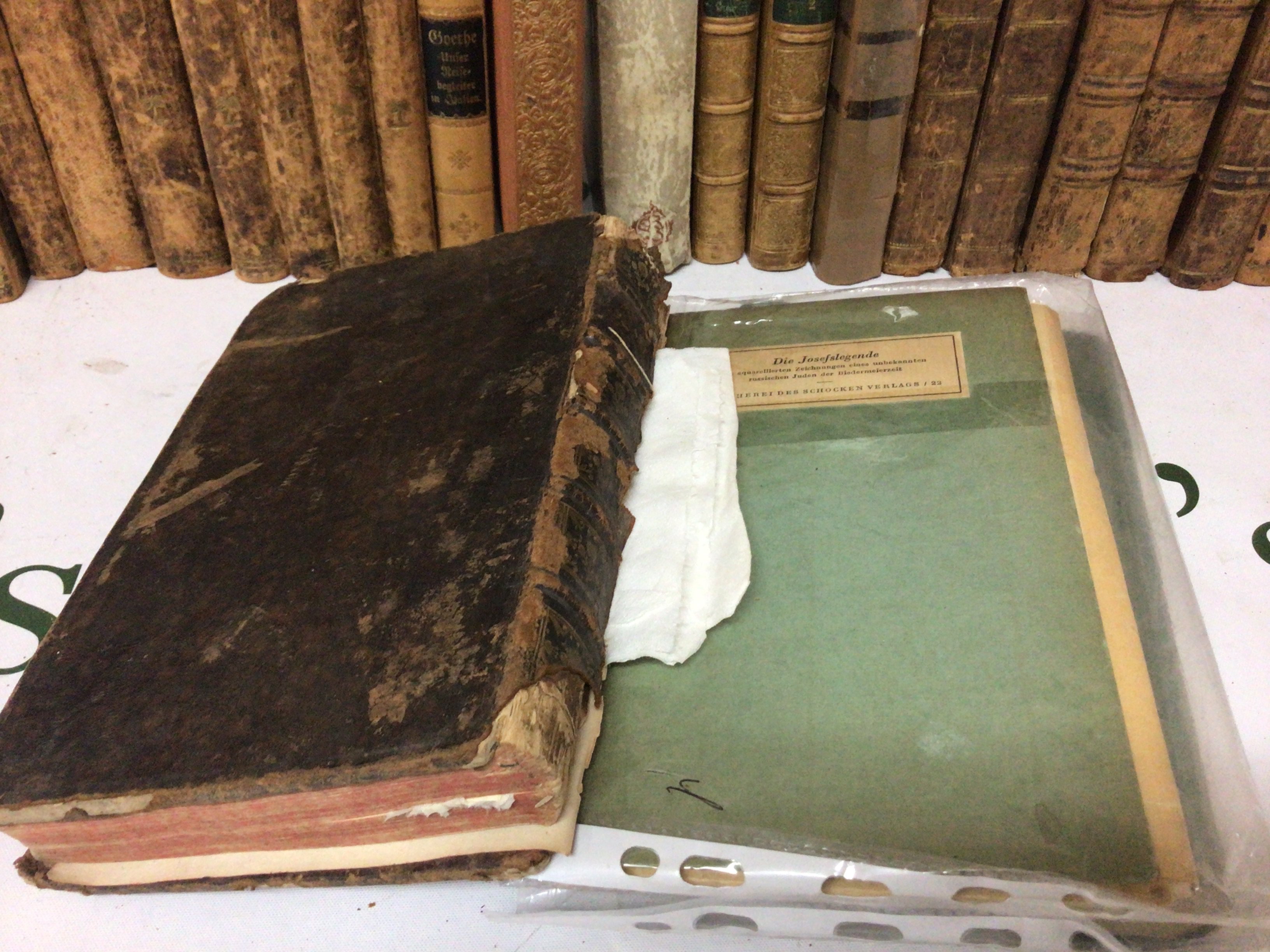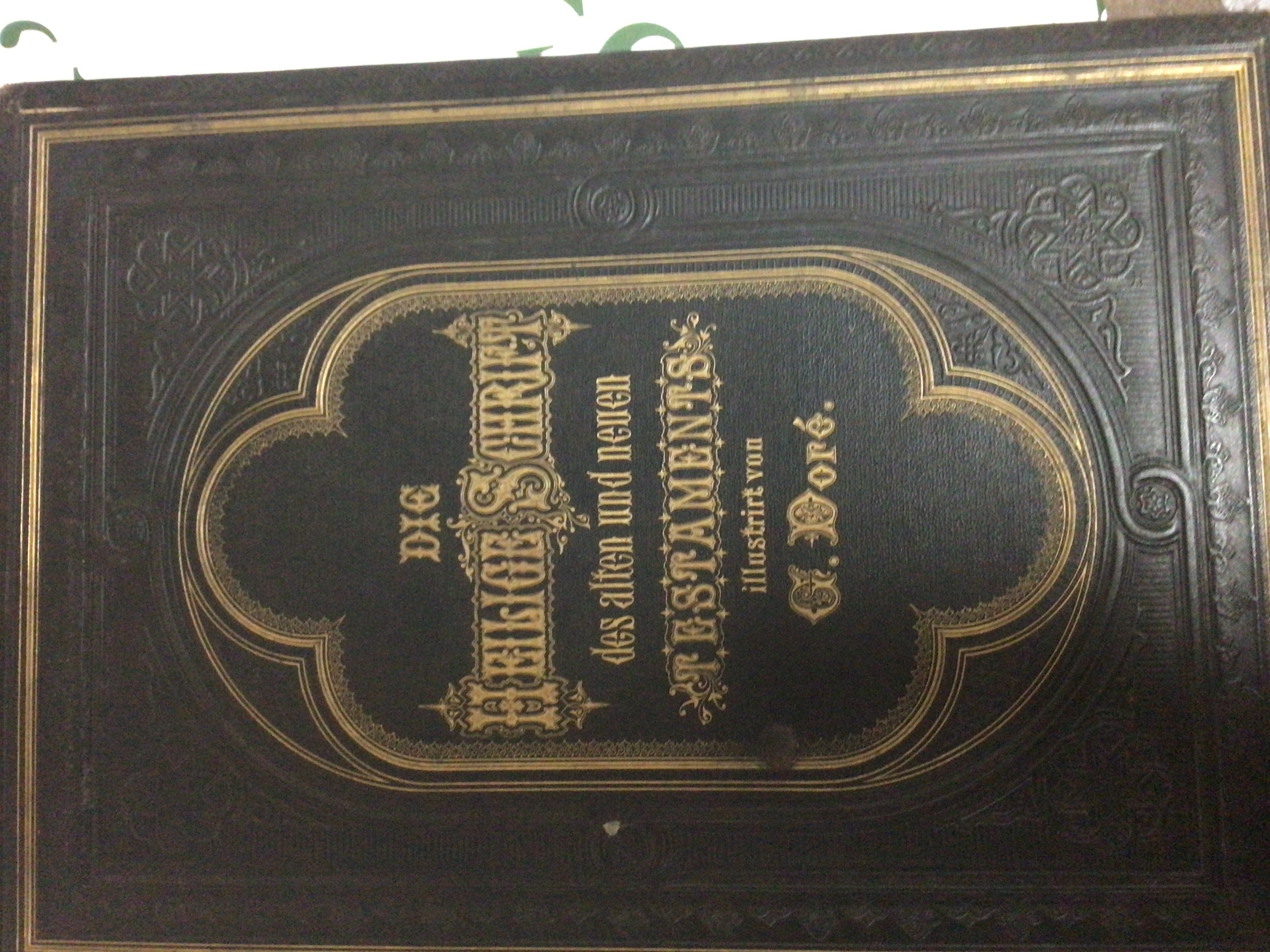 A collection of leather bound and half leather books early 19th century and later and a large illustrated antique bible.