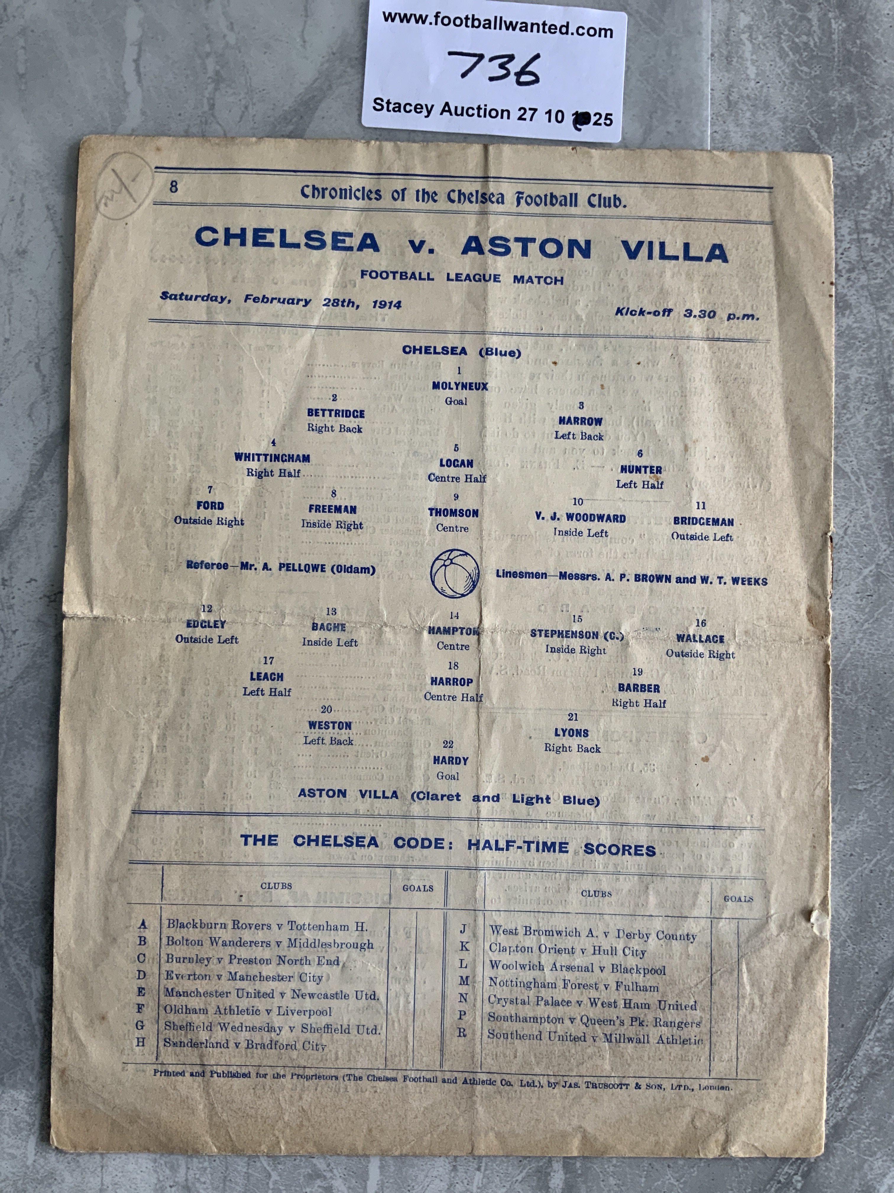 1913 - 1914 Chelsea v Aston Villa Football Programme: First team league match just pre 1st World War. Fair condition 8 pager with no team changes. Splitting to spine and tear to centre fold.