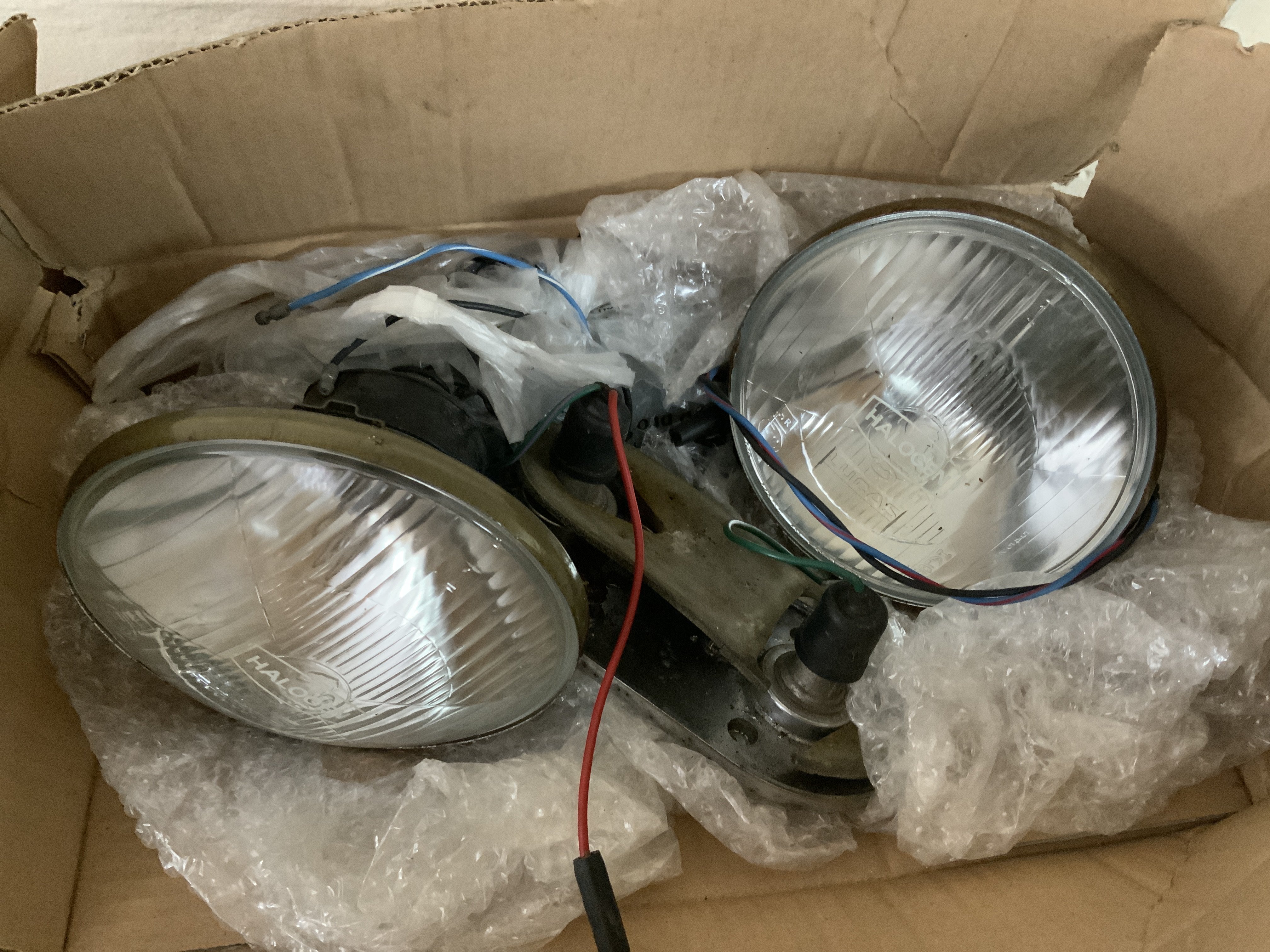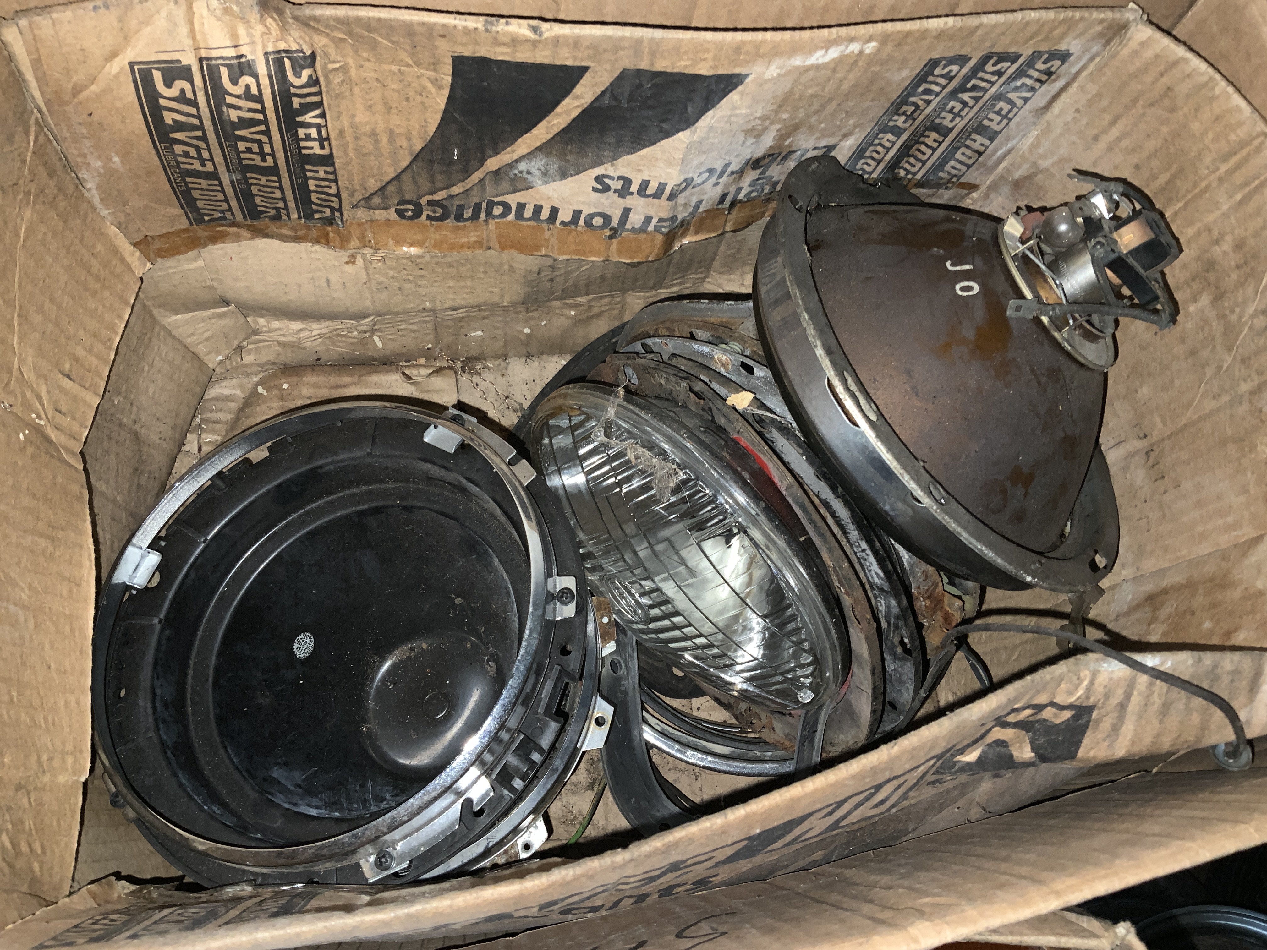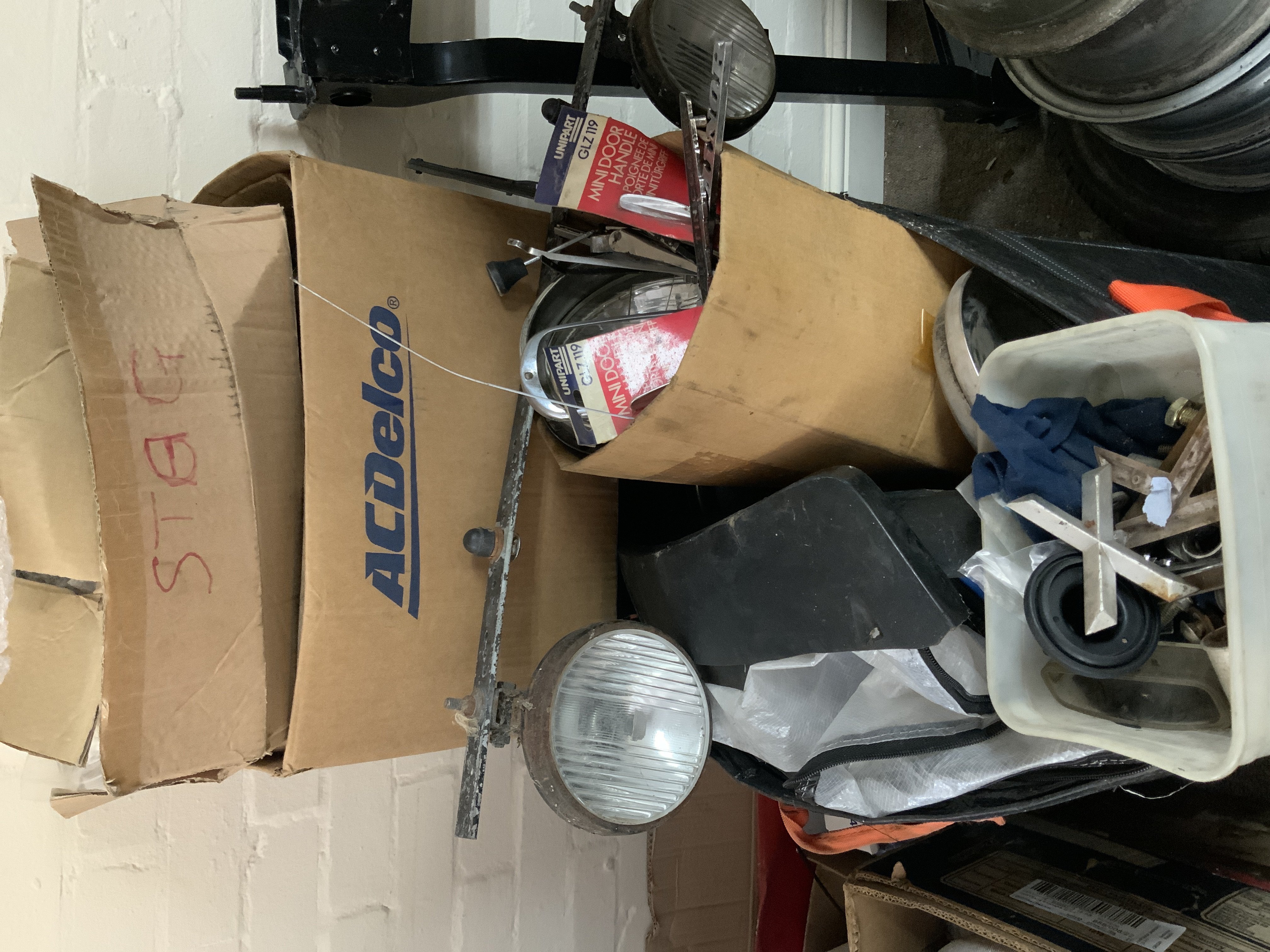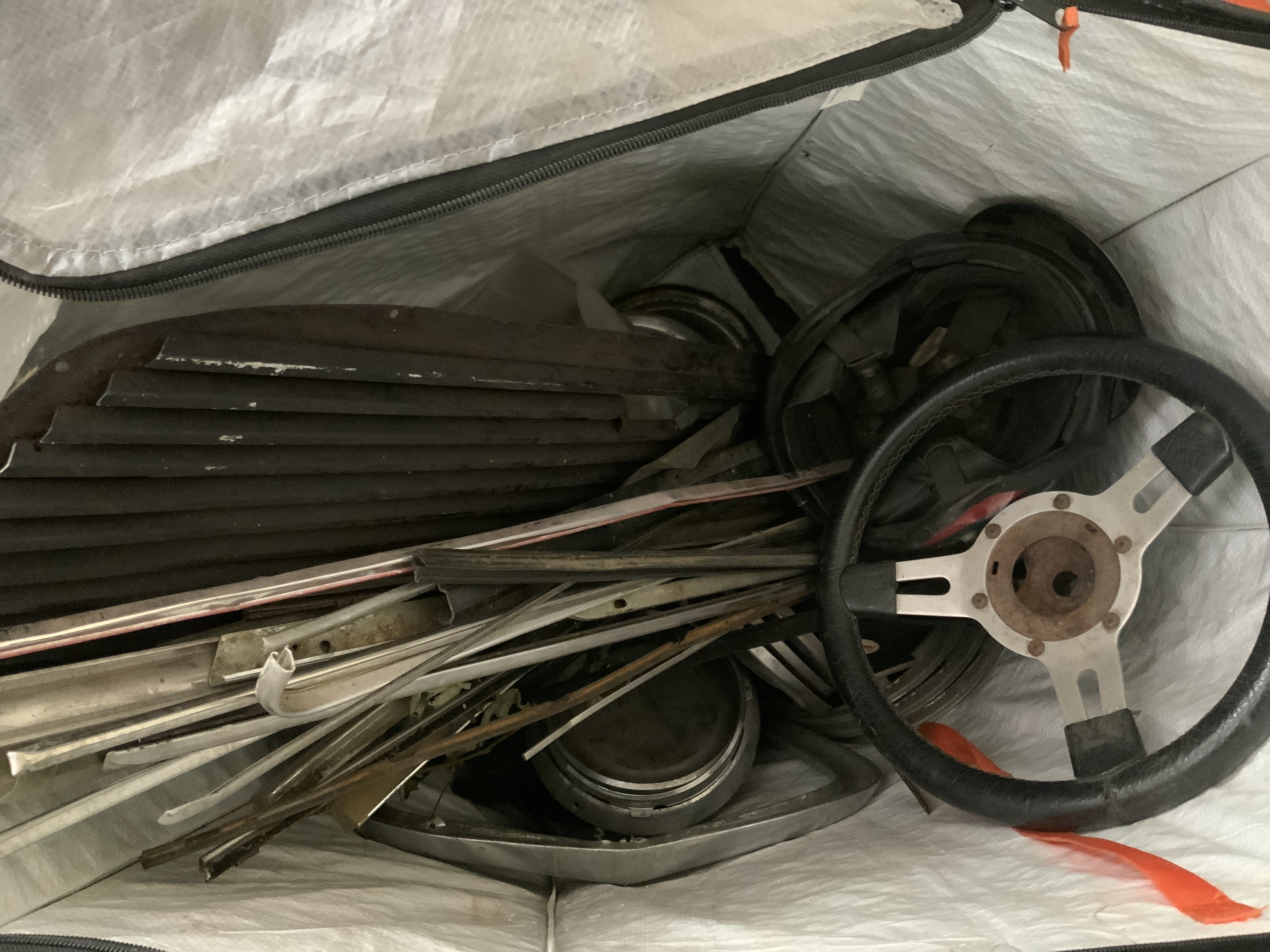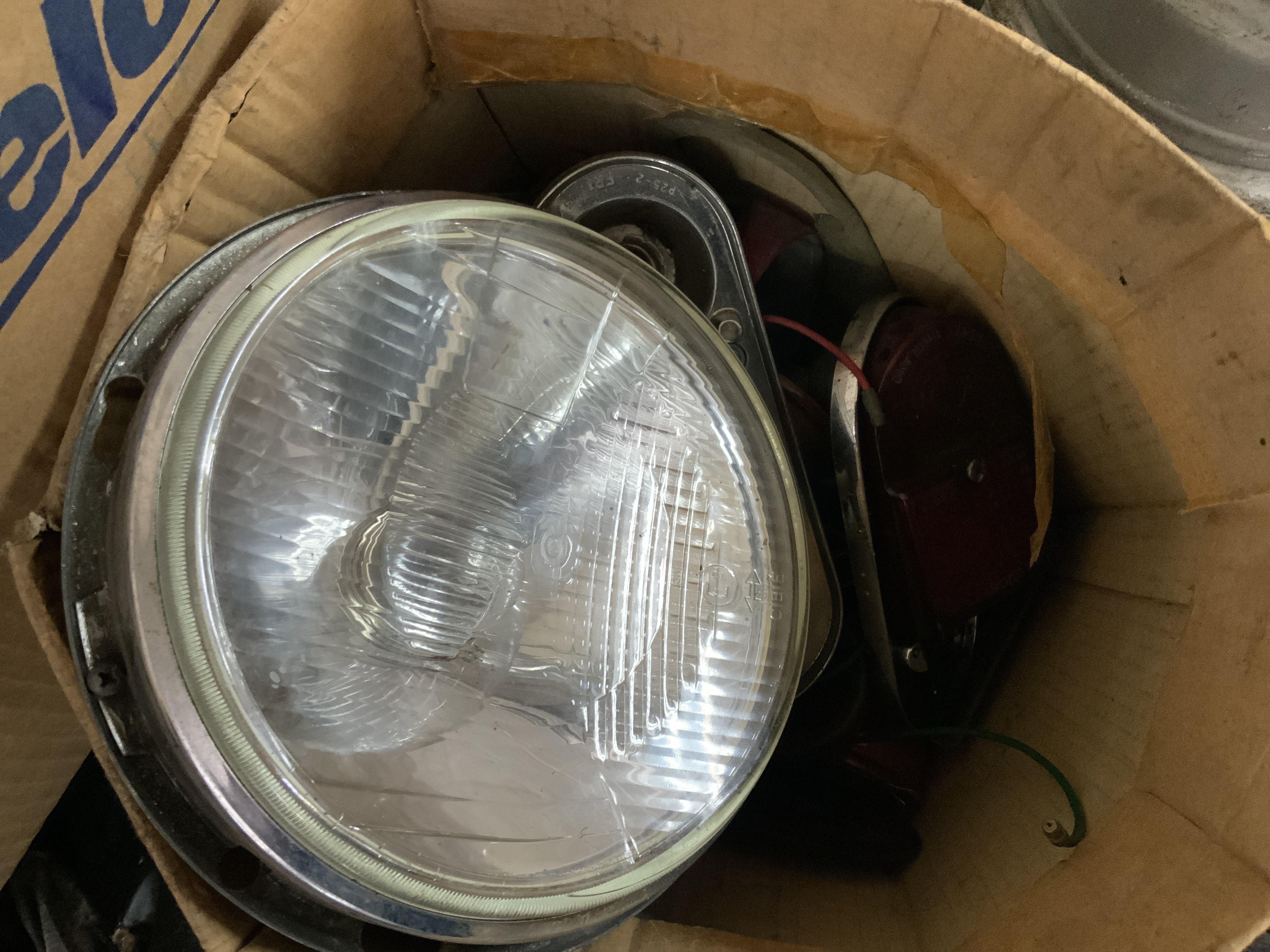 Vintage Mini Cooper parts. A large collection of chrome light mounts, Lights, chrome trims, and other body accessories.