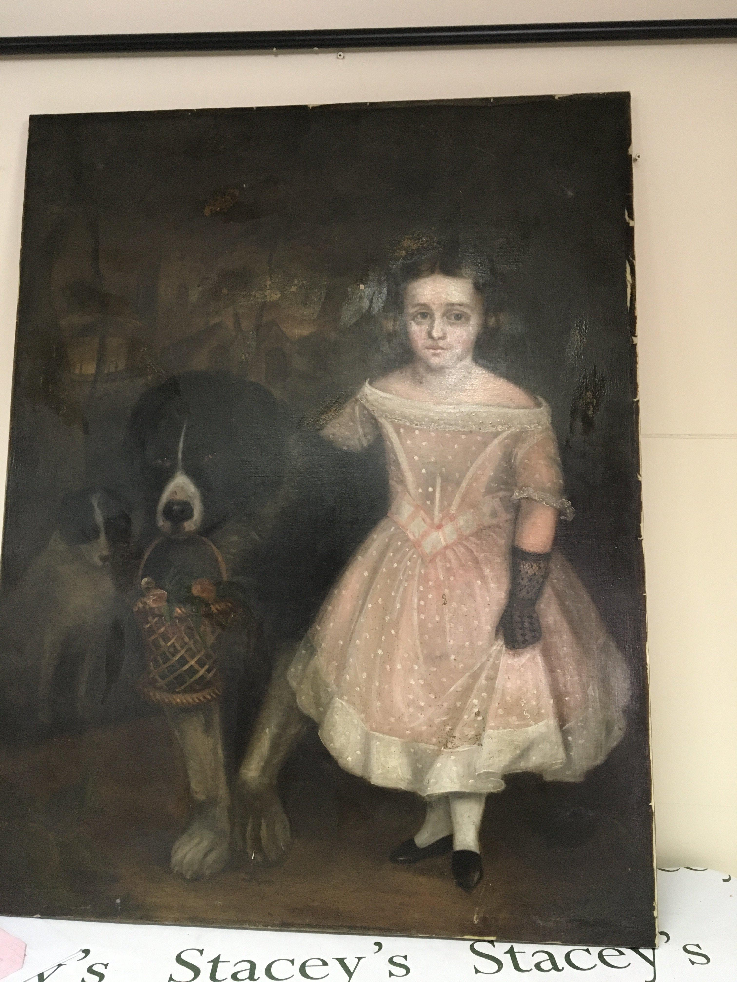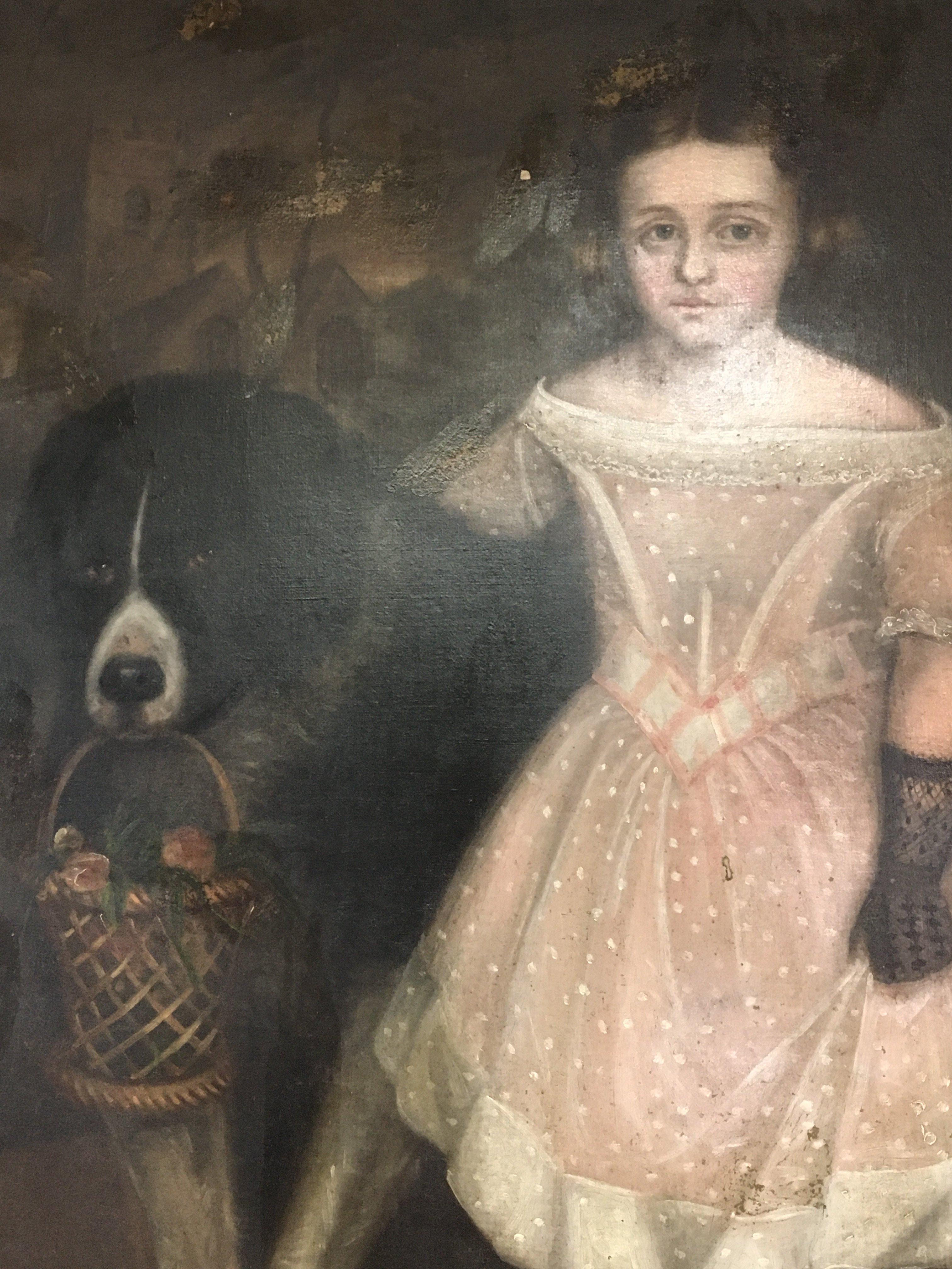 An Early Symbolic Victorian oil painting study of a young girl with Burmese Mountain dog carrying a basket of flowers with other dogs and a church building beyond. Unsigned and unattributed.