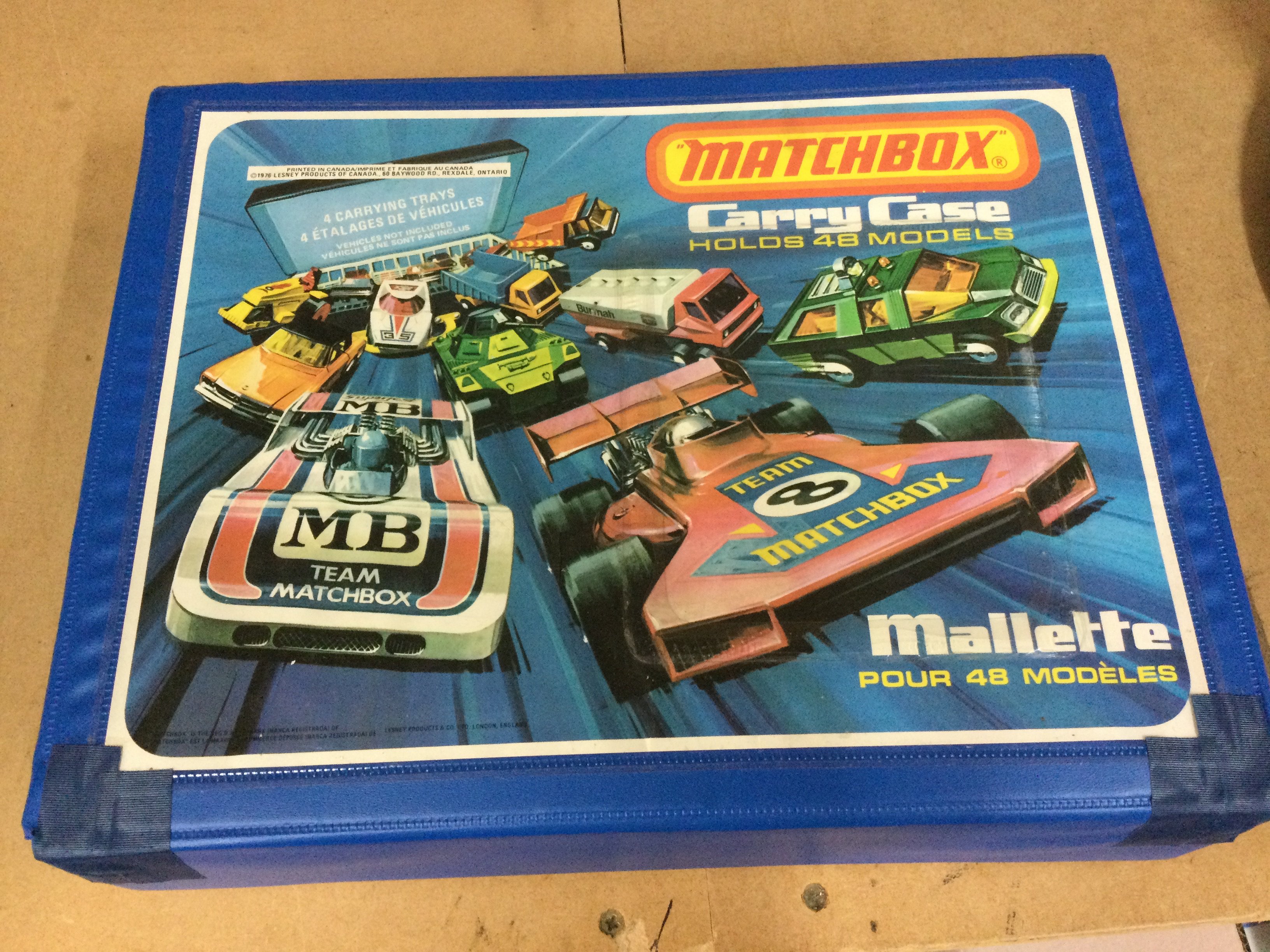 Matchbox carrying case containing various model cars .