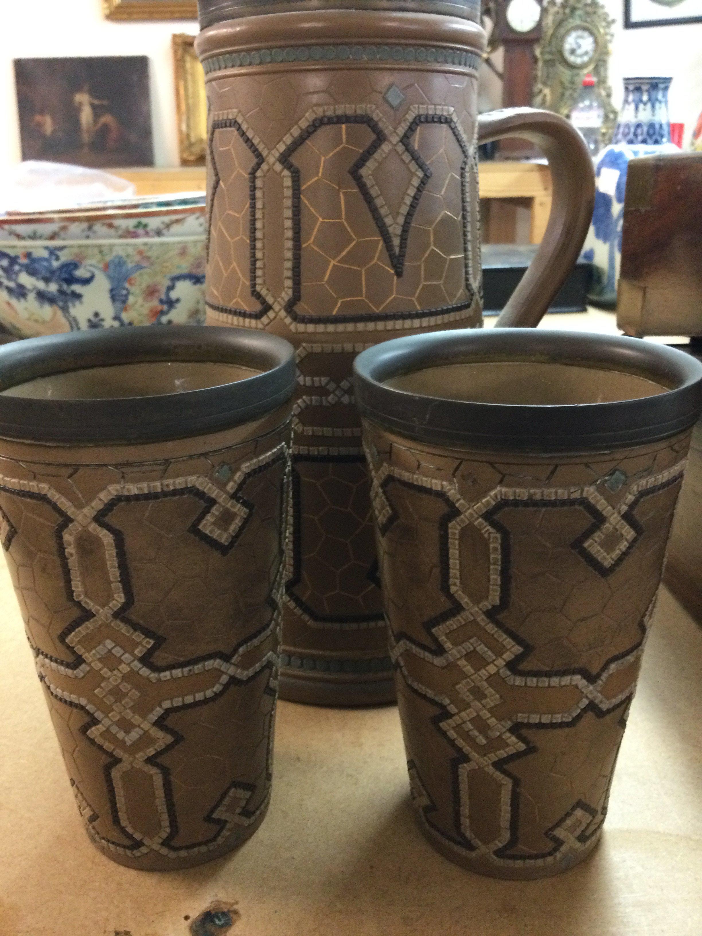 A Doulton jug with a silver plated rim and a pair of matching beakers .