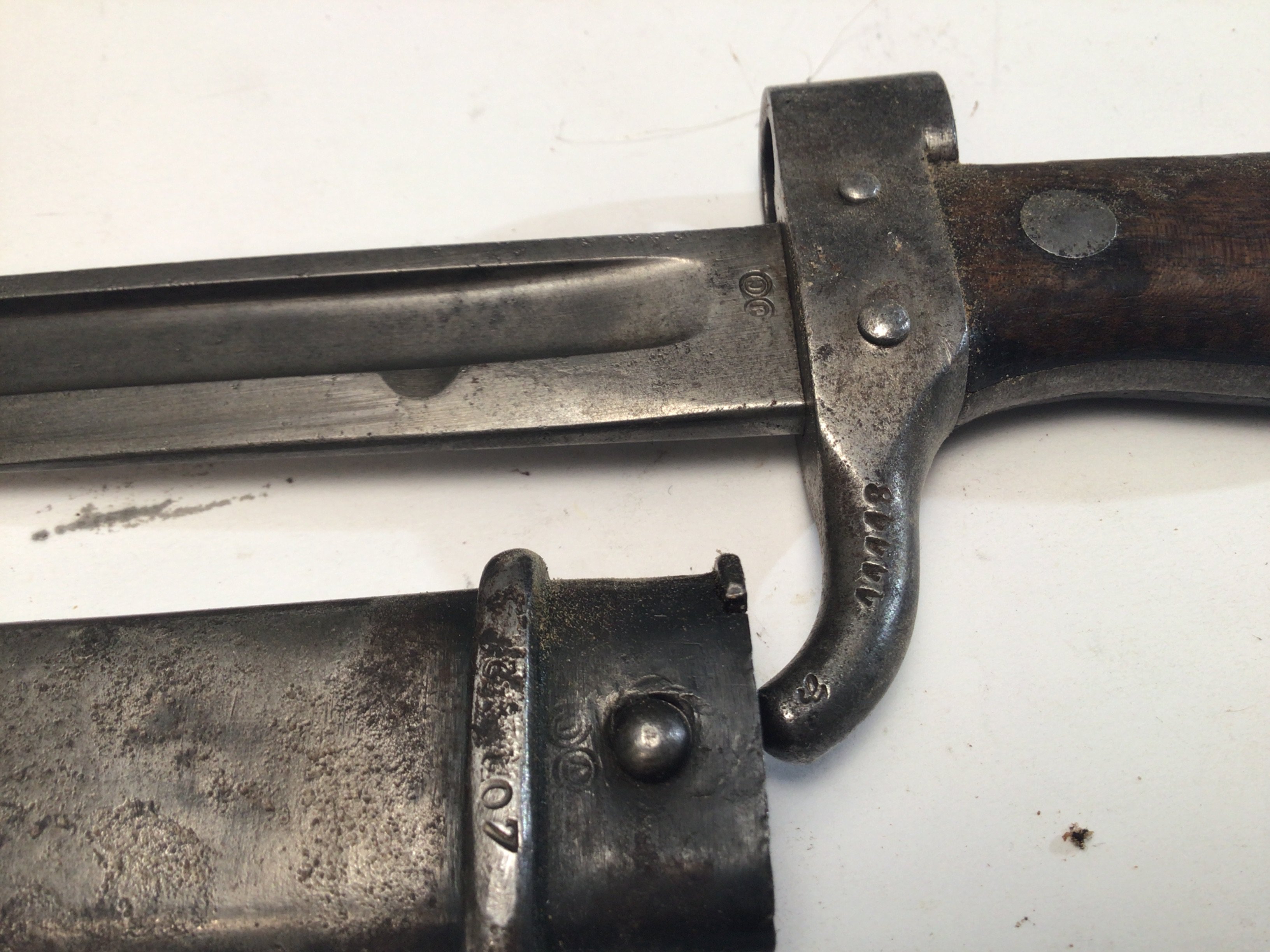 A French 1880 pattern bayonet with a wood grip steel scabbard blade and quilion with stamped marks.