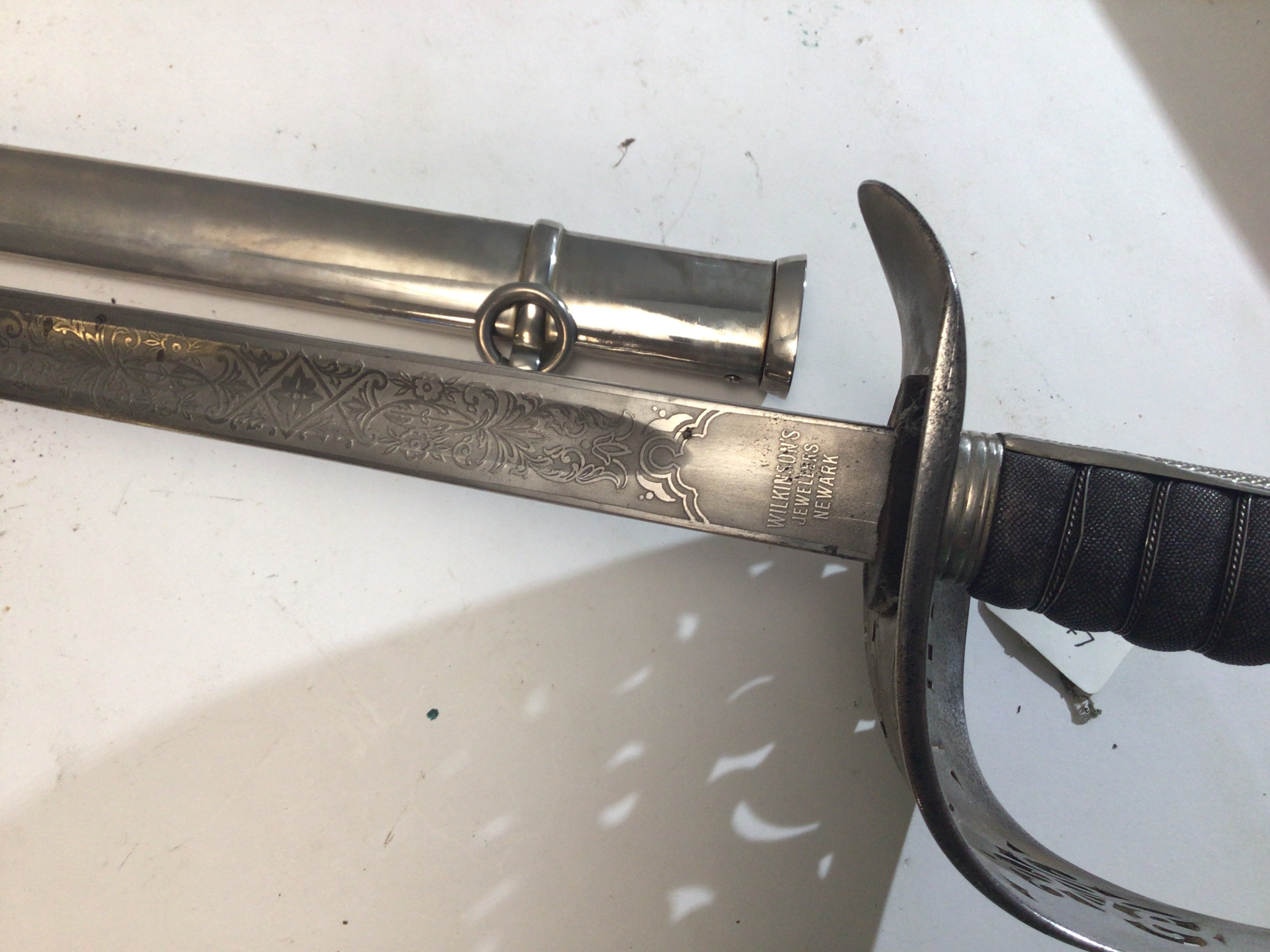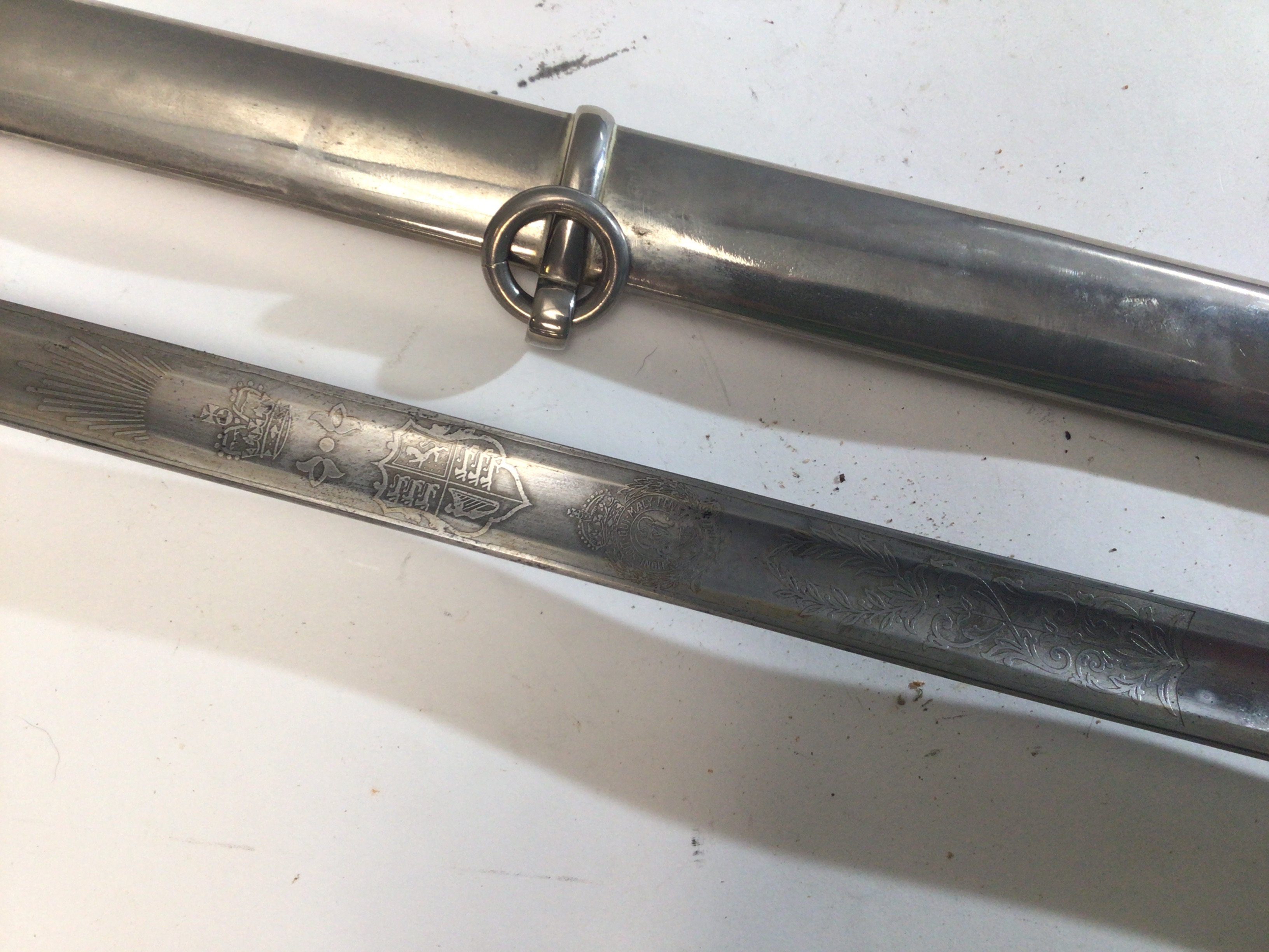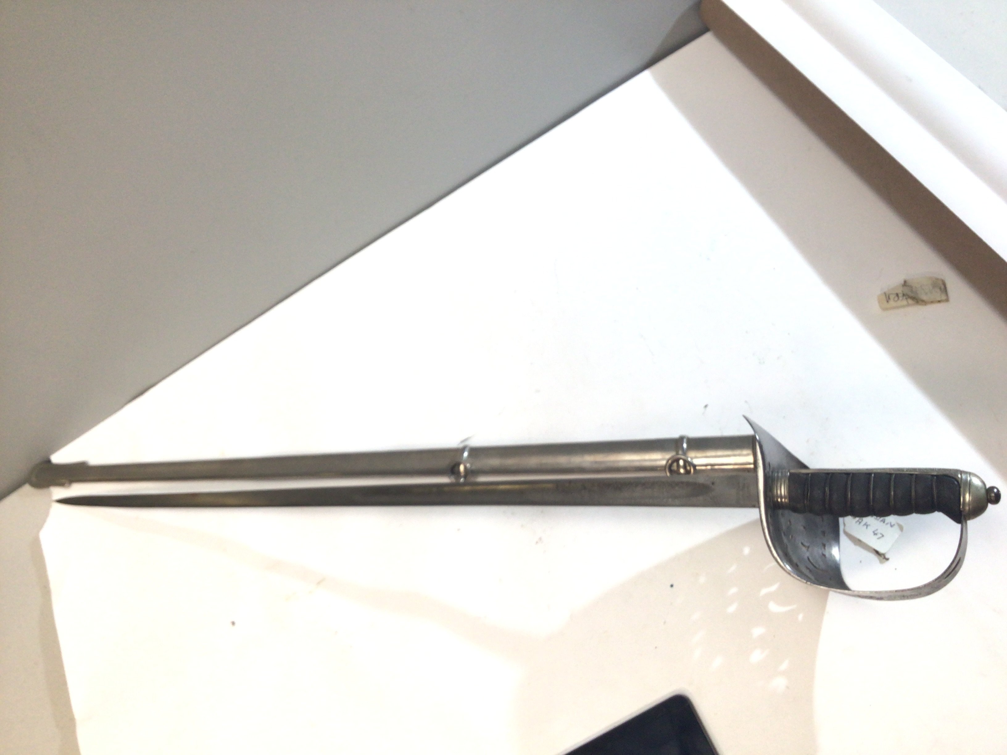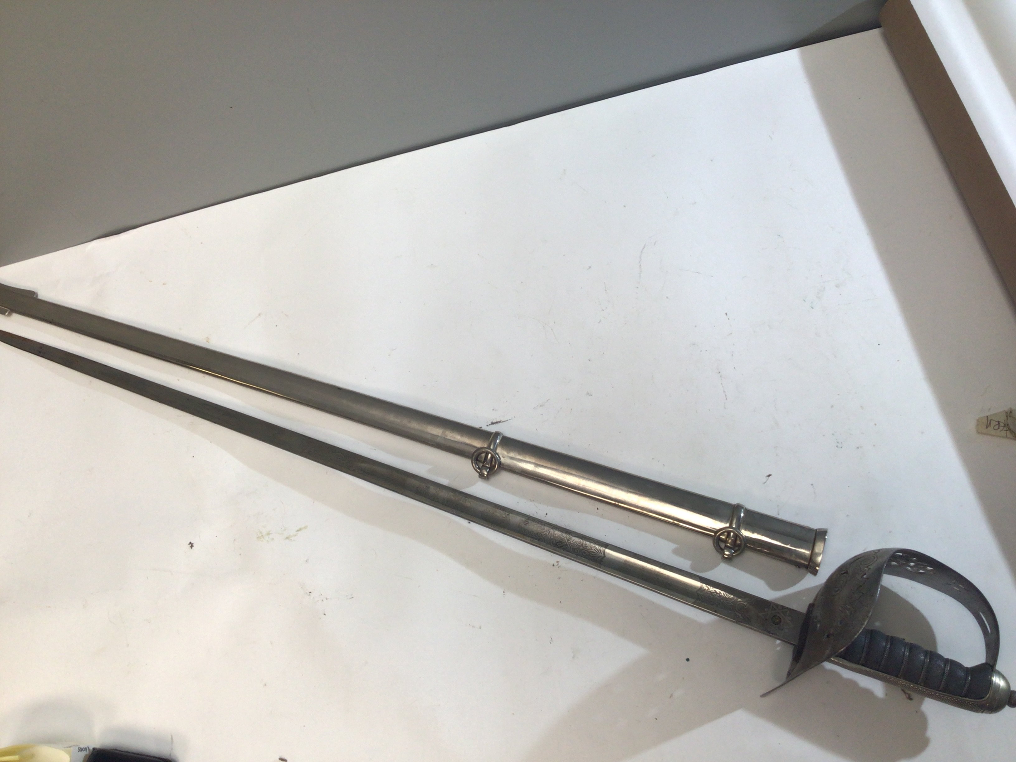 A George V British Military officers sword made by Wilkinson Newark the etched blade with badge and Coats of Arms. Metal scabbed.