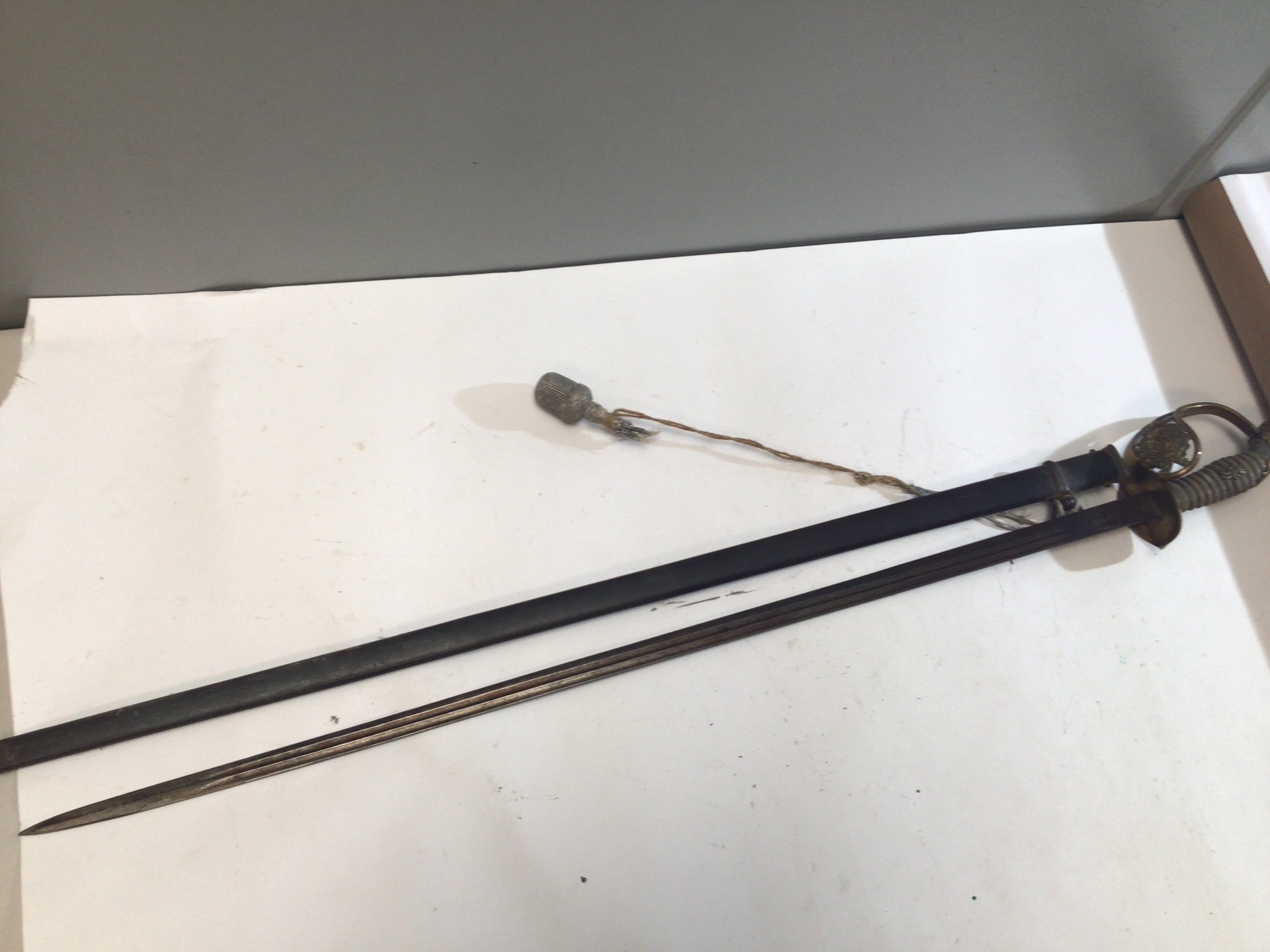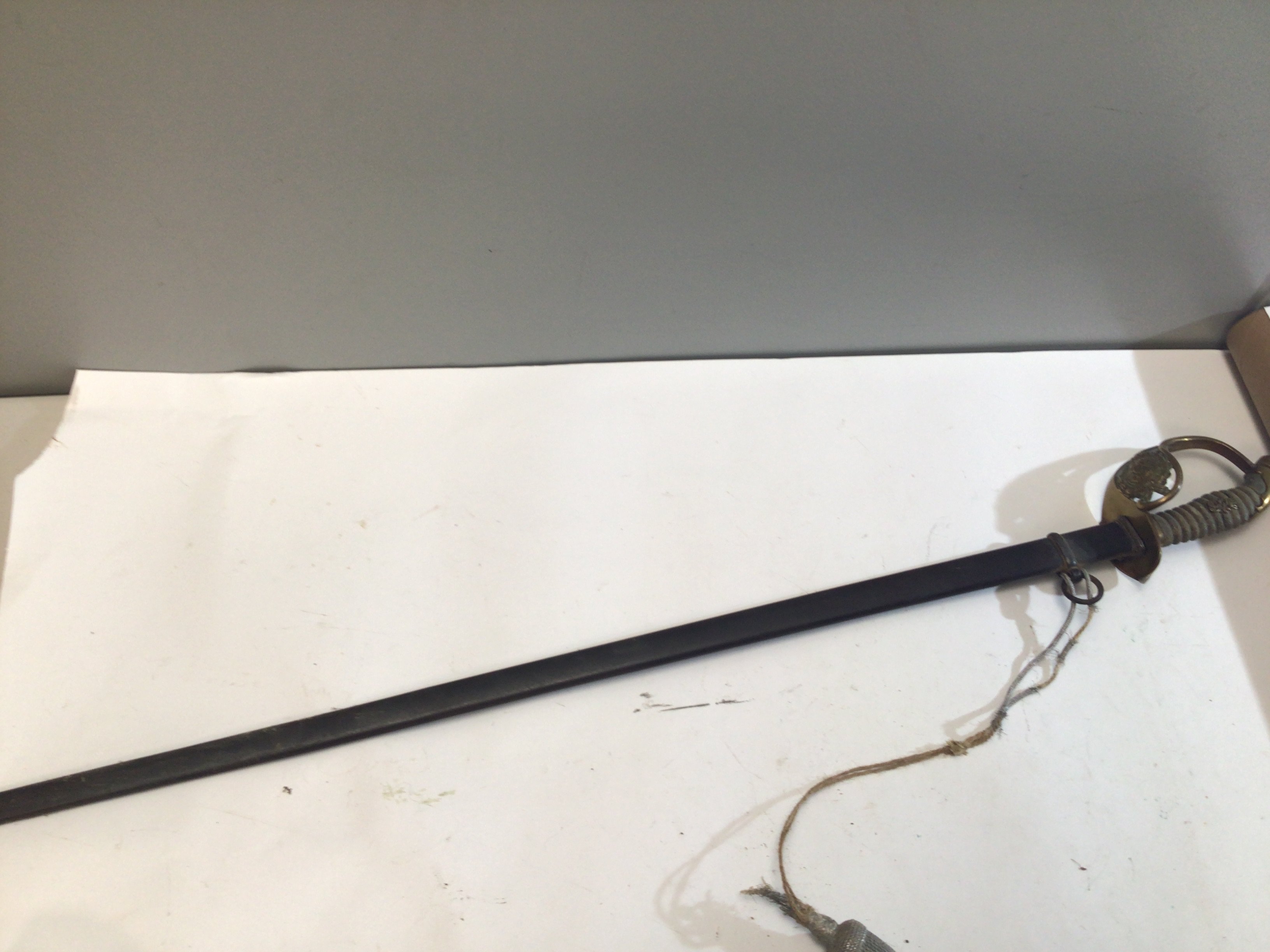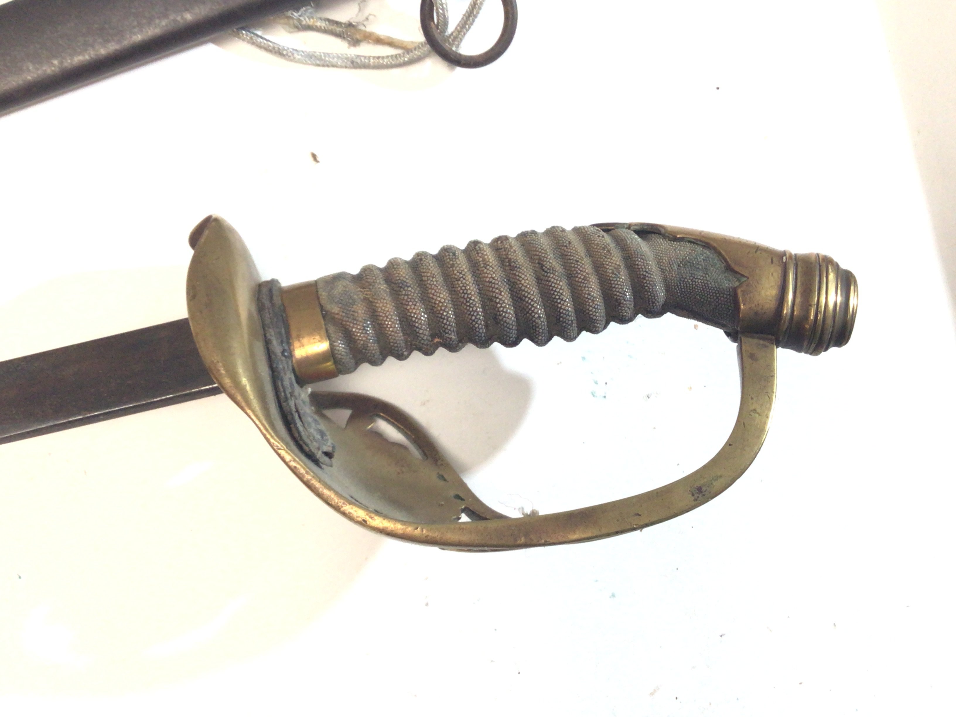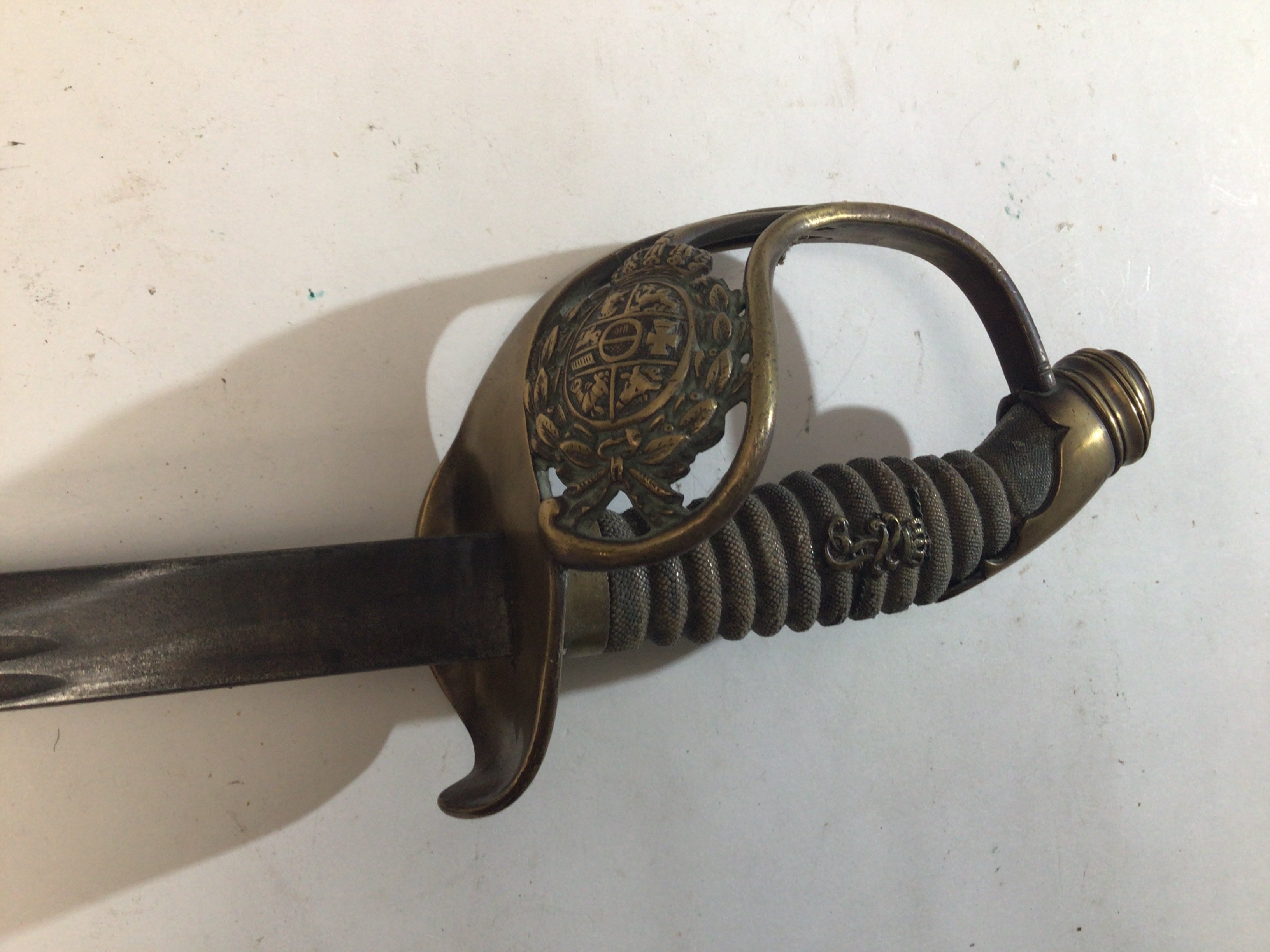 A German Imperial officers sword 1889 pattern the shagreen grip with applied lettering the brass Guard with a crest within a Laurel leaf.