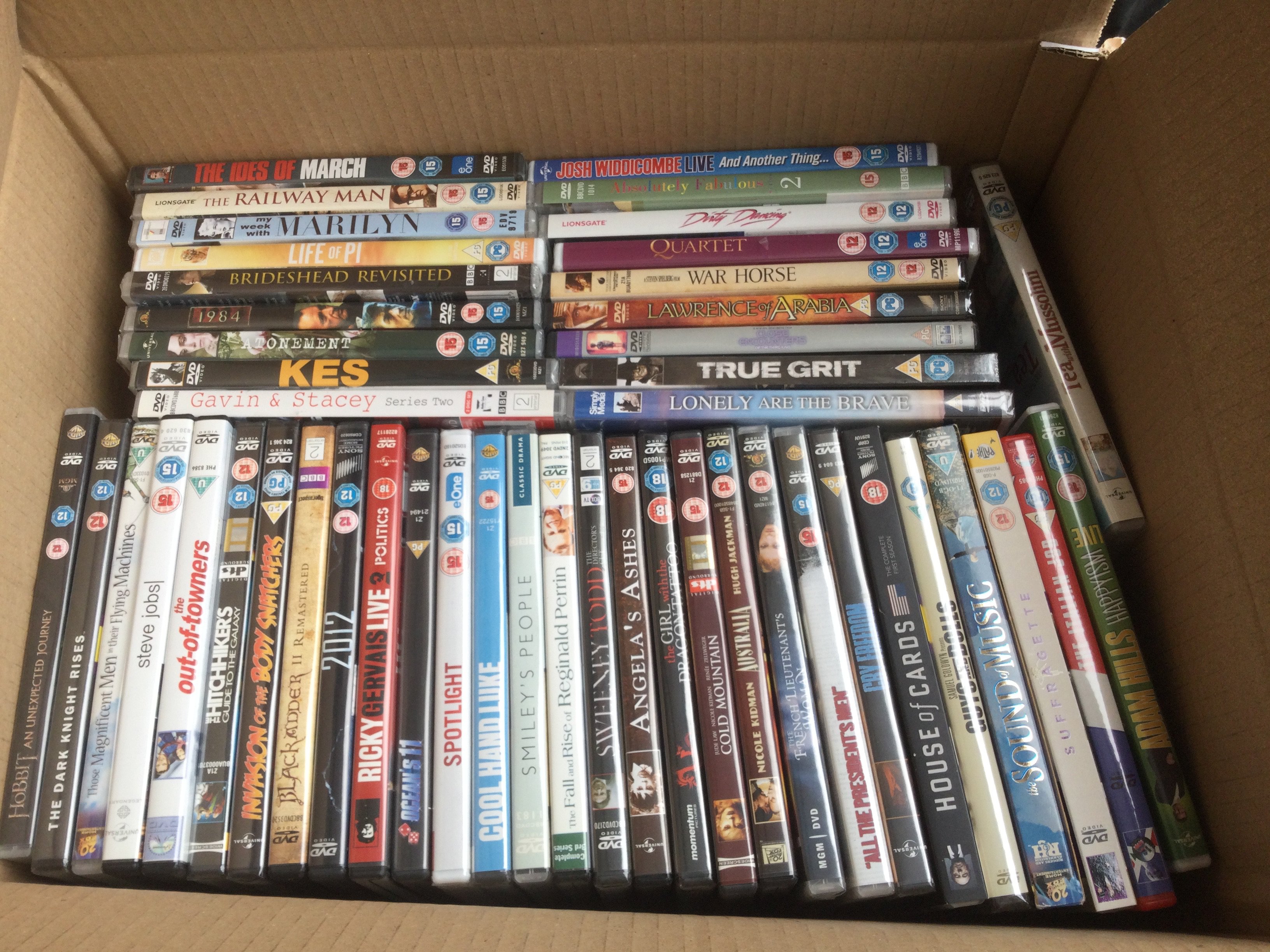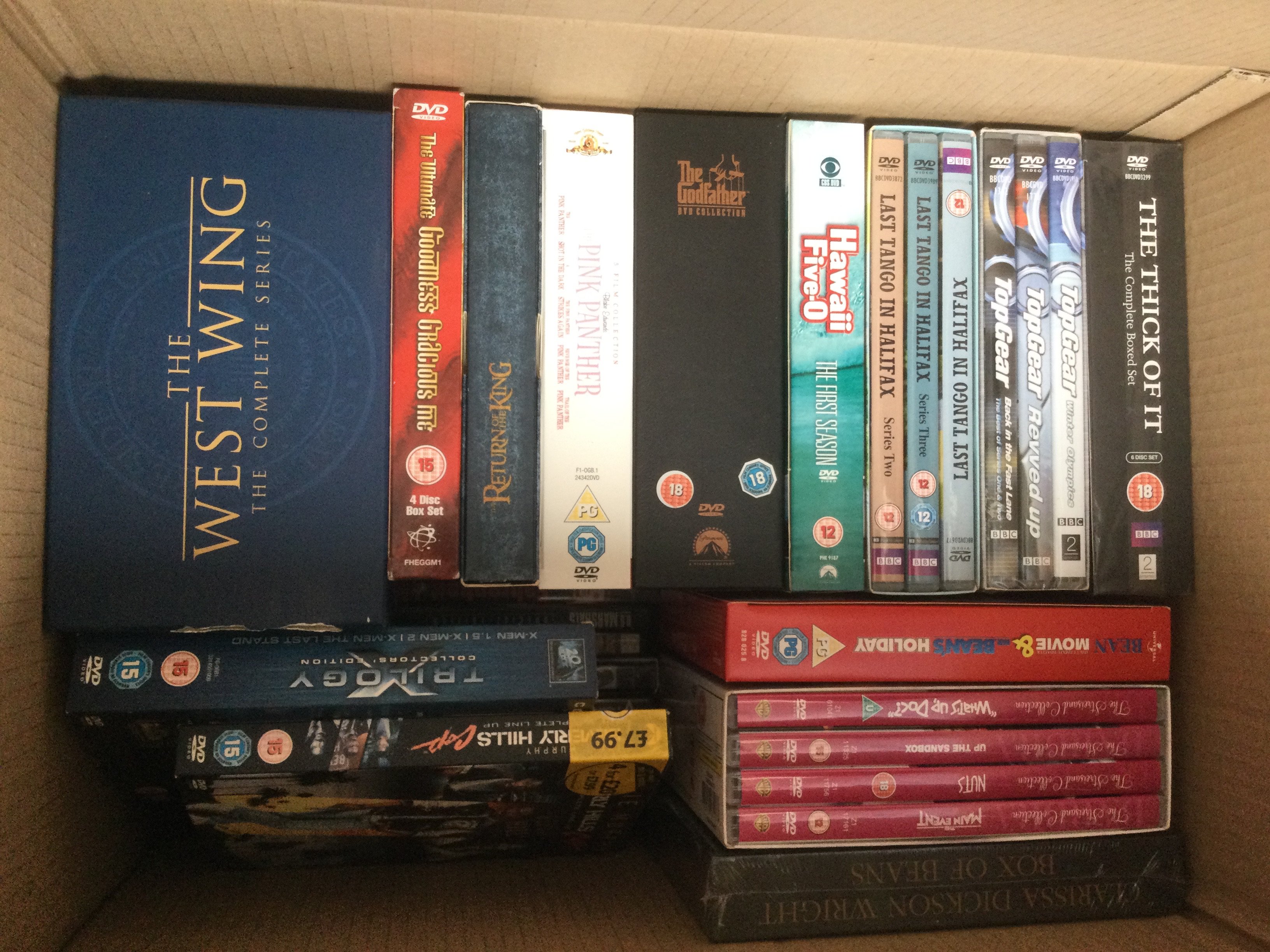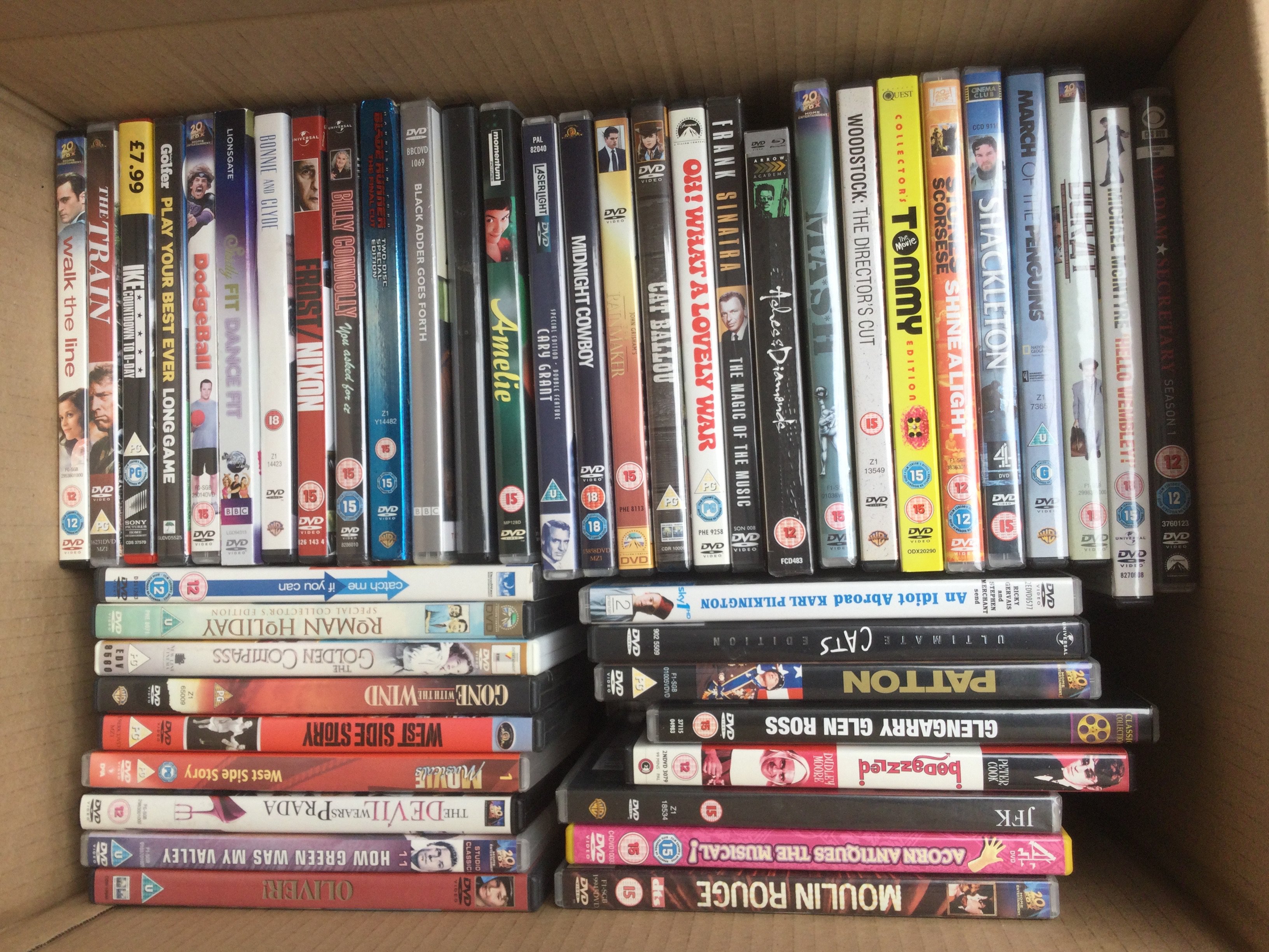 Four boxes of BluRays, DVDs and CDs.