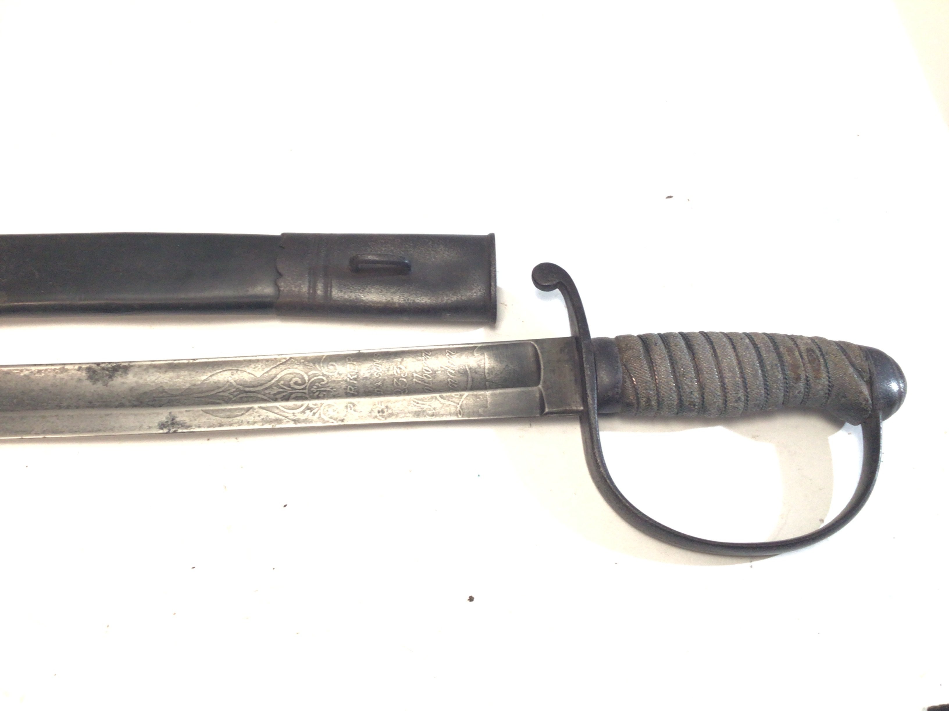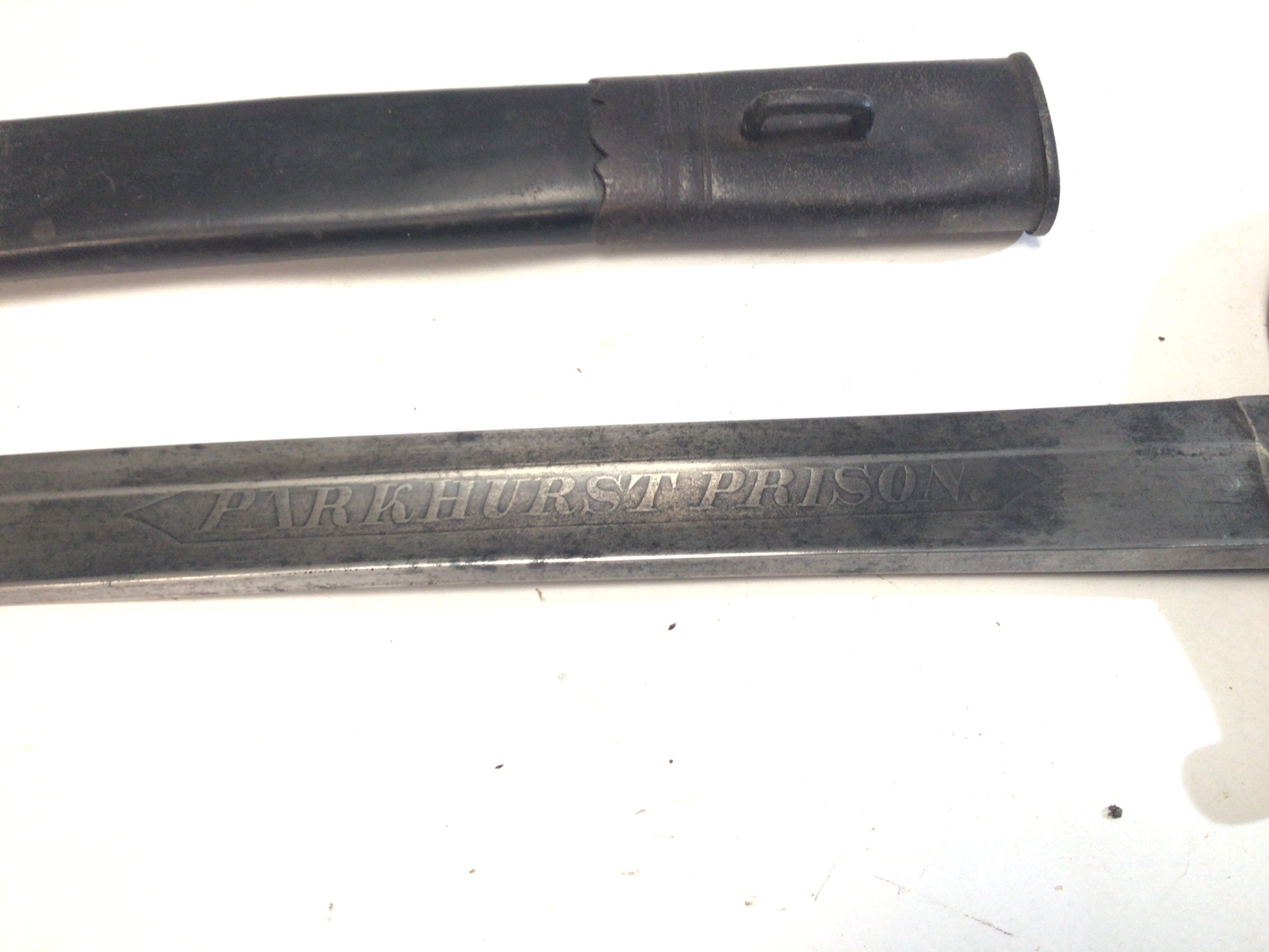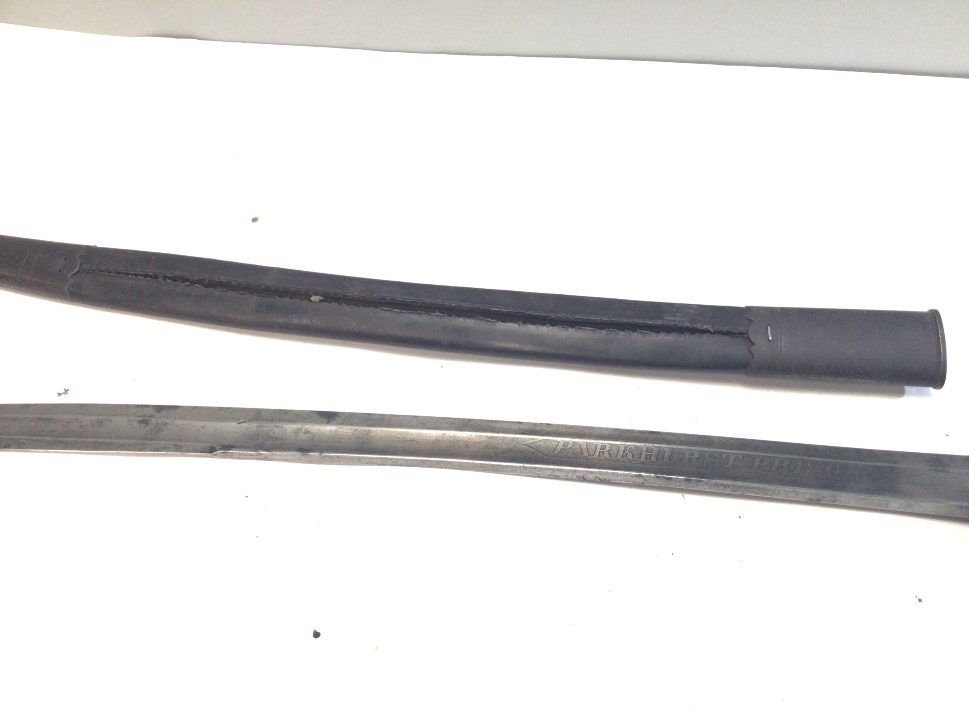 A rare Victorian Prison officers Sword Parkhurst Prison the sword with a wired shagreen grip the steel blade with maker P Parker & Son 233 Holborn.the leather scabbard needs stitching