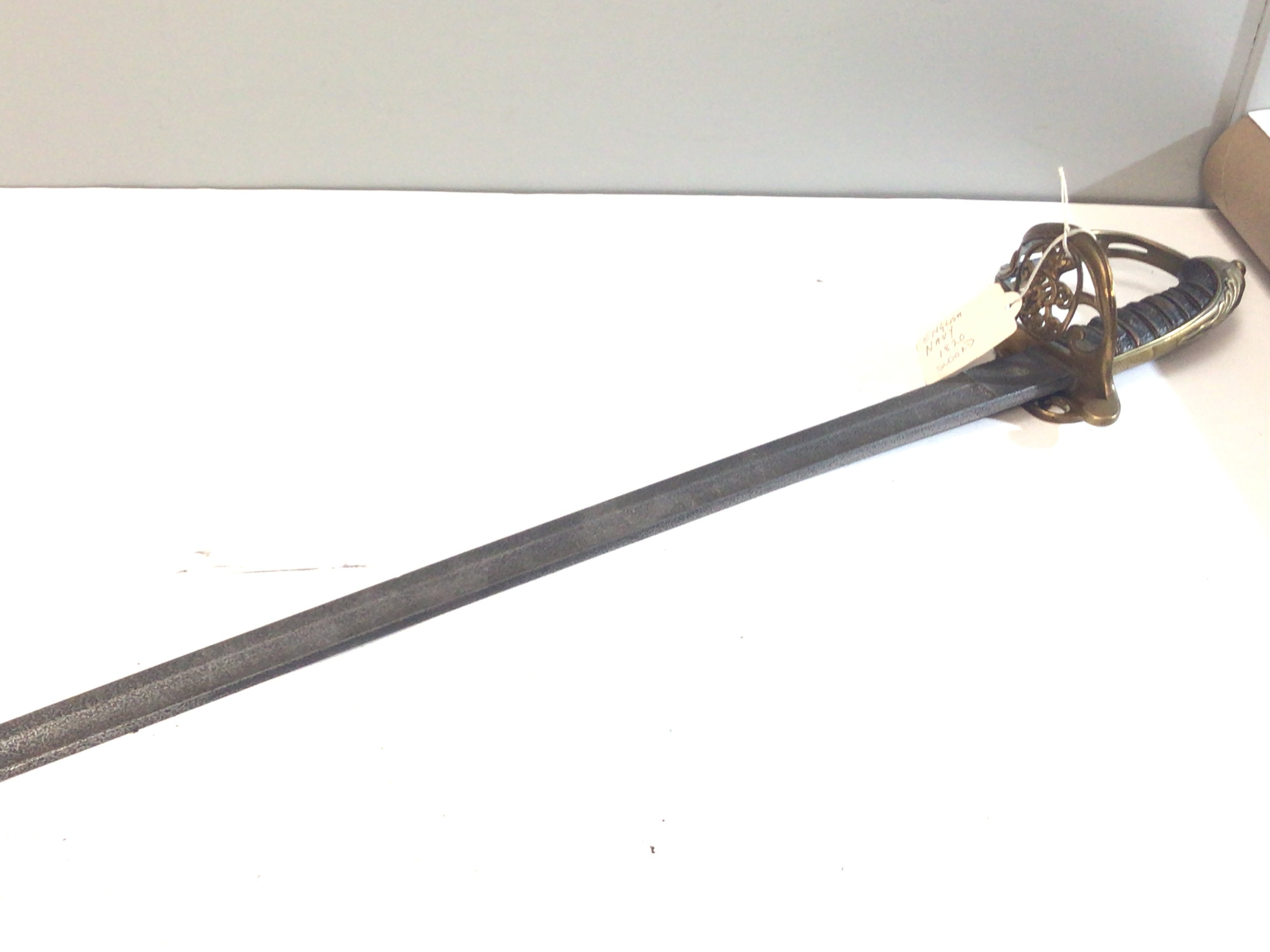 A Victorian British Navy officers sword the brass hinged Guard with Victorian Royal Cypher steel blade with small inset possible makers mark no scabbard.