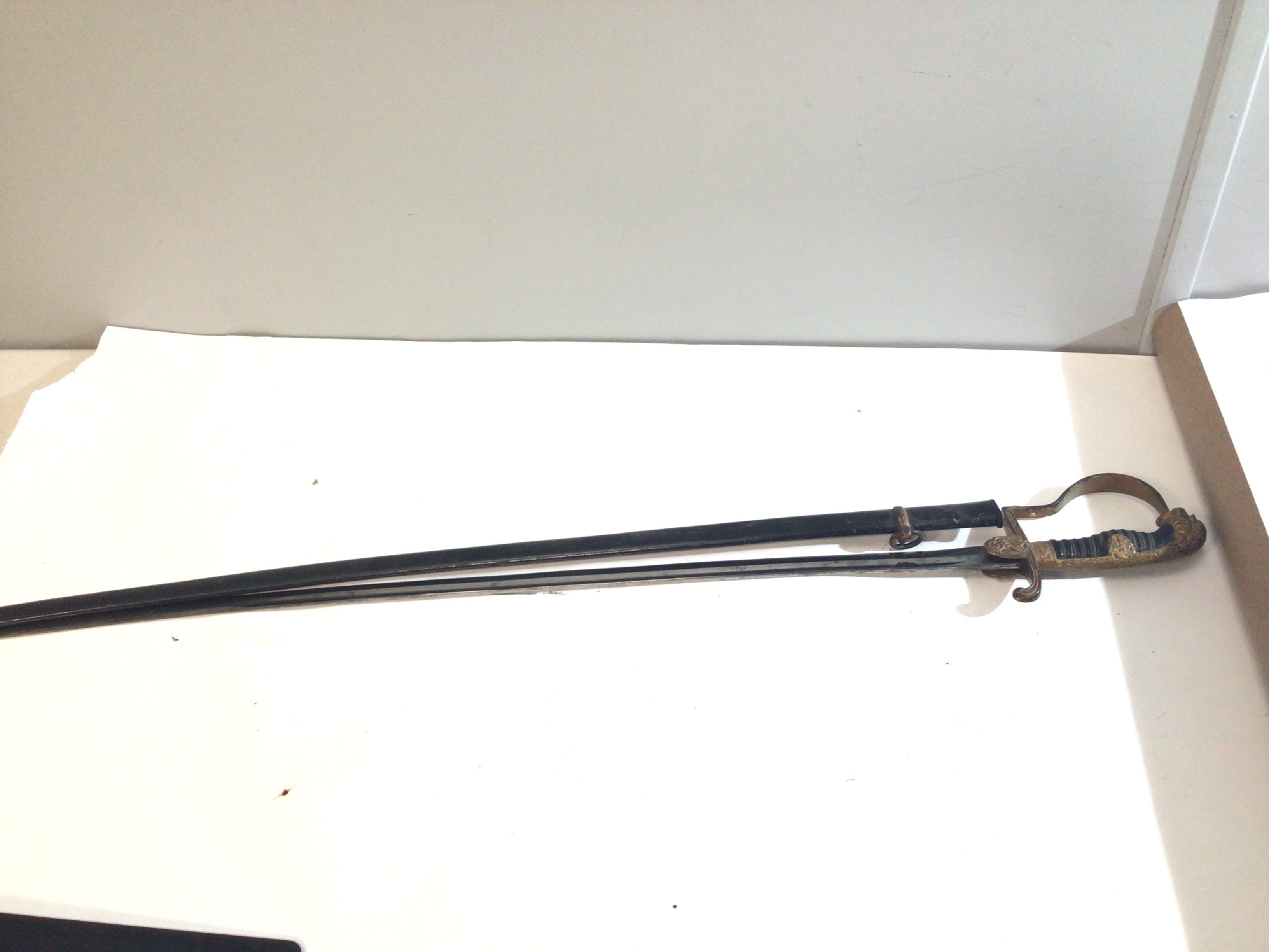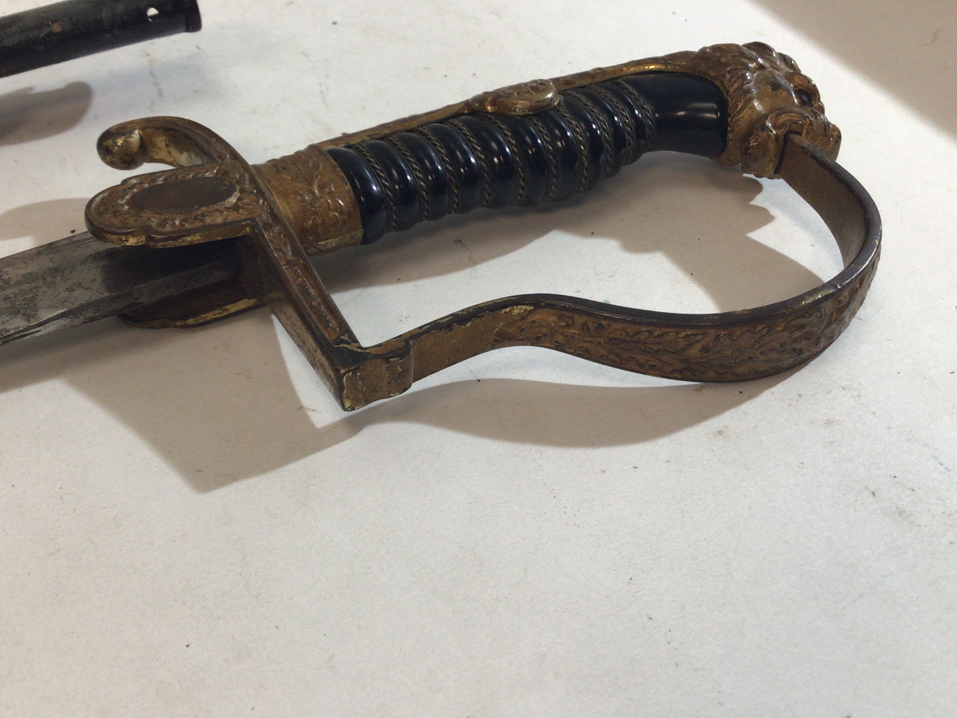 A German Third Reich Military officers dress sword with lion head pommel with red stone eyes with apllied gilt finish the steel blade with maker stamp a nice example with wear in keeping with age.