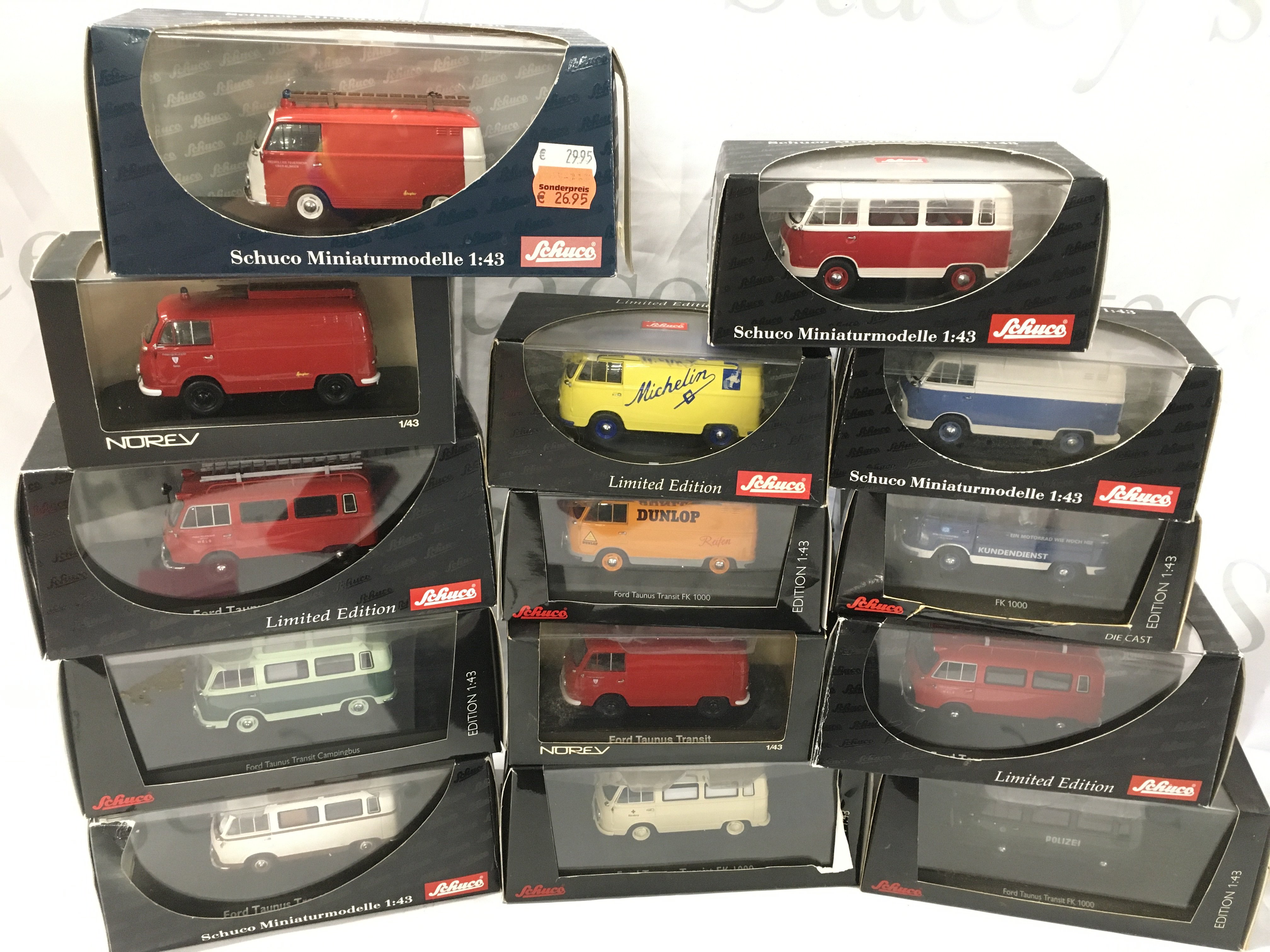 A Collection Of Boxed Schuco And Norev Ford Transit Vans 1/43 Scale.