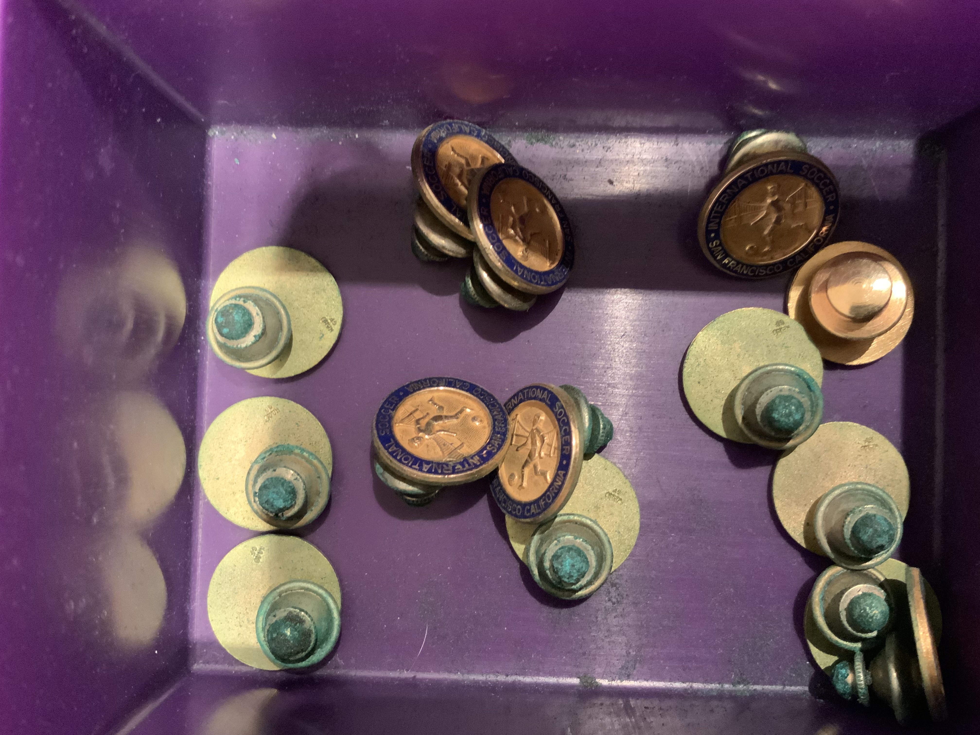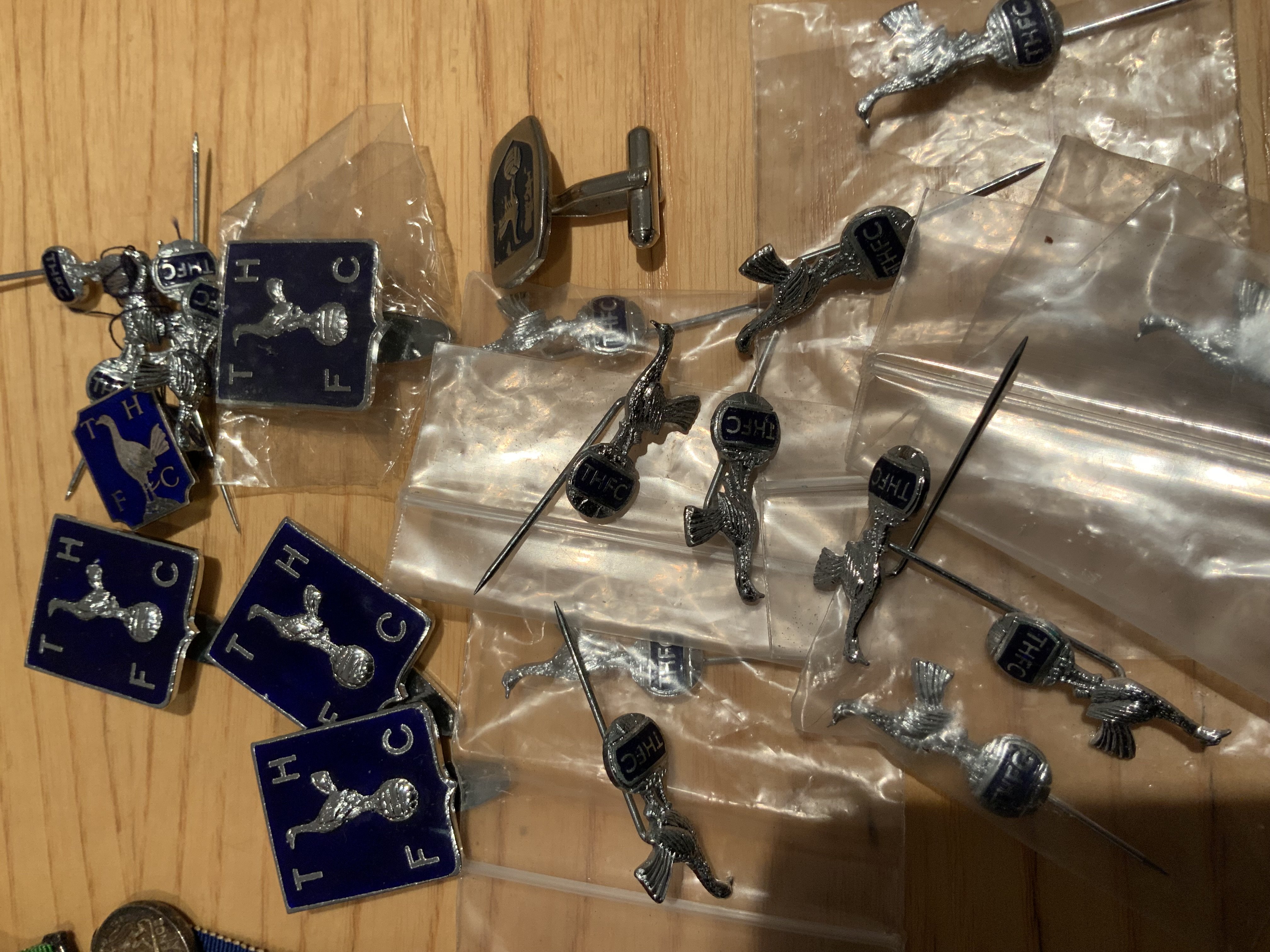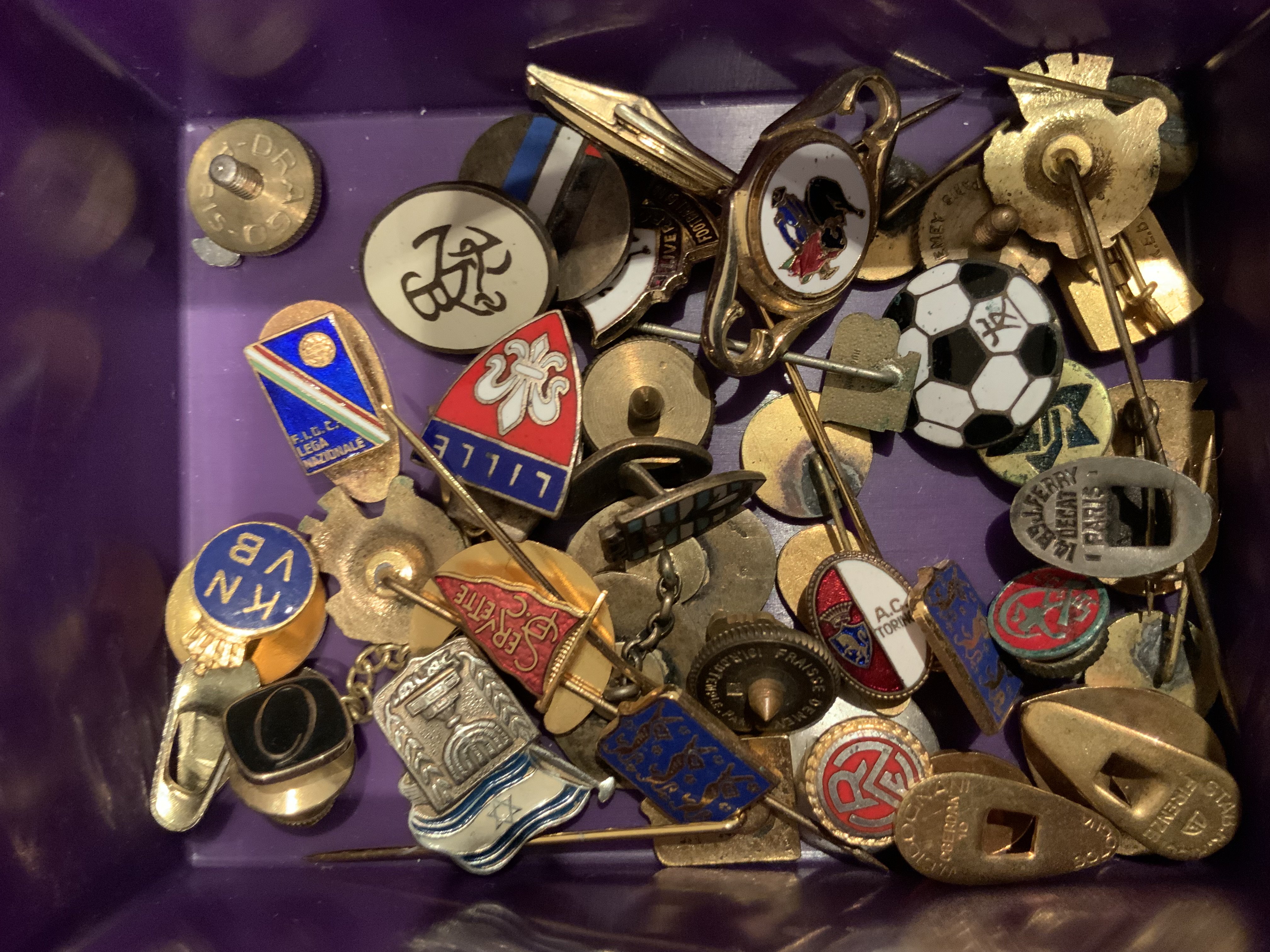 Football Badge Collection: Must view as badges appear old. Lot of Tottenham to include quantity of one style plus lapel badge etc. Quantity of each of the same Hungary and Italy badge plus International Soccer badge San Francisco which could refer to English club tours in the 60s. Possibly Panathinaikos as well in quantity. Spotted in this badge case a madras which states 1899 to 1949 celebrating 50 years of defunct Belgium team Beerschot.