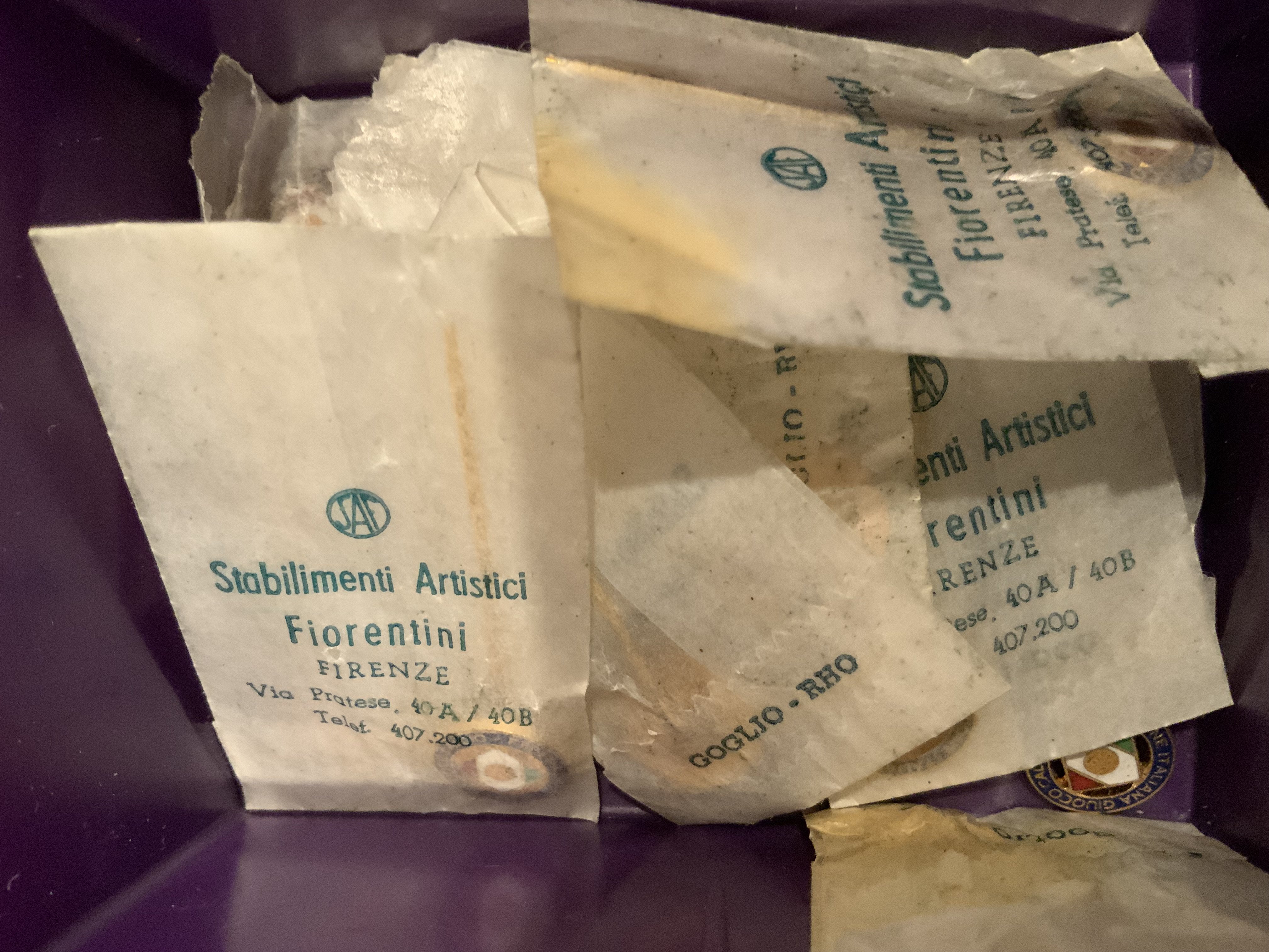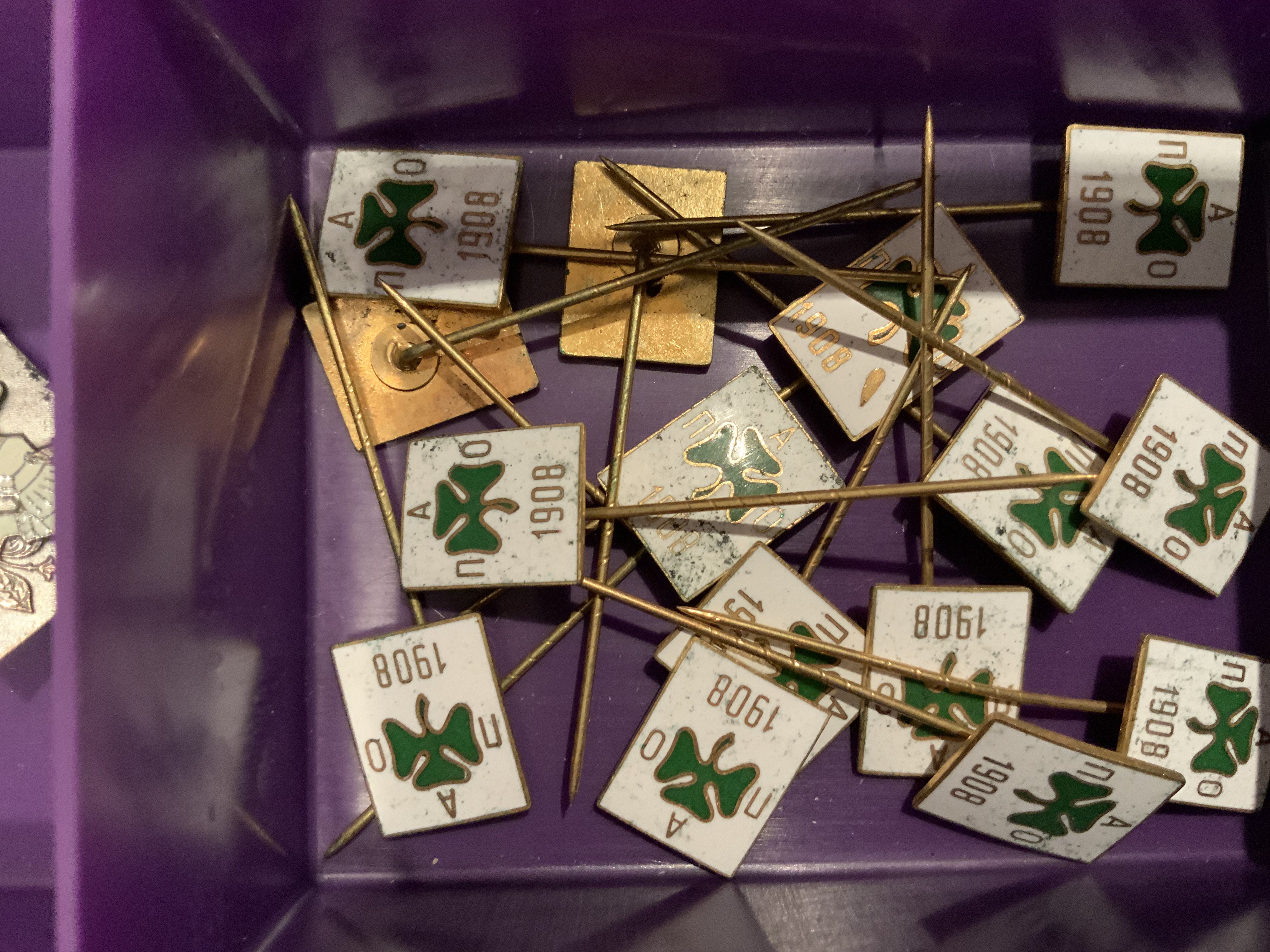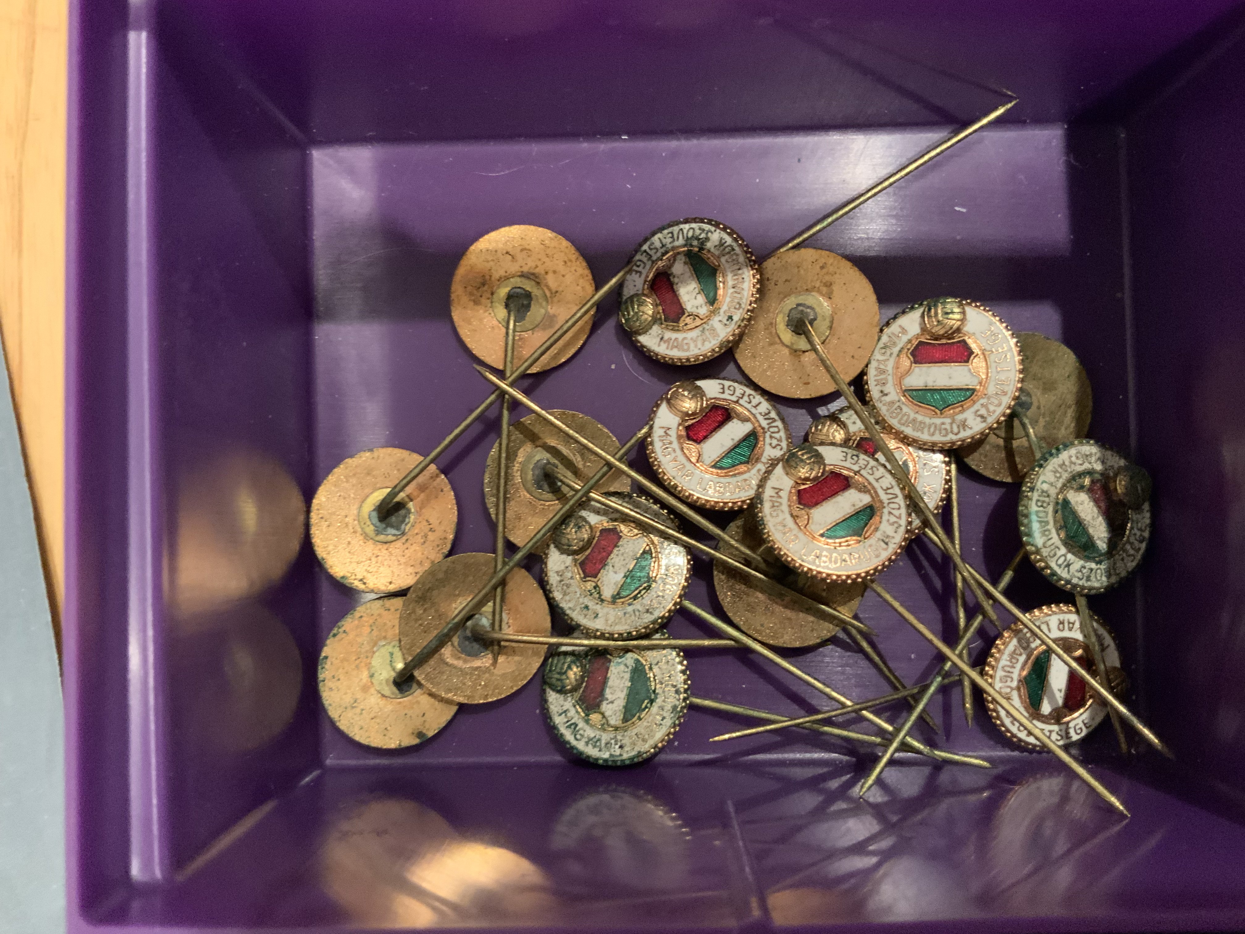 Football Badge Collection: Must view as badges appear old. Lot of Tottenham to include quantity of one style plus lapel badge etc. Quantity of each of the same Hungary and Italy badge plus International Soccer badge San Francisco which could refer to English club tours in the 60s. Possibly Panathinaikos as well in quantity. Spotted in this badge case a madras which states 1899 to 1949 celebrating 50 years of defunct Belgium team Beerschot.
