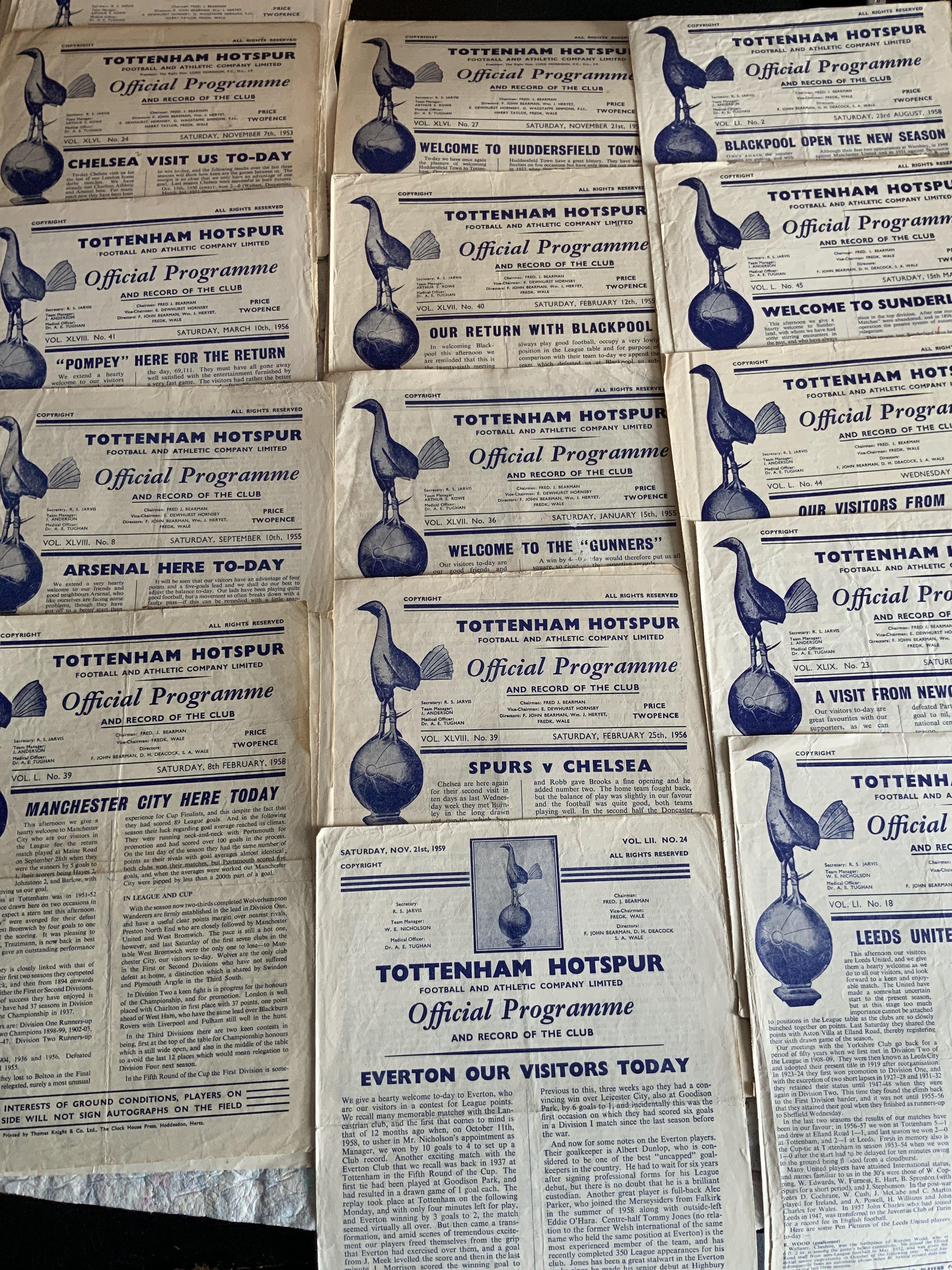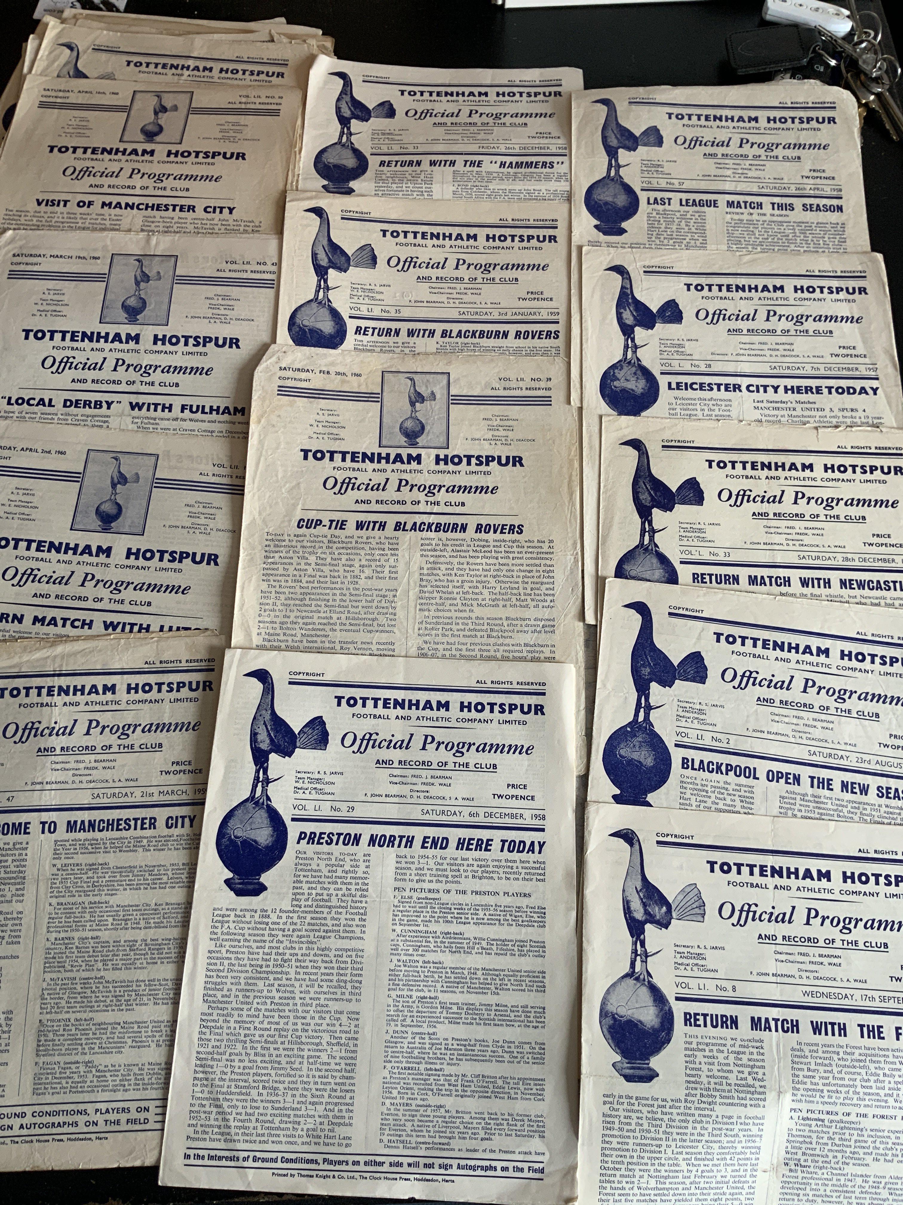Tottenham 1950s Home Football Programmes: Mid to late 50s 4 page sheets to include a few double season of. 60/61. Fair/good with no duplication. (40)