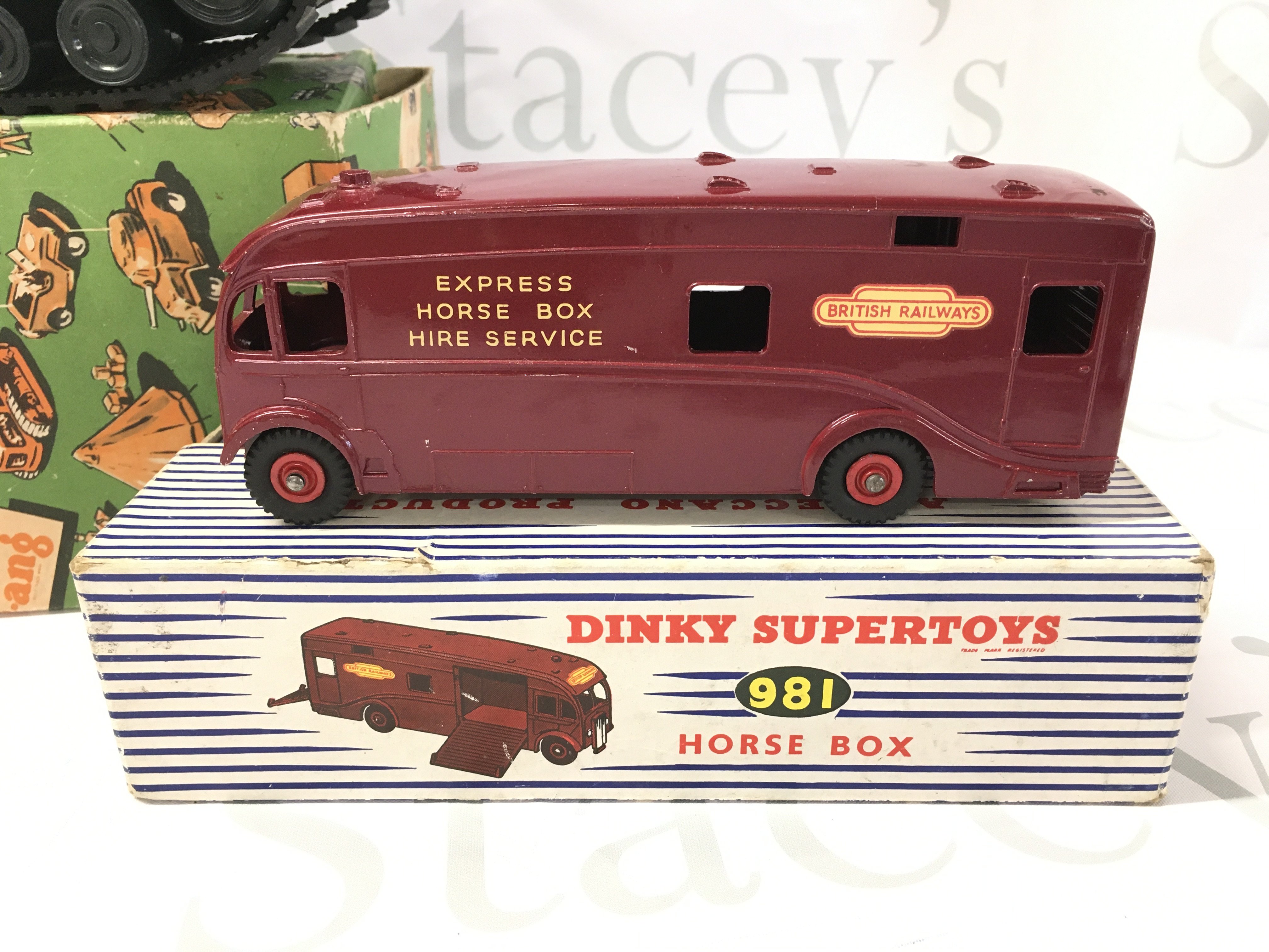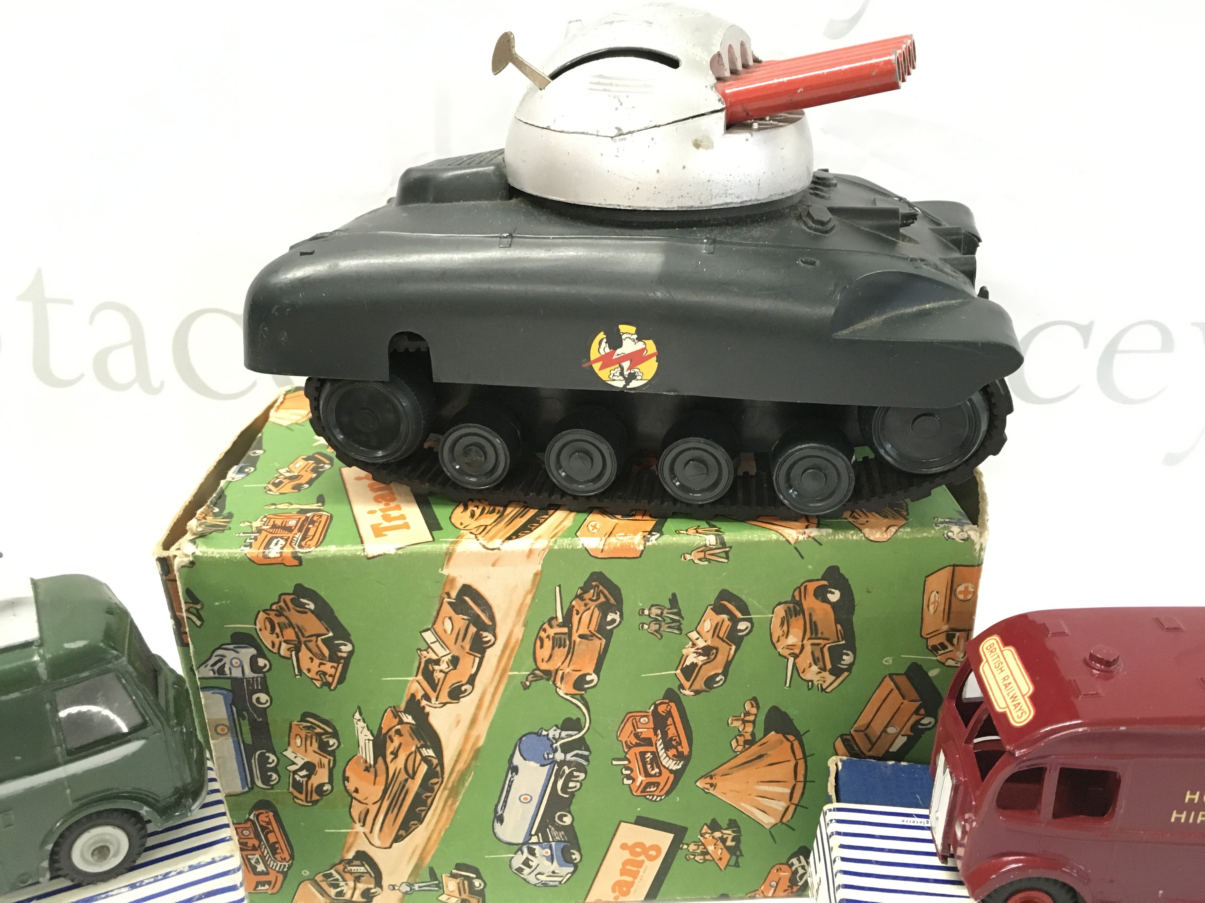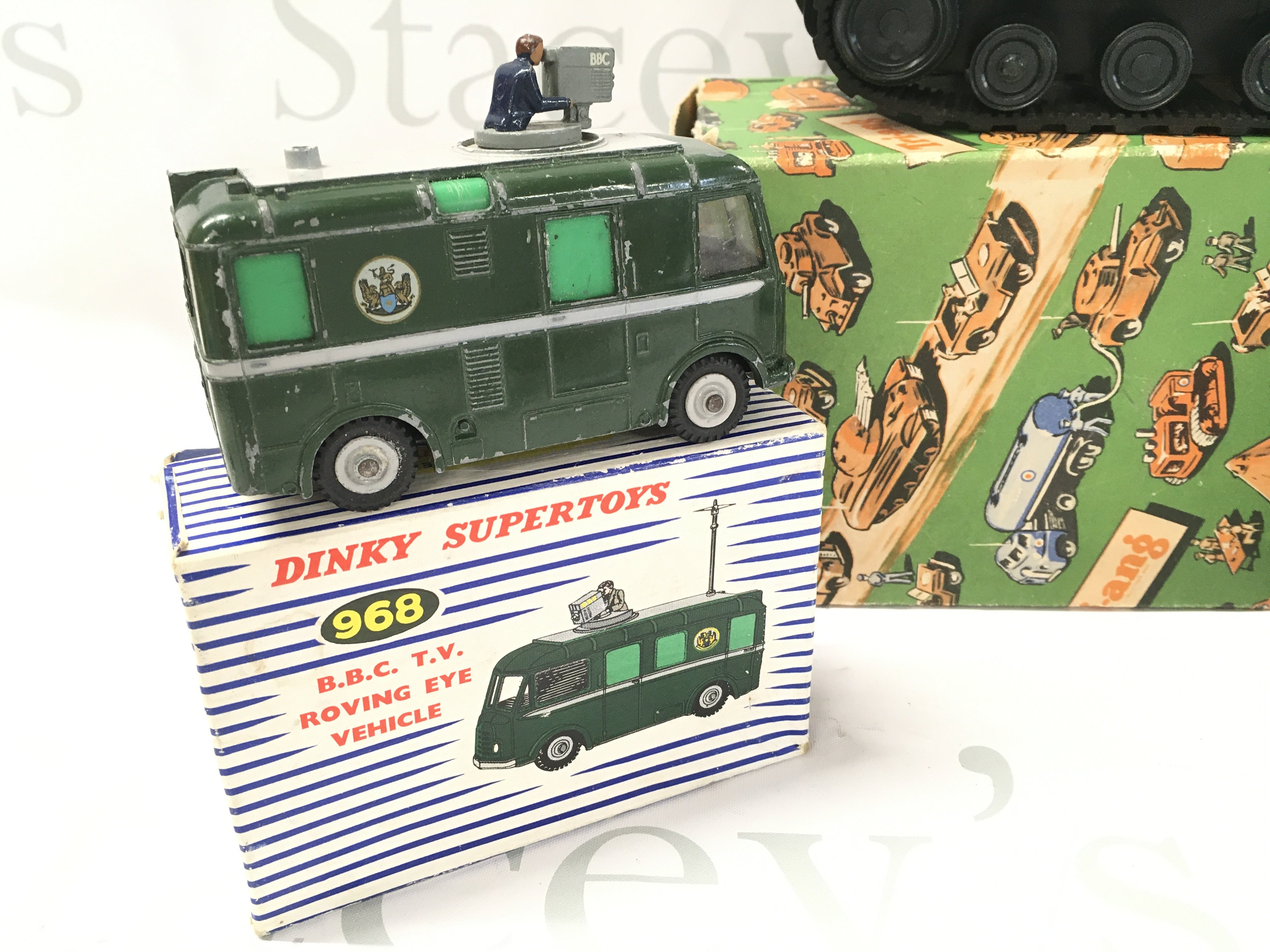 A Boxed Dinky B.B.C. TV Roving Eye Vehicle {Antenna Missing) #968. A Horse Box And A Tri-Ang Clockwork Tank (Key Missing)