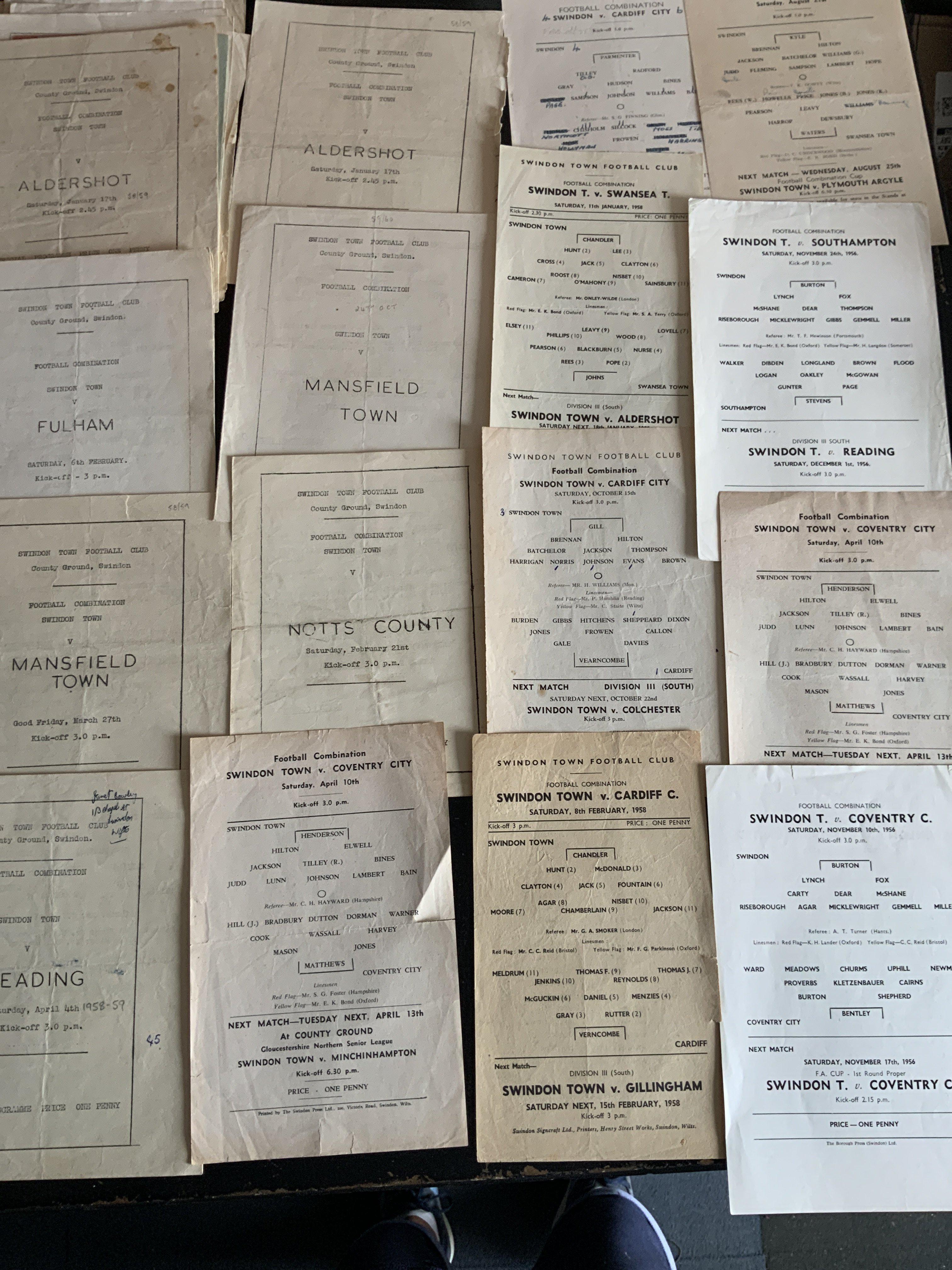 40s + 50s Swindon Town Reserve Football Programmes: Aways at 45/46 Ipswich, Chelmsford sof, 49/50 Watford, Charlton mainly all with punch holes. Homes include 49/50 Brentford Aldershot and a further 21 in the 50s which are mainly single sheets plus more. Fair/good.