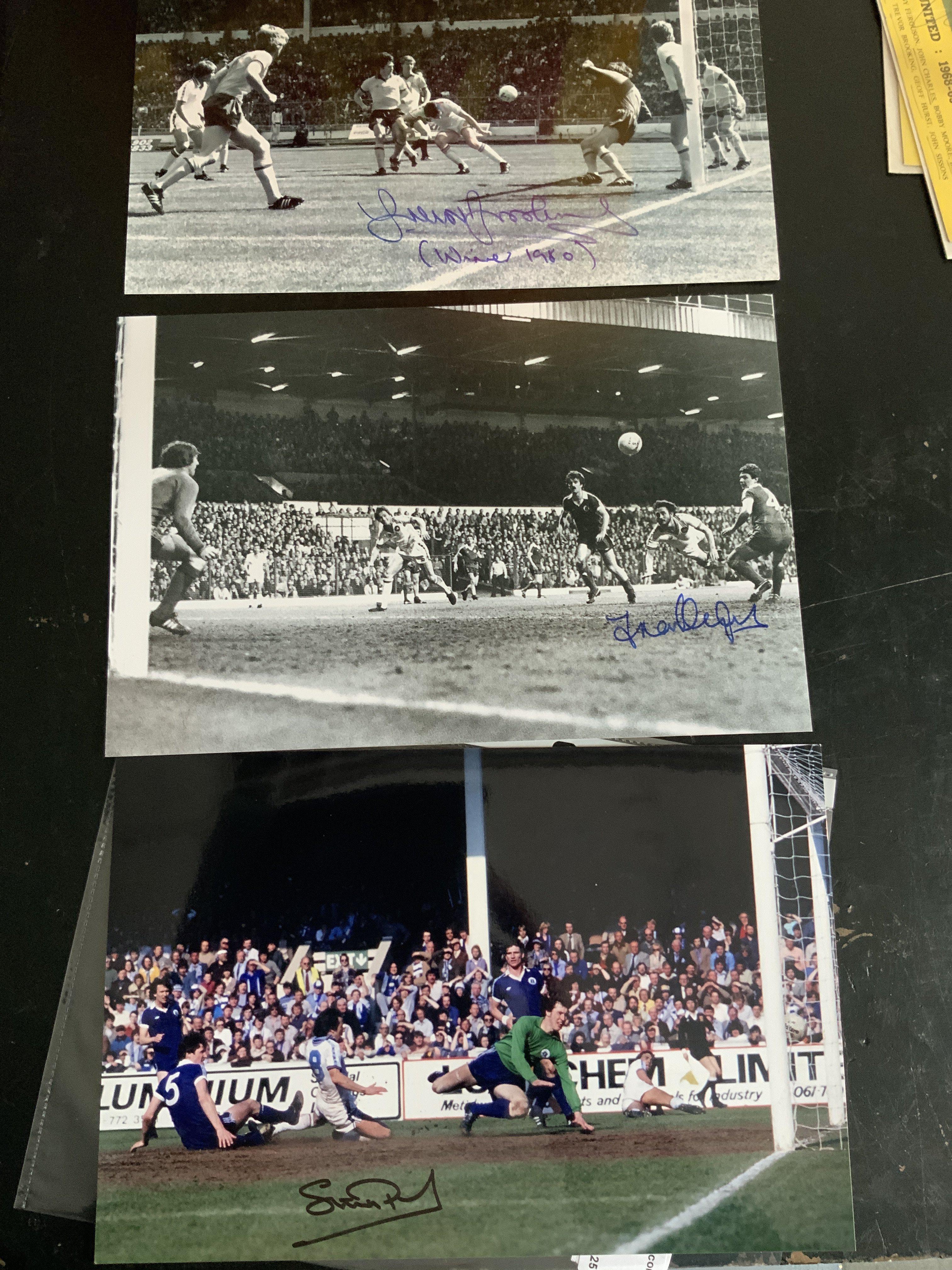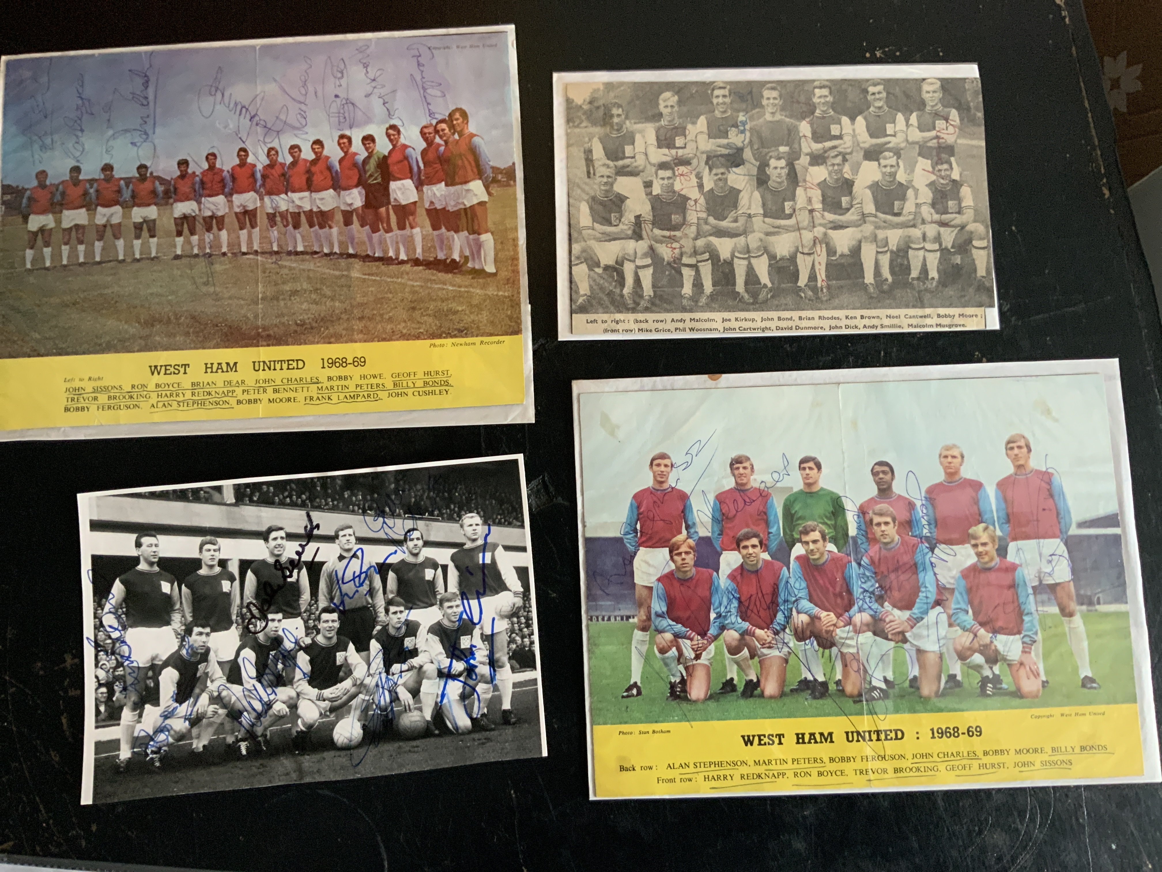 West Ham Signed Football Team Groups: Two from 68/69 one signed by 9 the other by 11. There is a mid 60s team with 8 autographs and a late 50s signed by 6 including an early Bobby Moore autograph. C/W 3 photos all signed by goalscorers in the 1980 FA Cup run. (7)