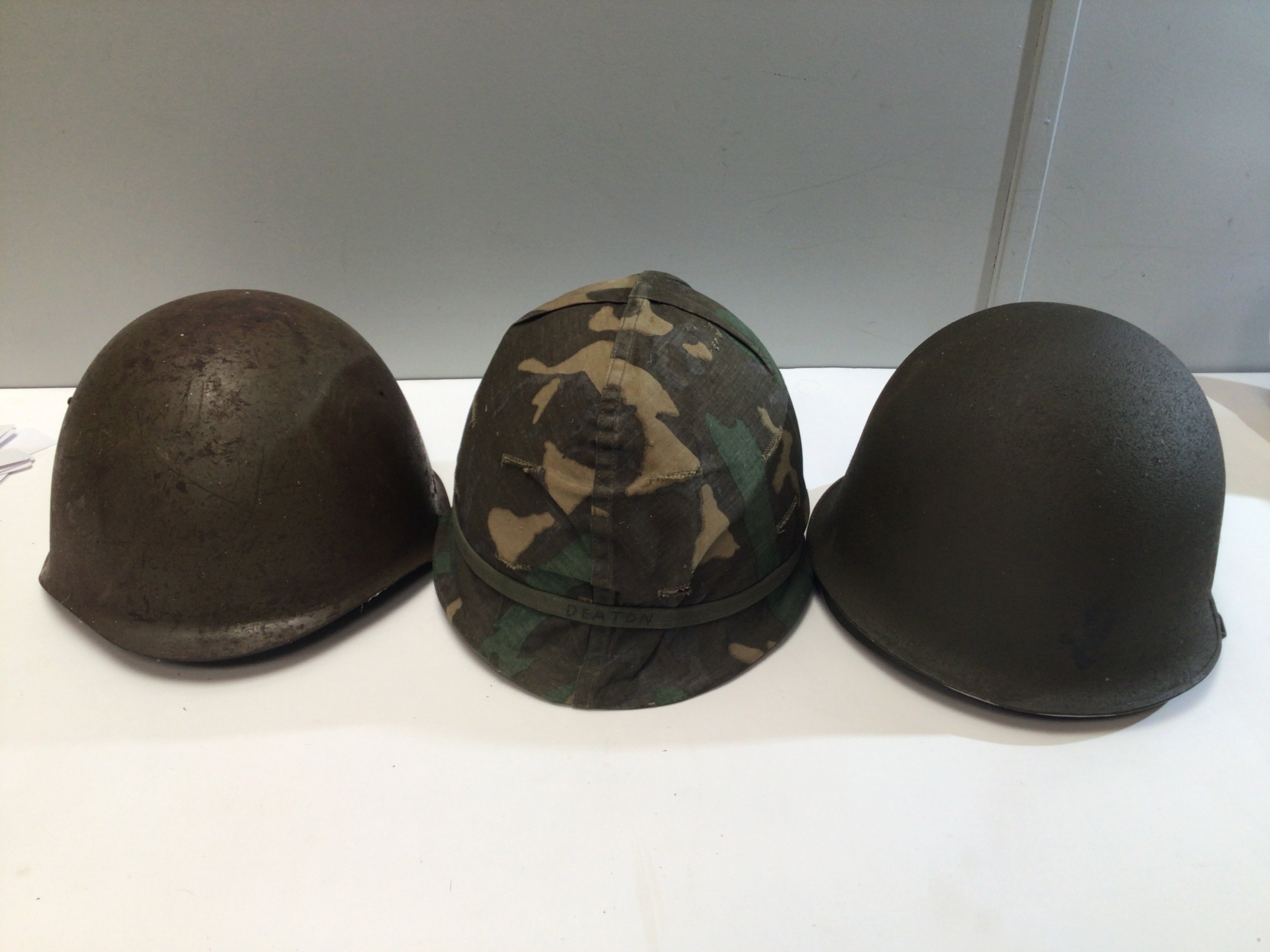 Three Military Combat helmets a Russian M52 Pattern with leather liner American mid 1980 helmet with Camouflage cover and a Ground Troops Mk1 helmet with liner (3)