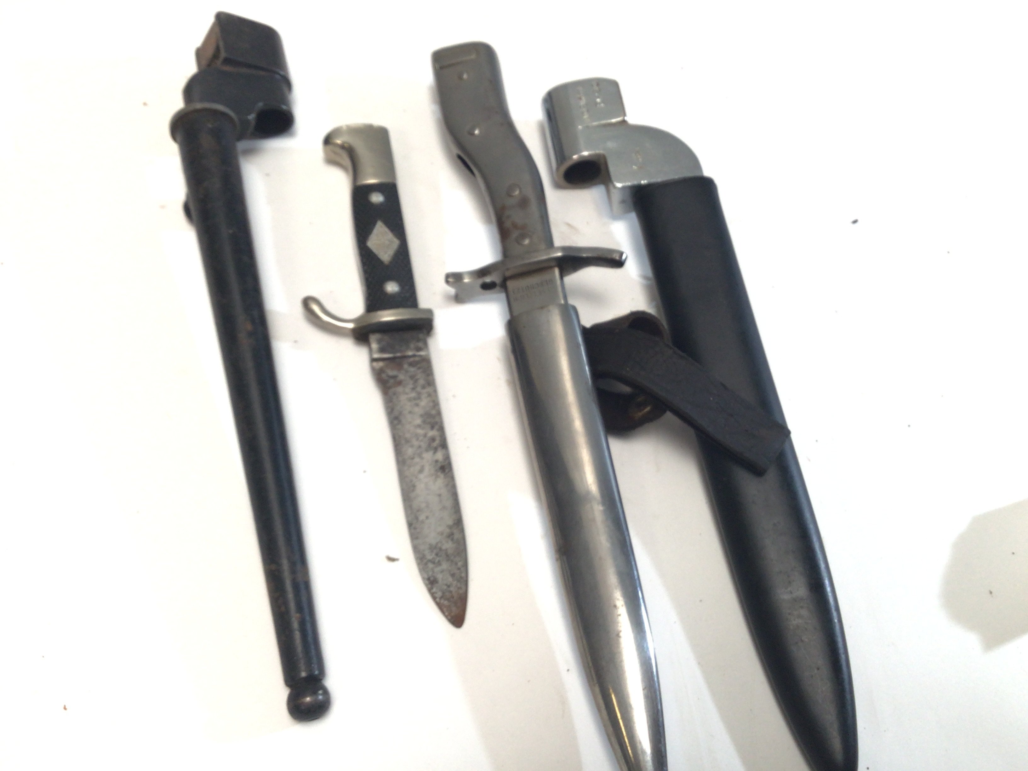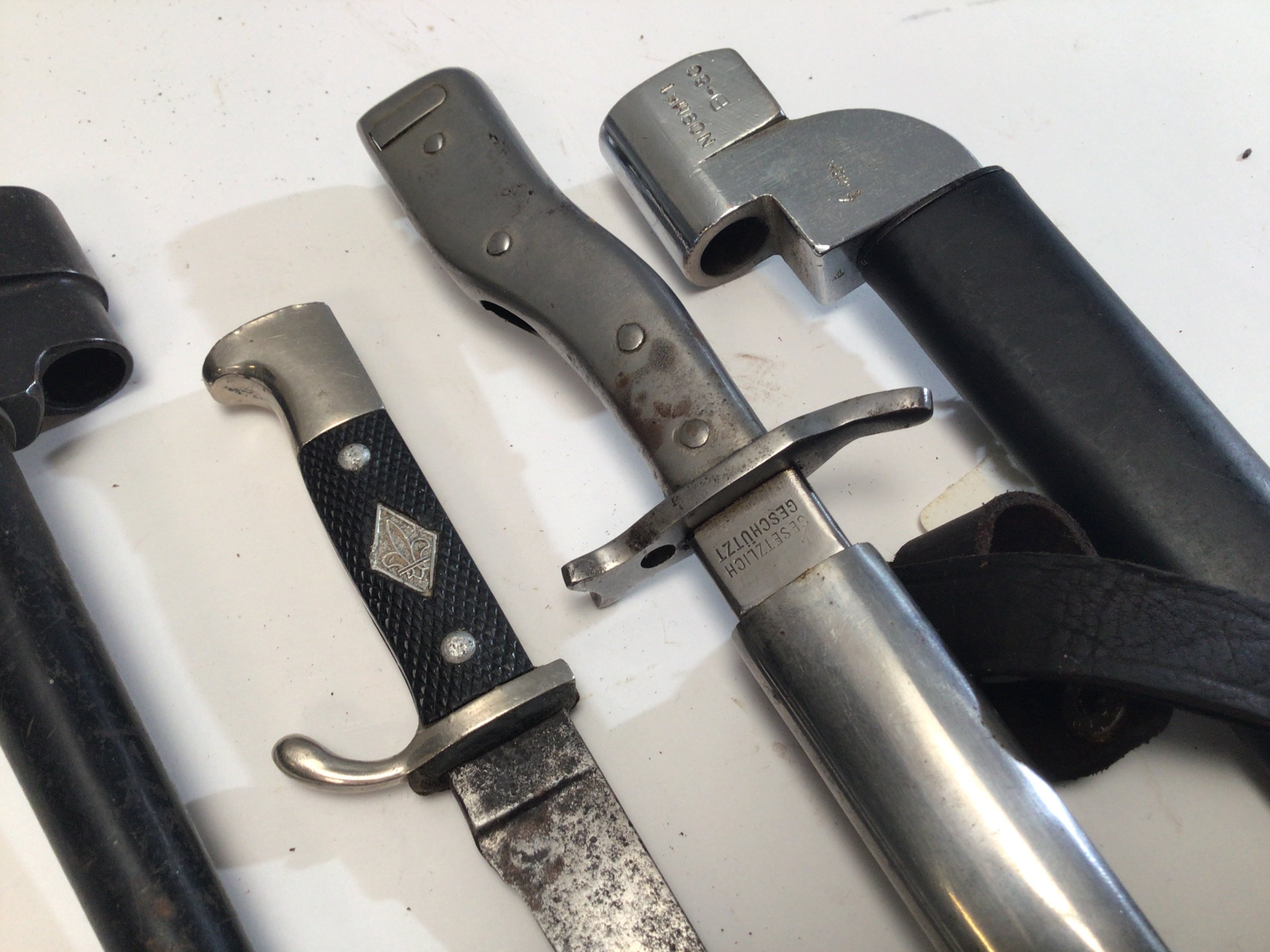 A Chrome finish German bayonet Geschutzt an Enfield number 4 bayonet Scouts knife and a stick bayonet (4)