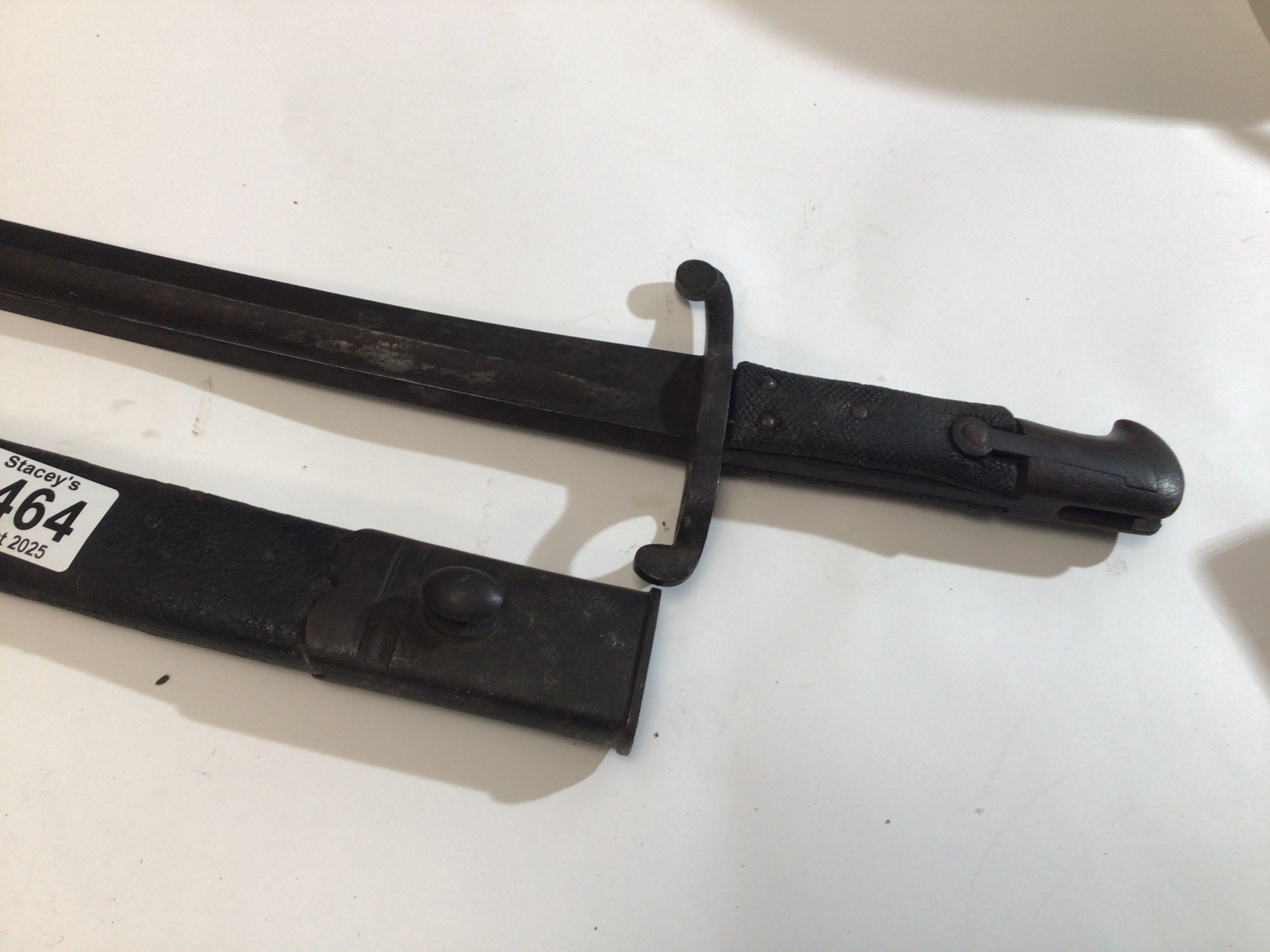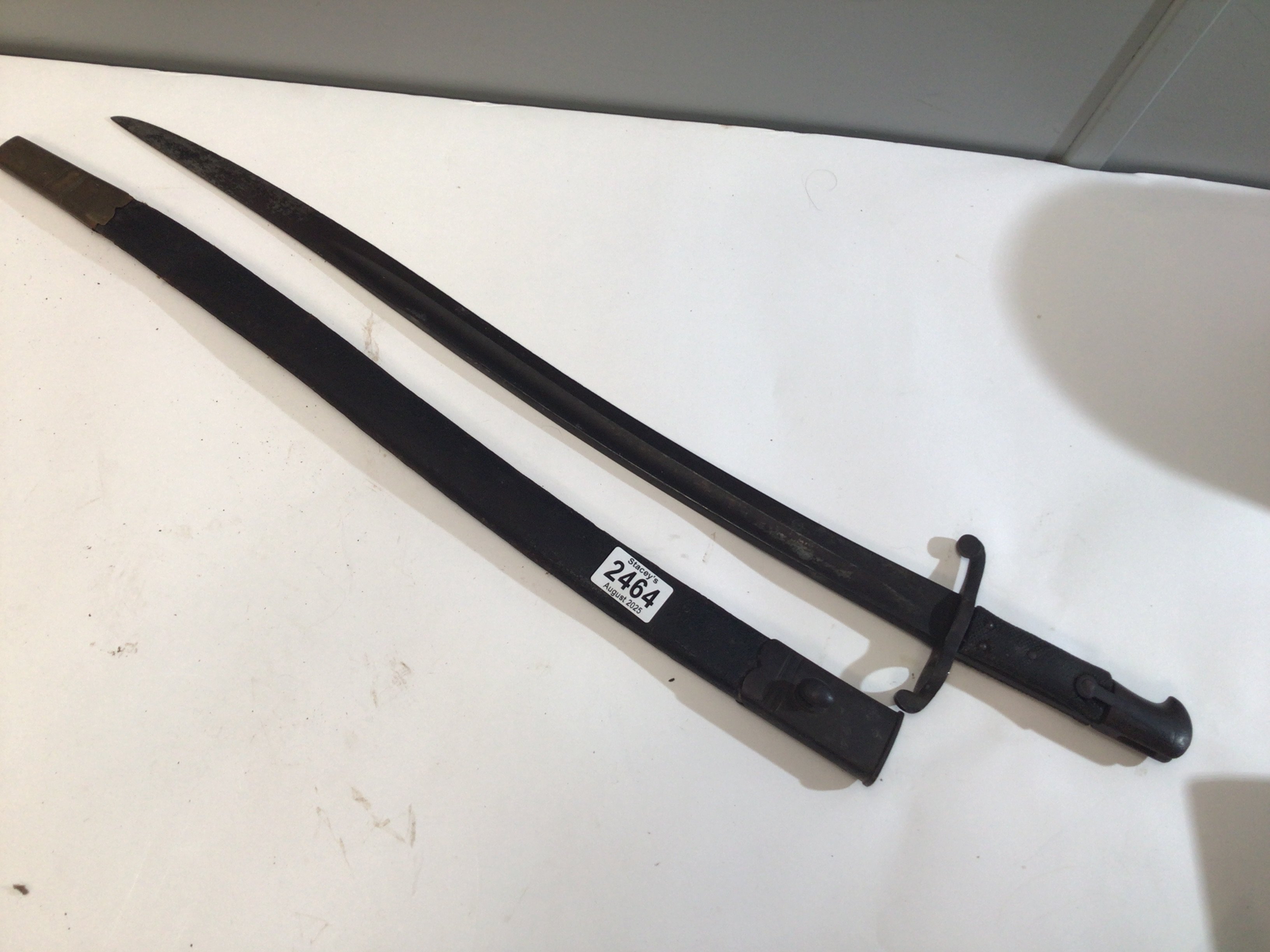 A British Martini-Henry sword bayonet possibly 1887 pattern the long bayonet with a brass mounted leather scabbard.