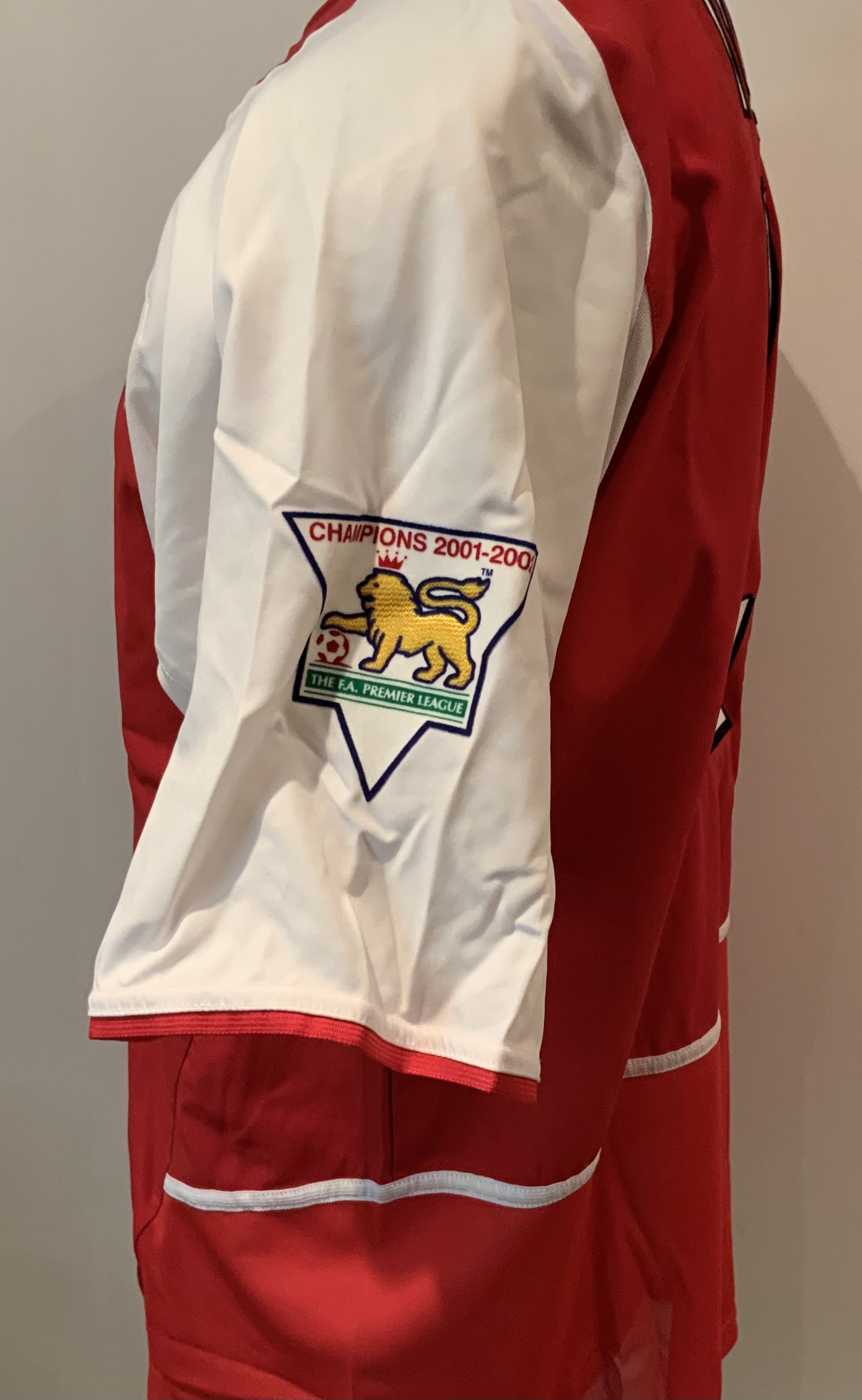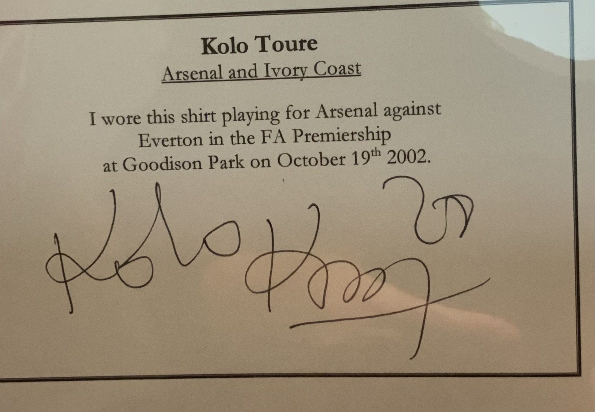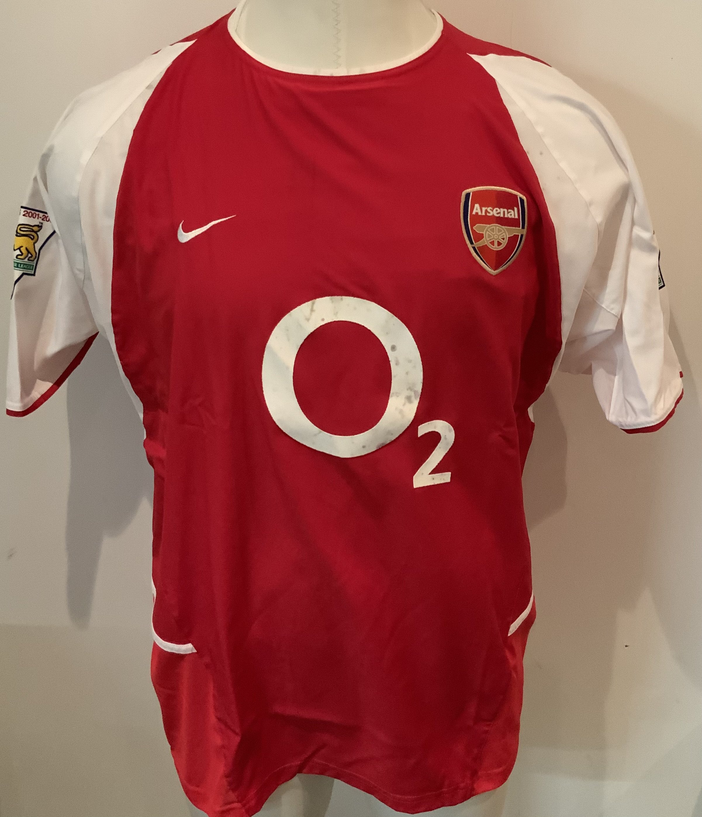 Arsenal Toure 2002 - 2003 Match Worn Home Football Shirt: Nike red short sleeve shirt with O2 sponsorship. Toure 28 to rear and Premier League Winners 2001/2002 sleeve badging. Inner mesh still attached. Some dirt marks to Sponsorship. Worn by Toure on 19 10 2002 with a COA signed by him.