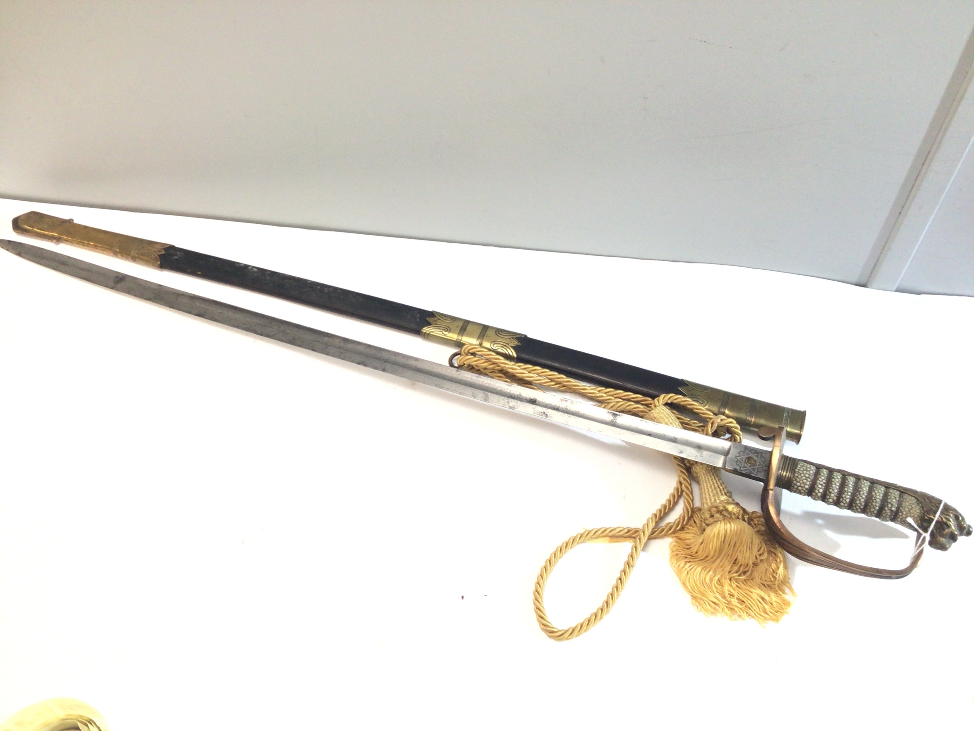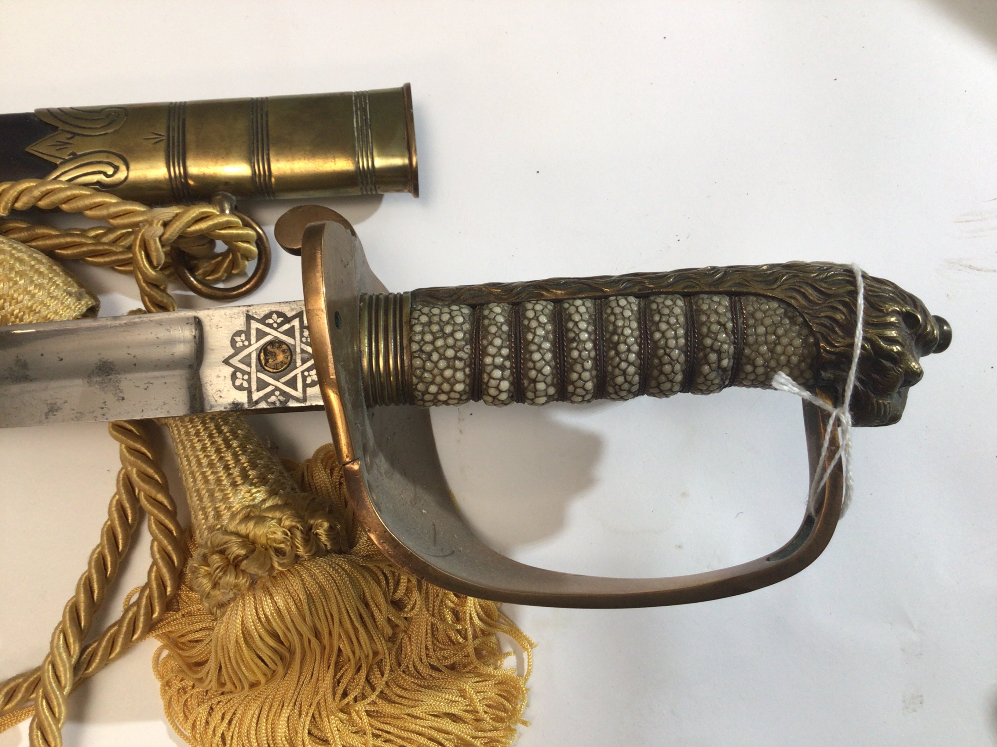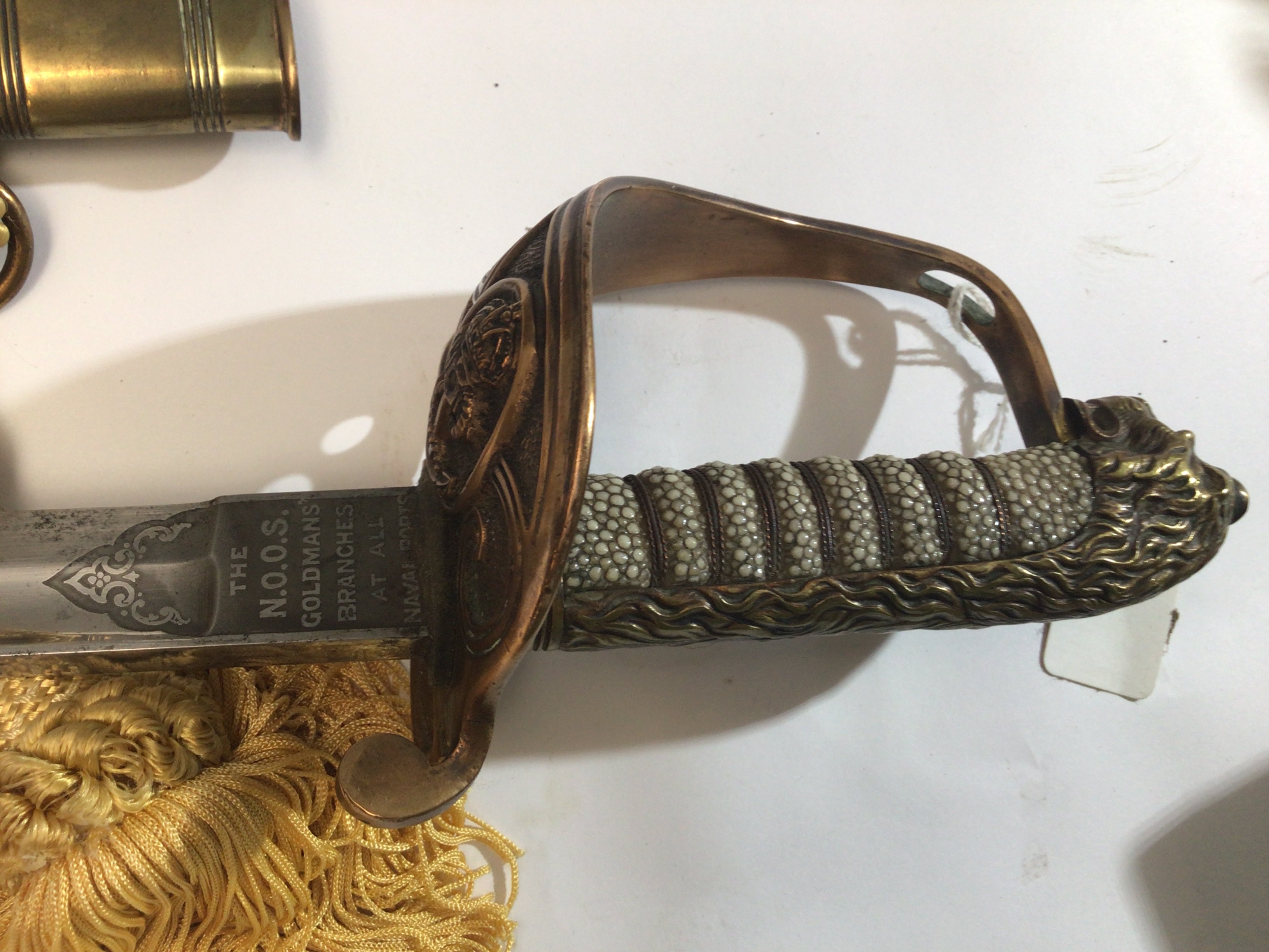 A Navy Officers sword with a bound shagreen grip lion head pommel the hinged folding cross guard. With anchor and crown. The blade with etched pattern and makers name The NOOS Goldmans Branches at the Naval Ports. Leather scabbard with applied brass mounts.