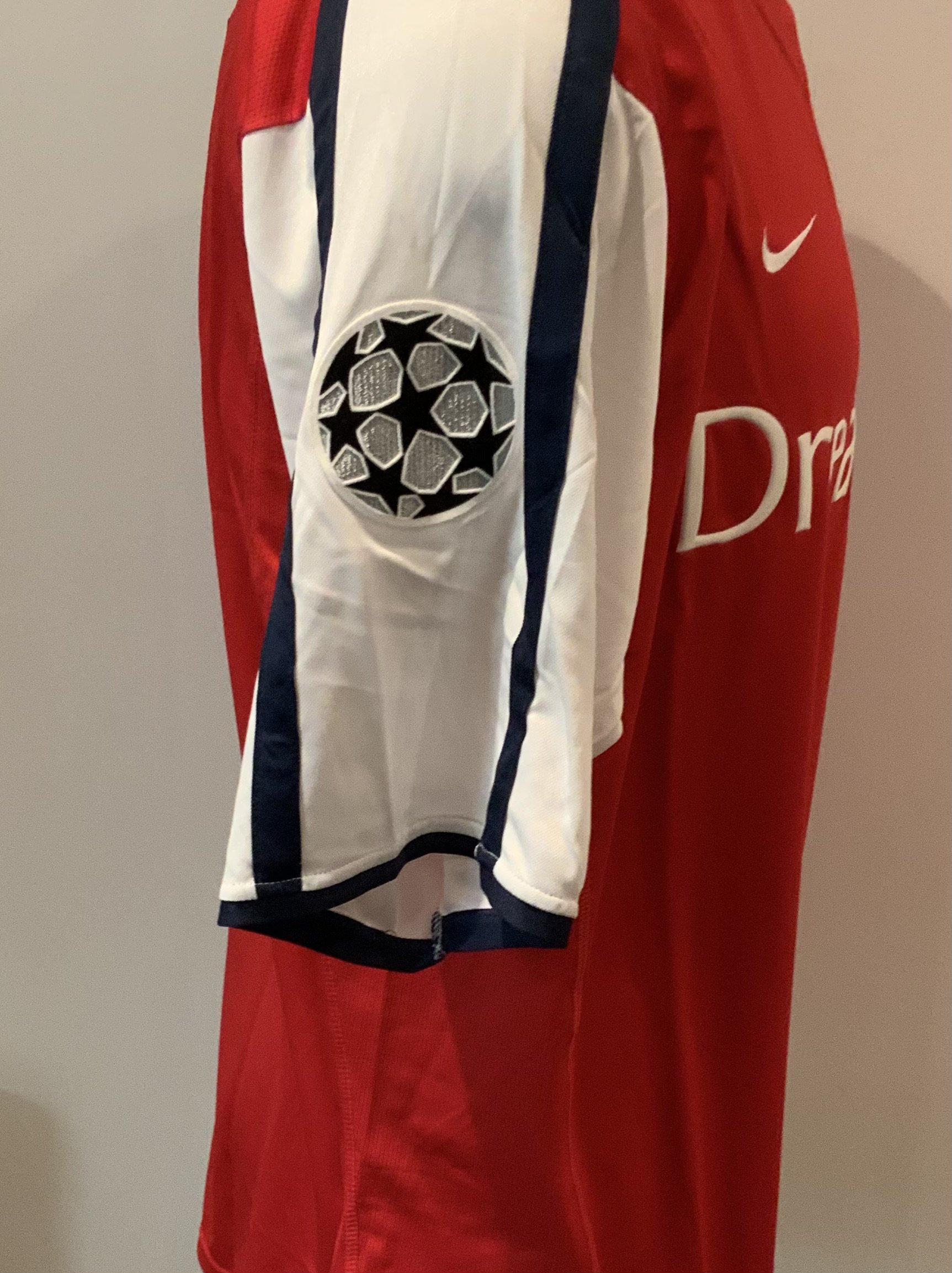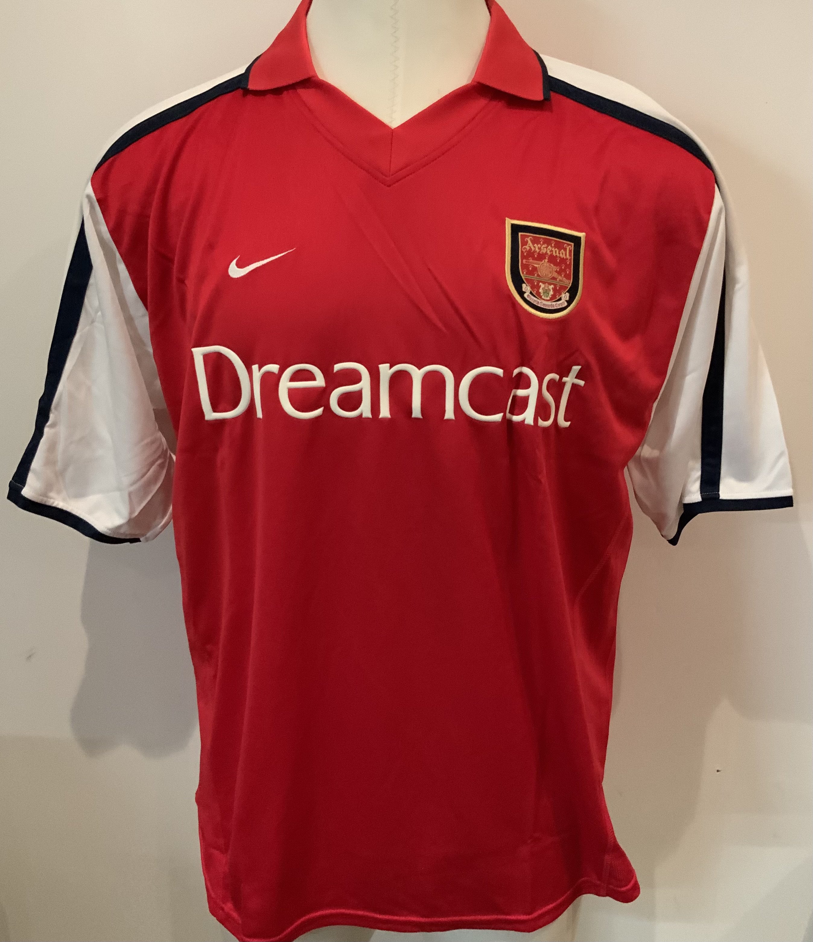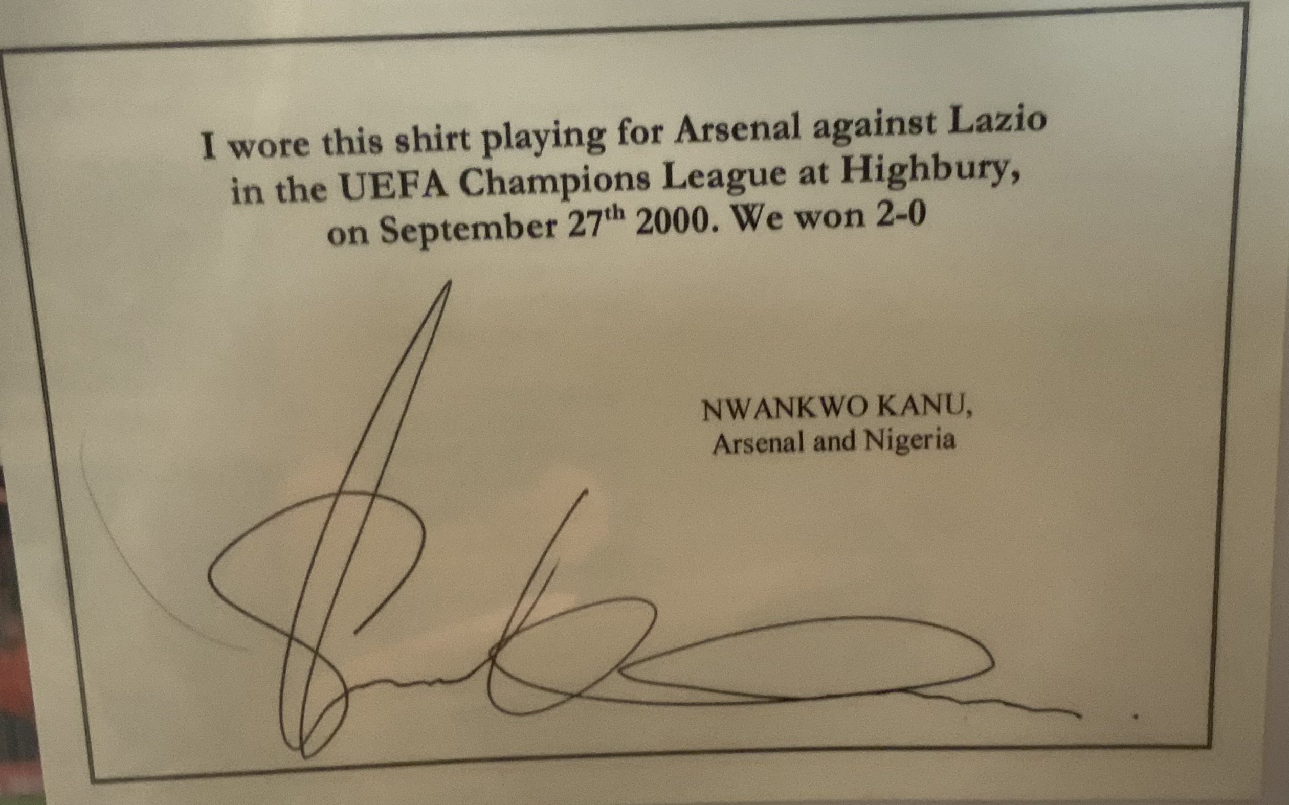 Arsenal Kanu 2000 - 2001 Match Worn Home Football Shirt: Nike red short sleeve shirt with Dreamcast sponsorship. Kanu 25 to rear and Champions League badging to sleeve. Worn by Kanu v Lazio on 27 9 2000 with a COA signed by him.