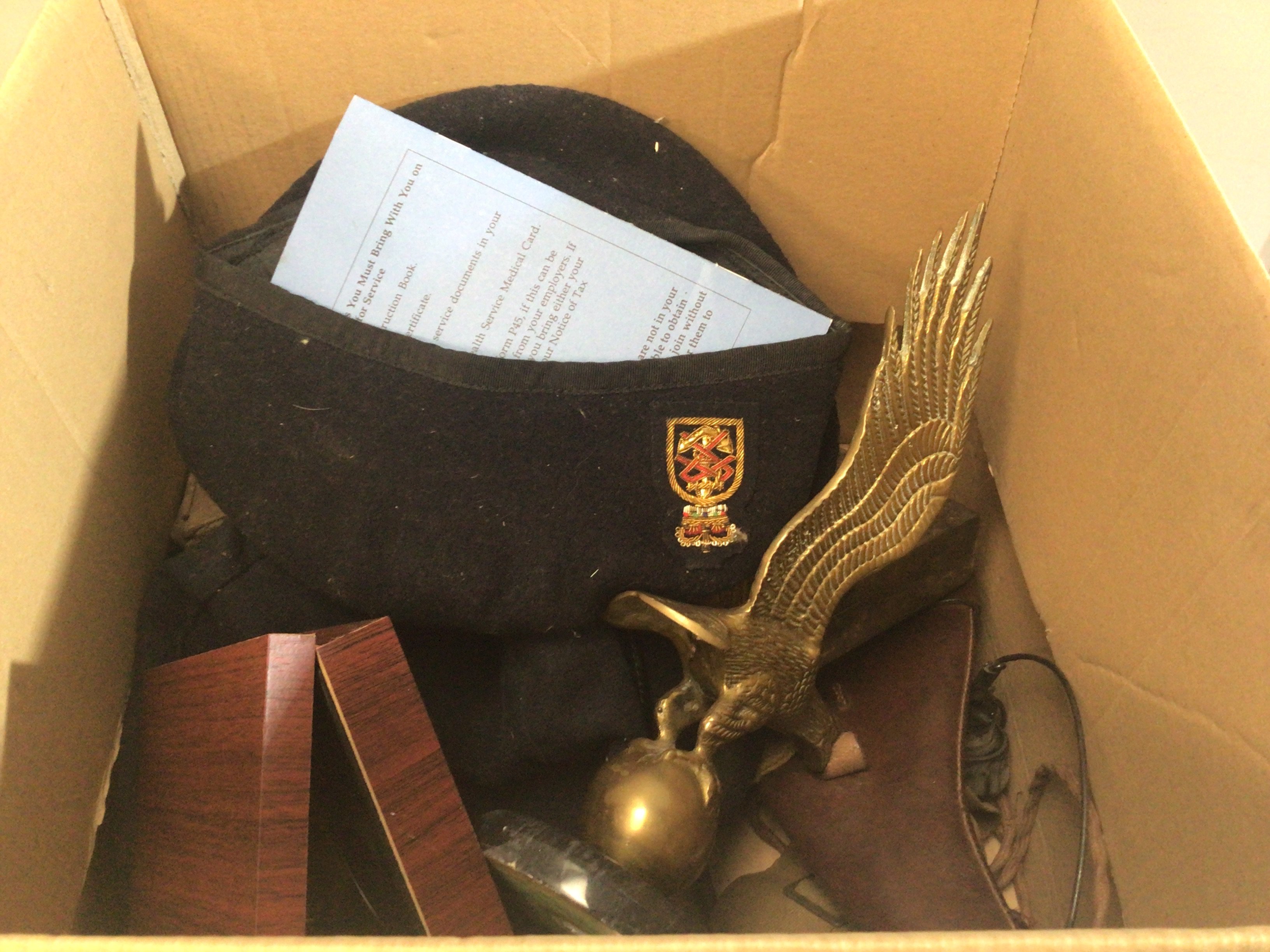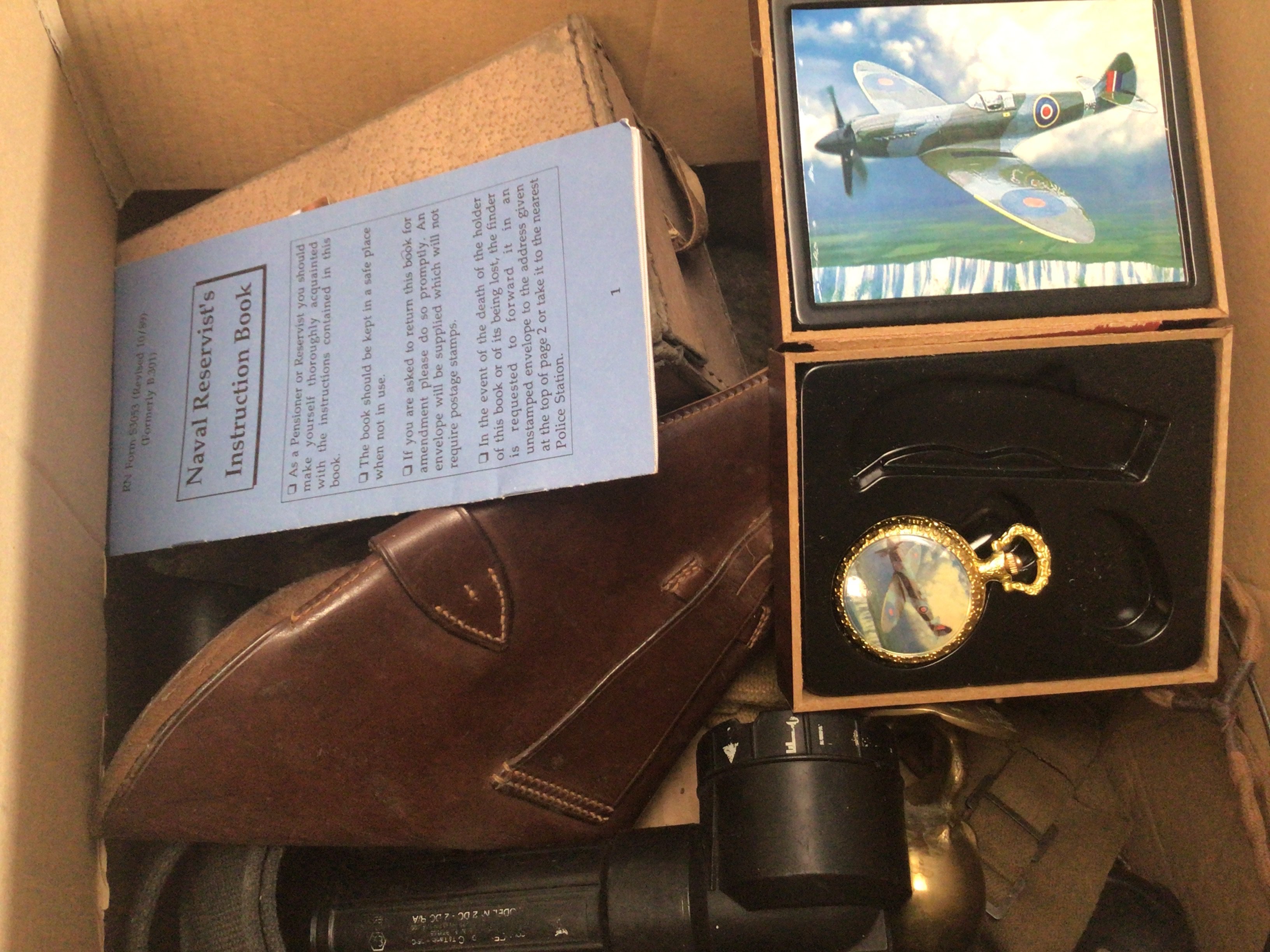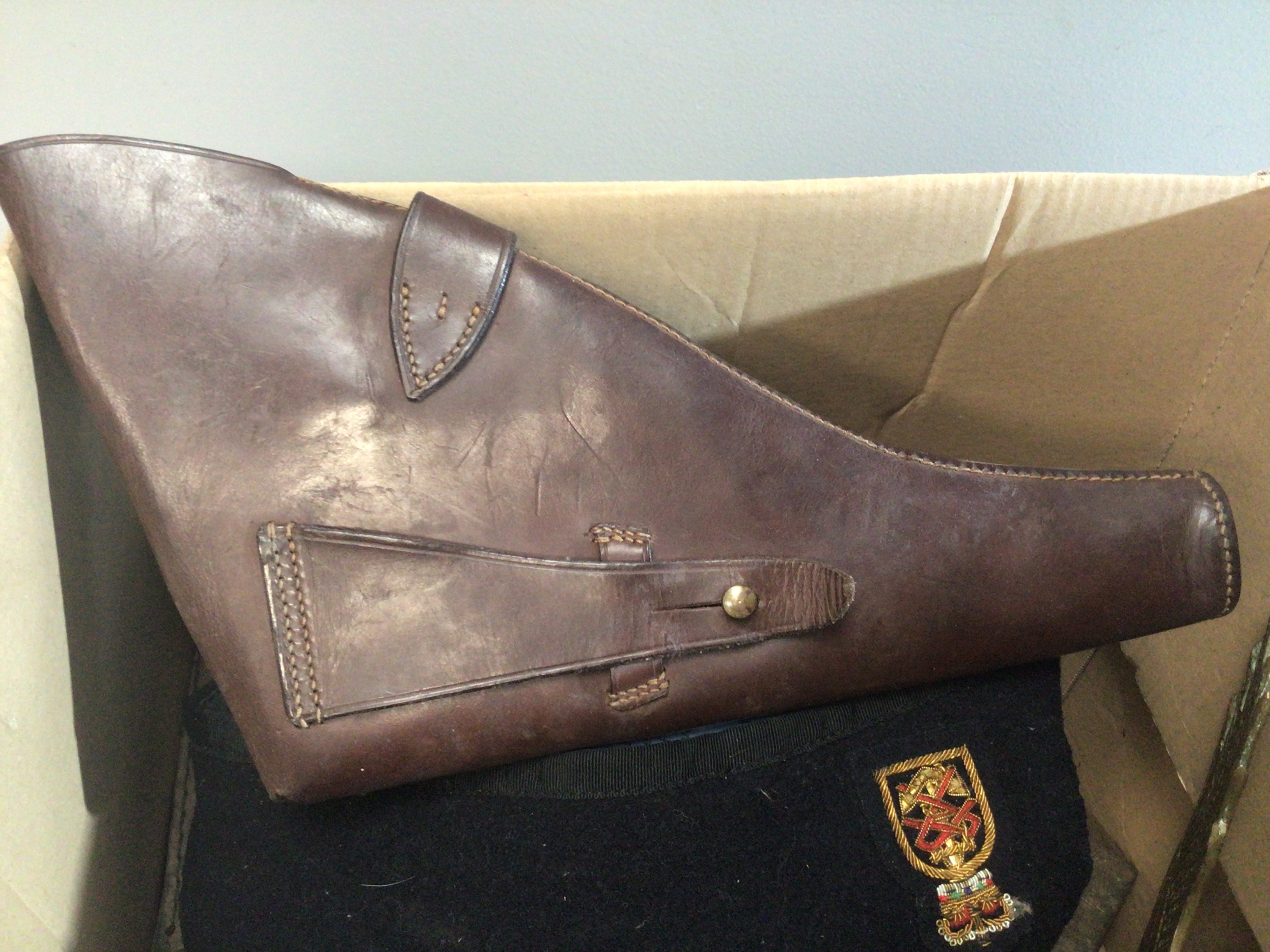 A box containing military items a gas mask leather gun holsters hats and a brass Eagle.
