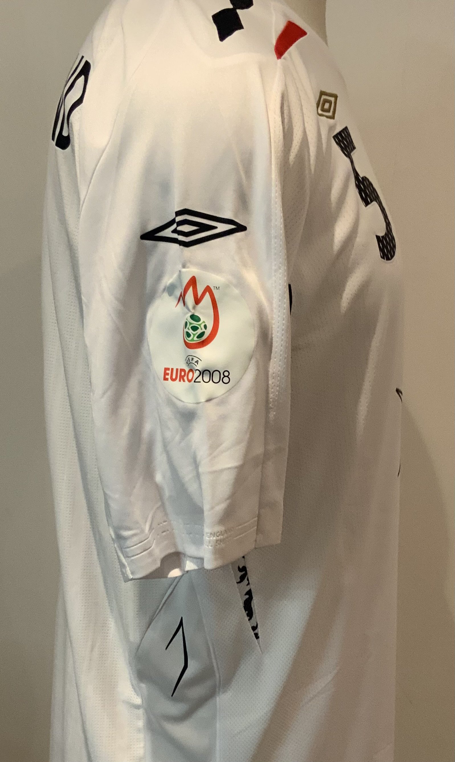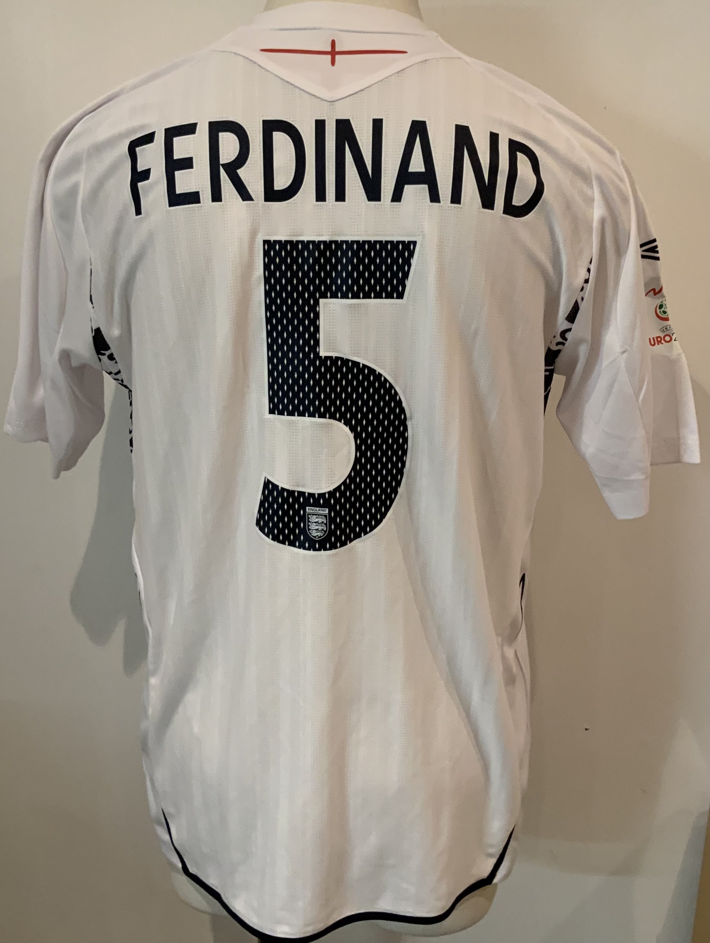 England Rio Ferdinand 2007 Match Worn Football Shirt: Umbro short sleeve shirt with Ferdinand 5 to rear and Euro 2008 badging to sleeve. Number 5 to front match details Israel v England 24 03 2007 and Rio Ferdinands autograph. Direct from top source who we know. The Manchester United player played the whole match in a 0-0 draw in Tel Aviv.