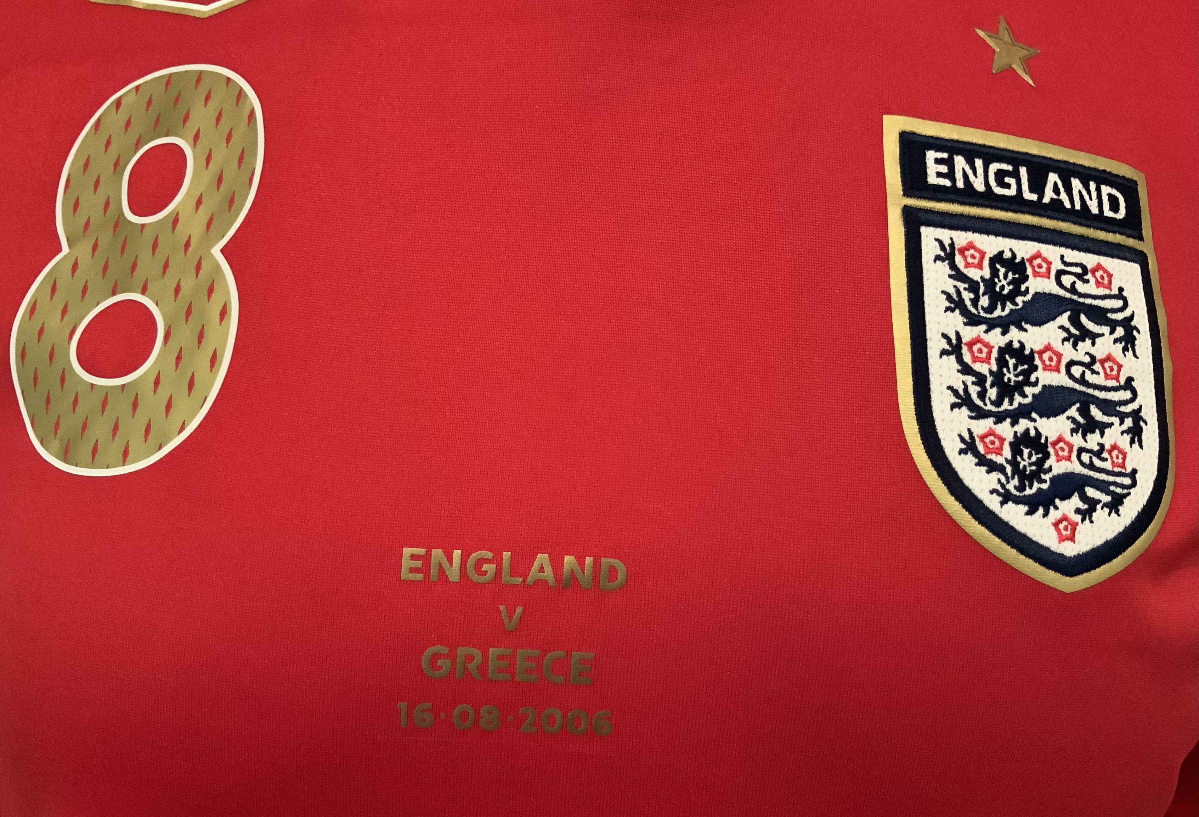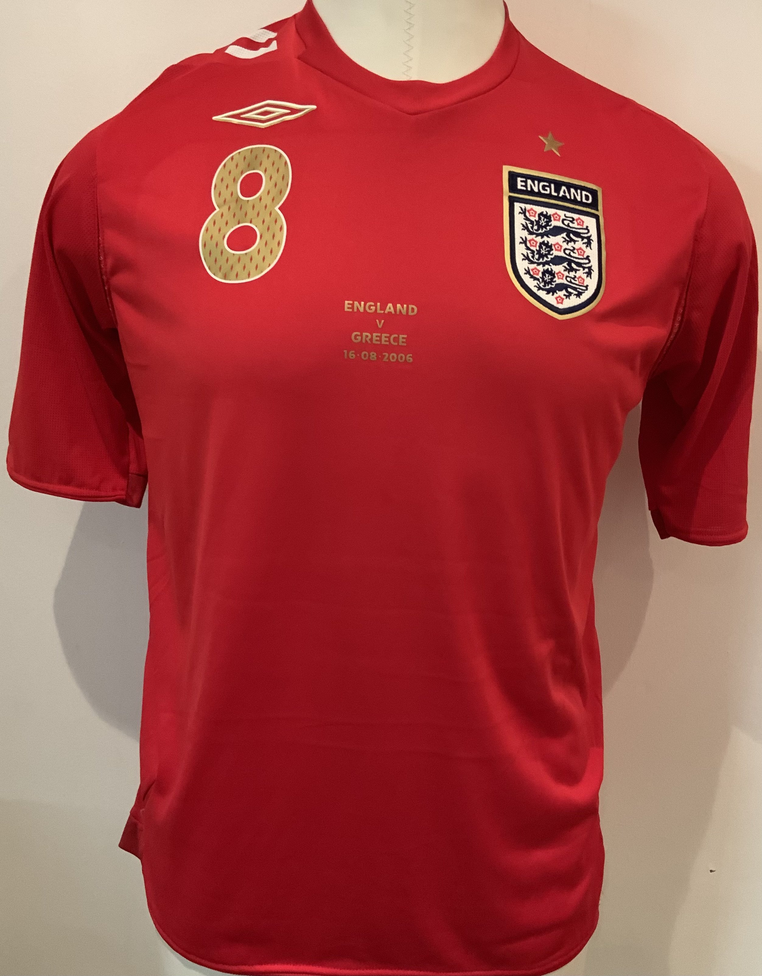 England Lampard 2006 Match Worn Red Football Shirt: Umbro short sleeve shirt with Lampard 8 to rear and no badging to sleeve as was a friendly. Number 8 to front with match details England v Greece 16 08 2006. Lampard scored in 4-0 win at Wembley. Direct from top source who we know.