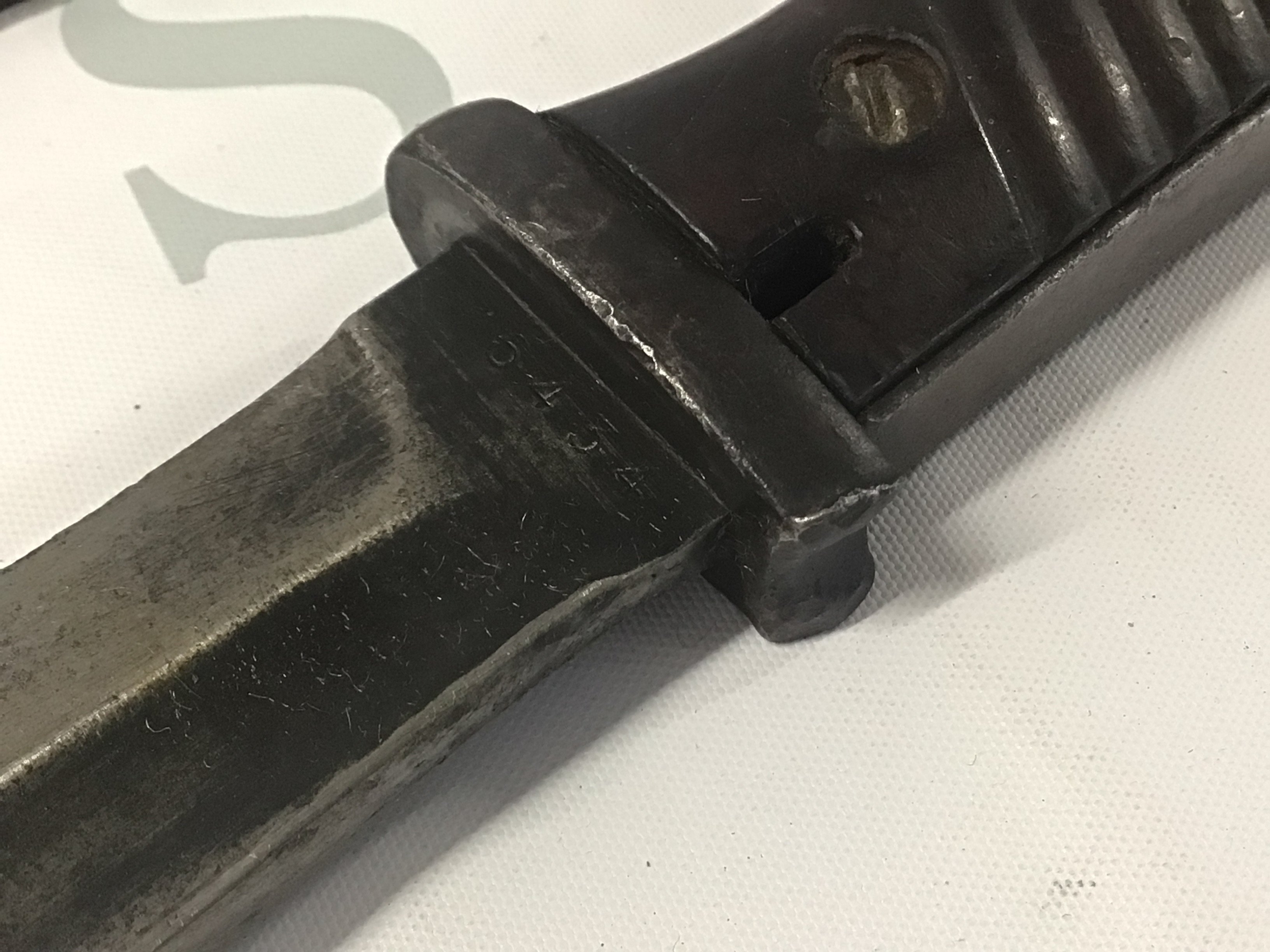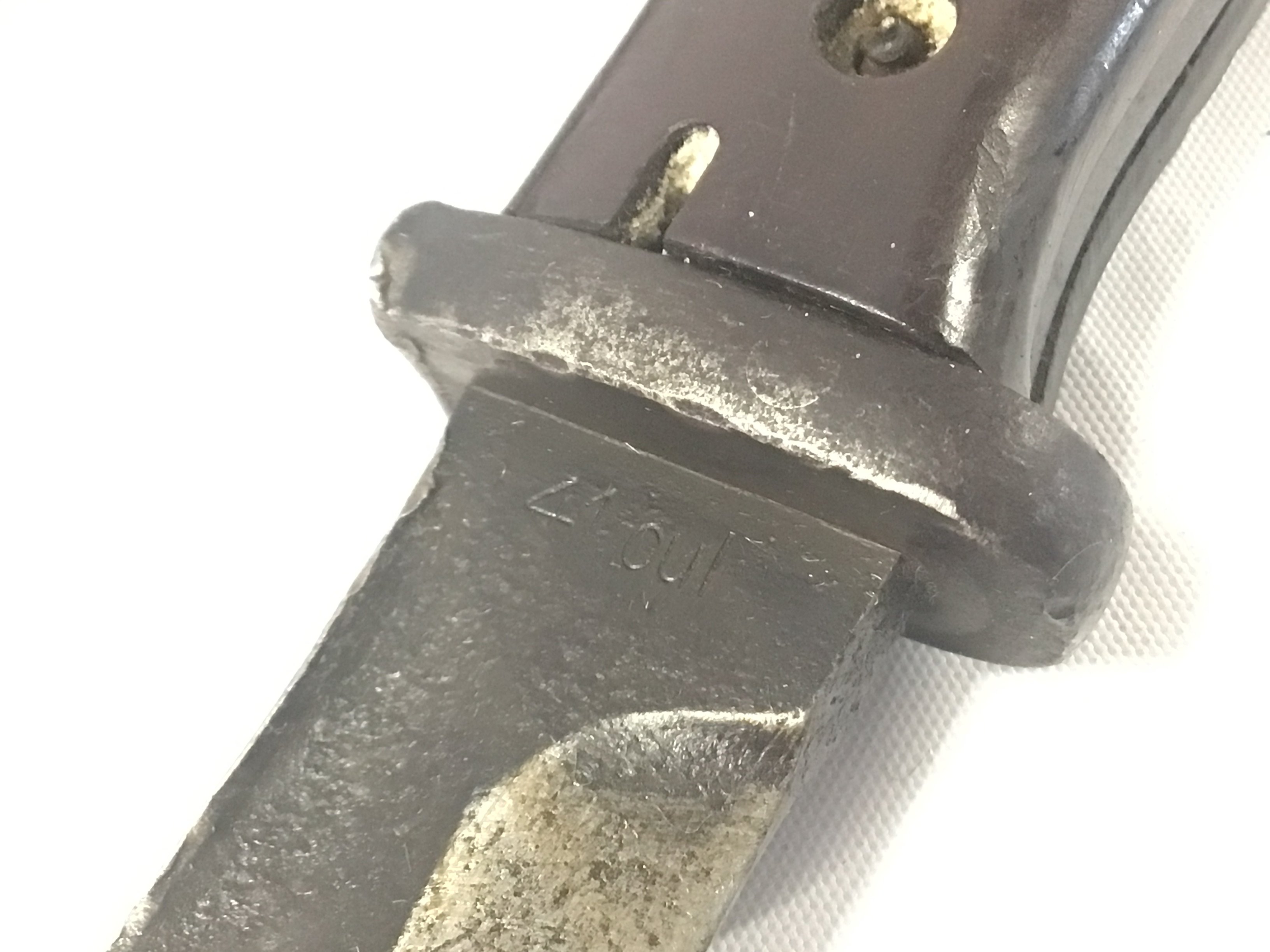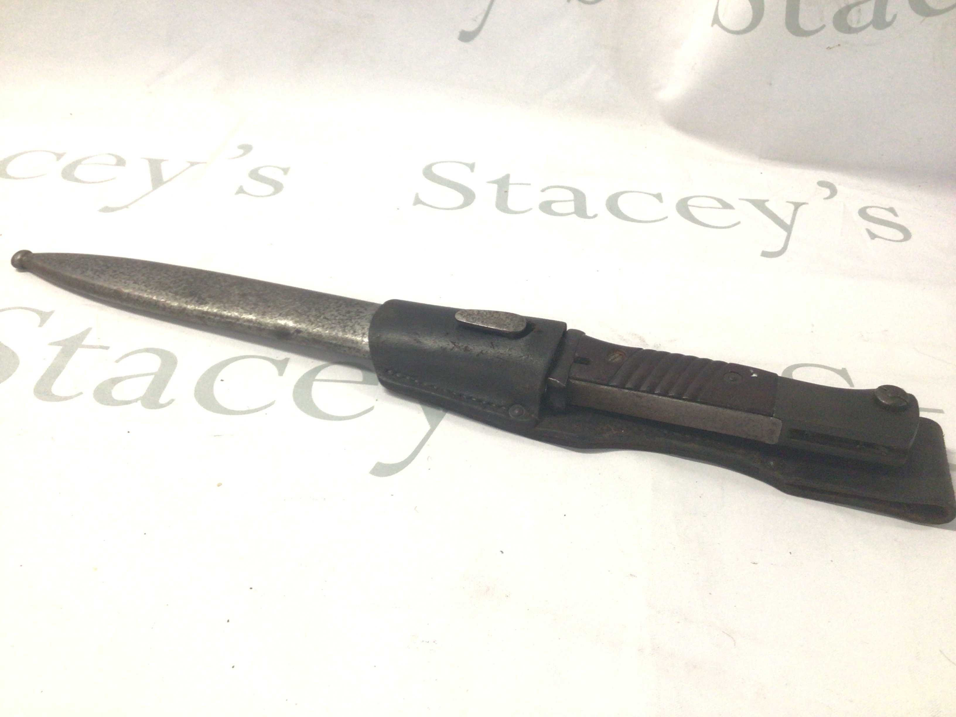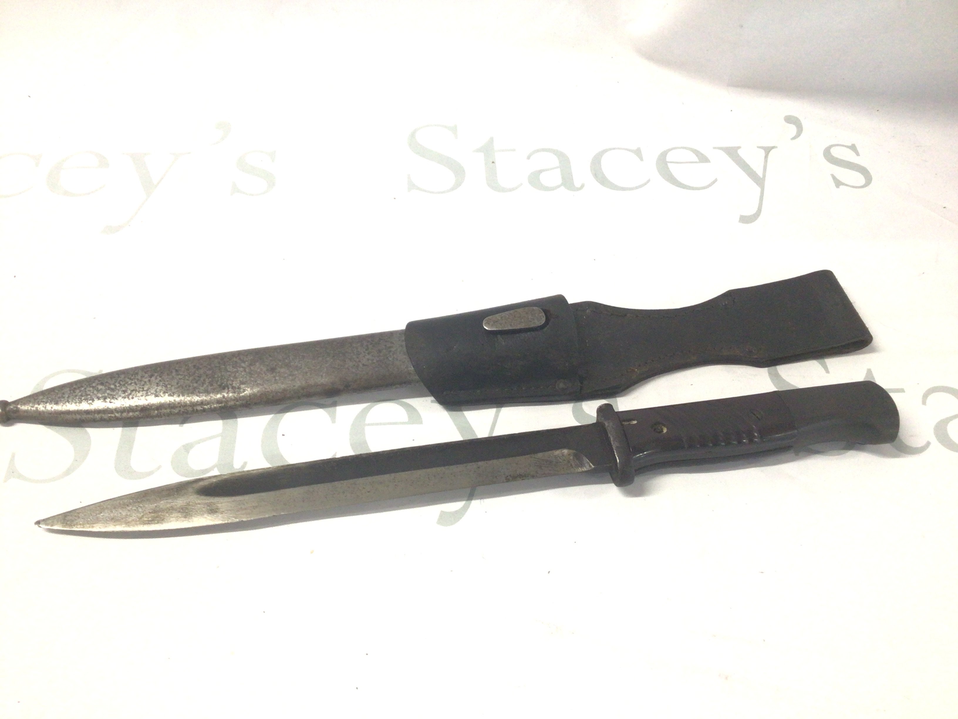 A German Third Reich K98 Mauser bayonet. With a leather frog attached the blade with serial numbers.