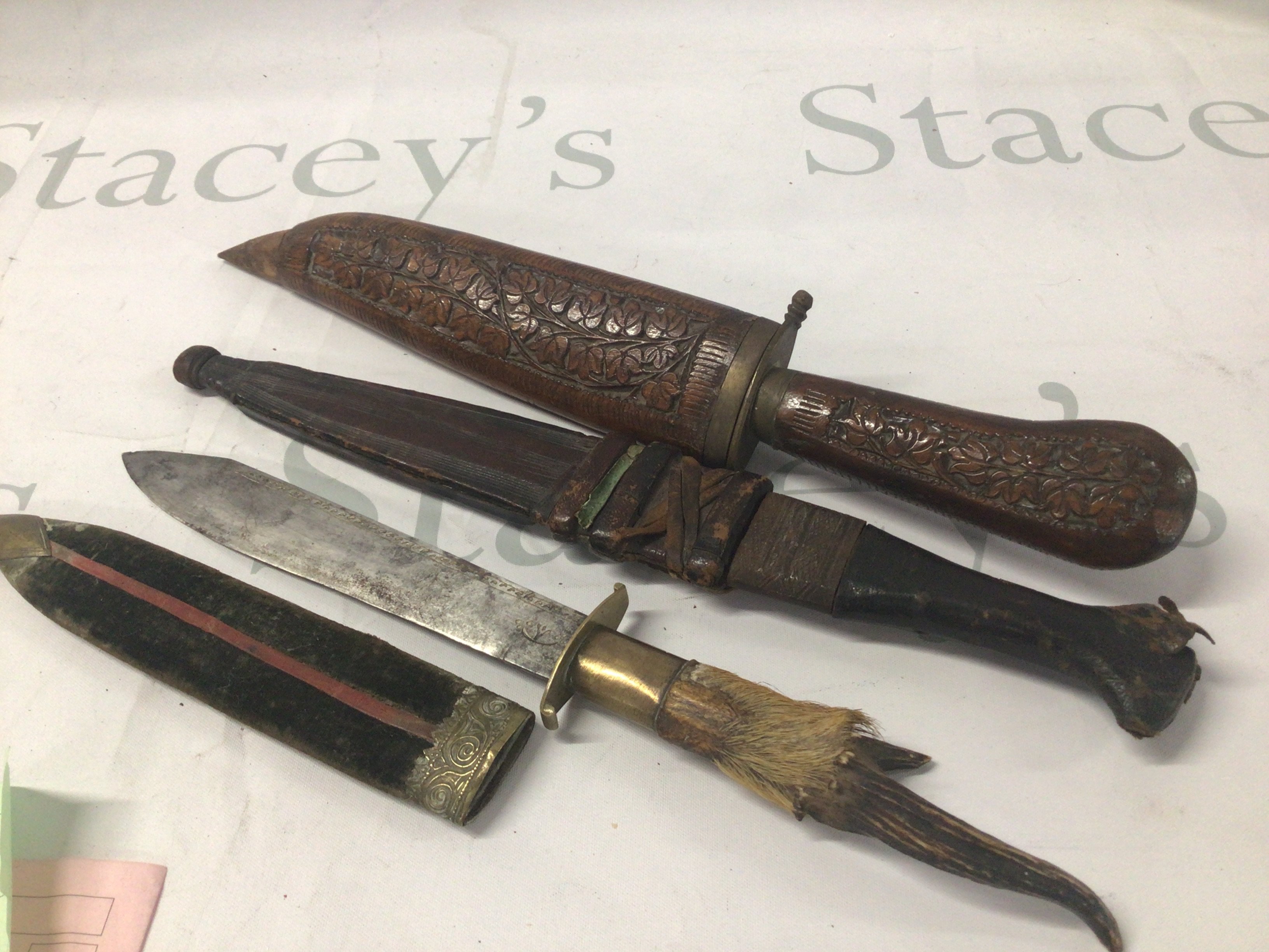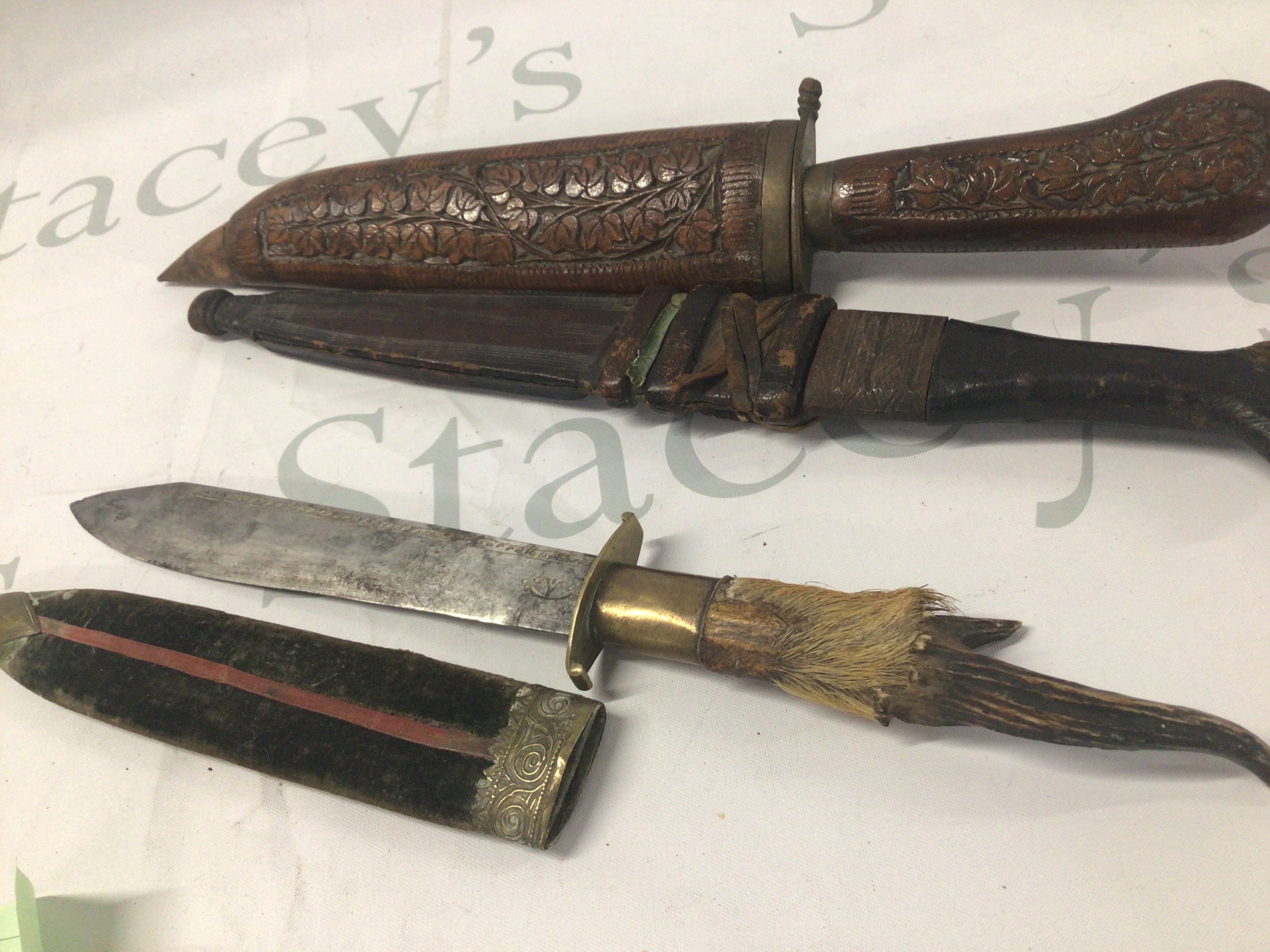 An Antique hunting knife with a natural horn grip. An African knife possible Sudanese and one other knife with a carved handle. (3)