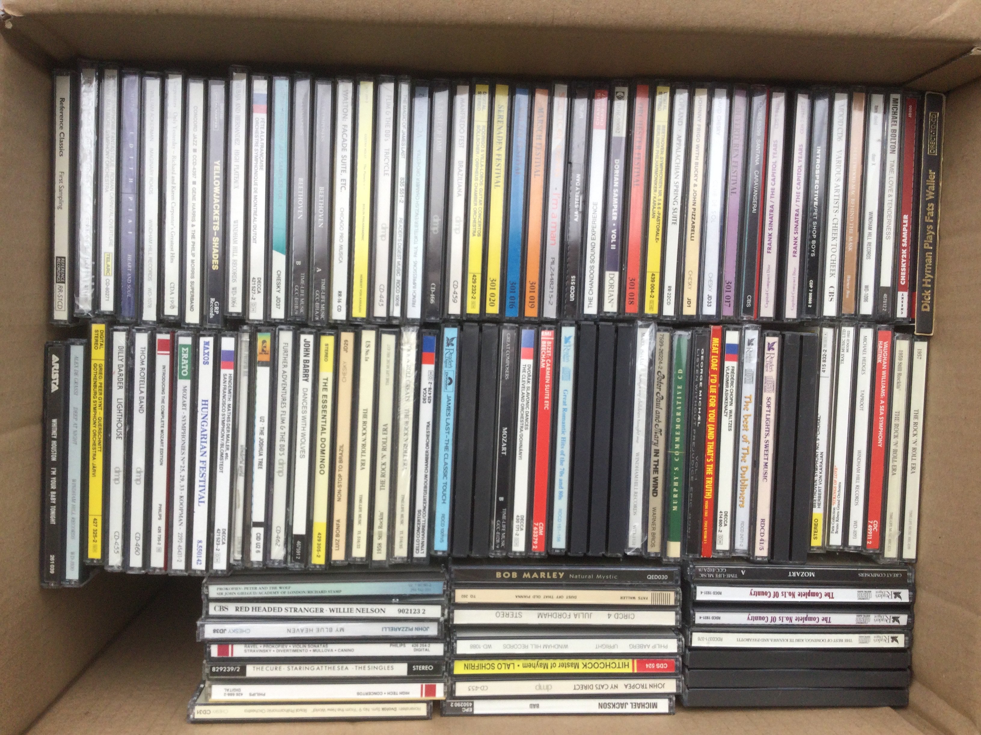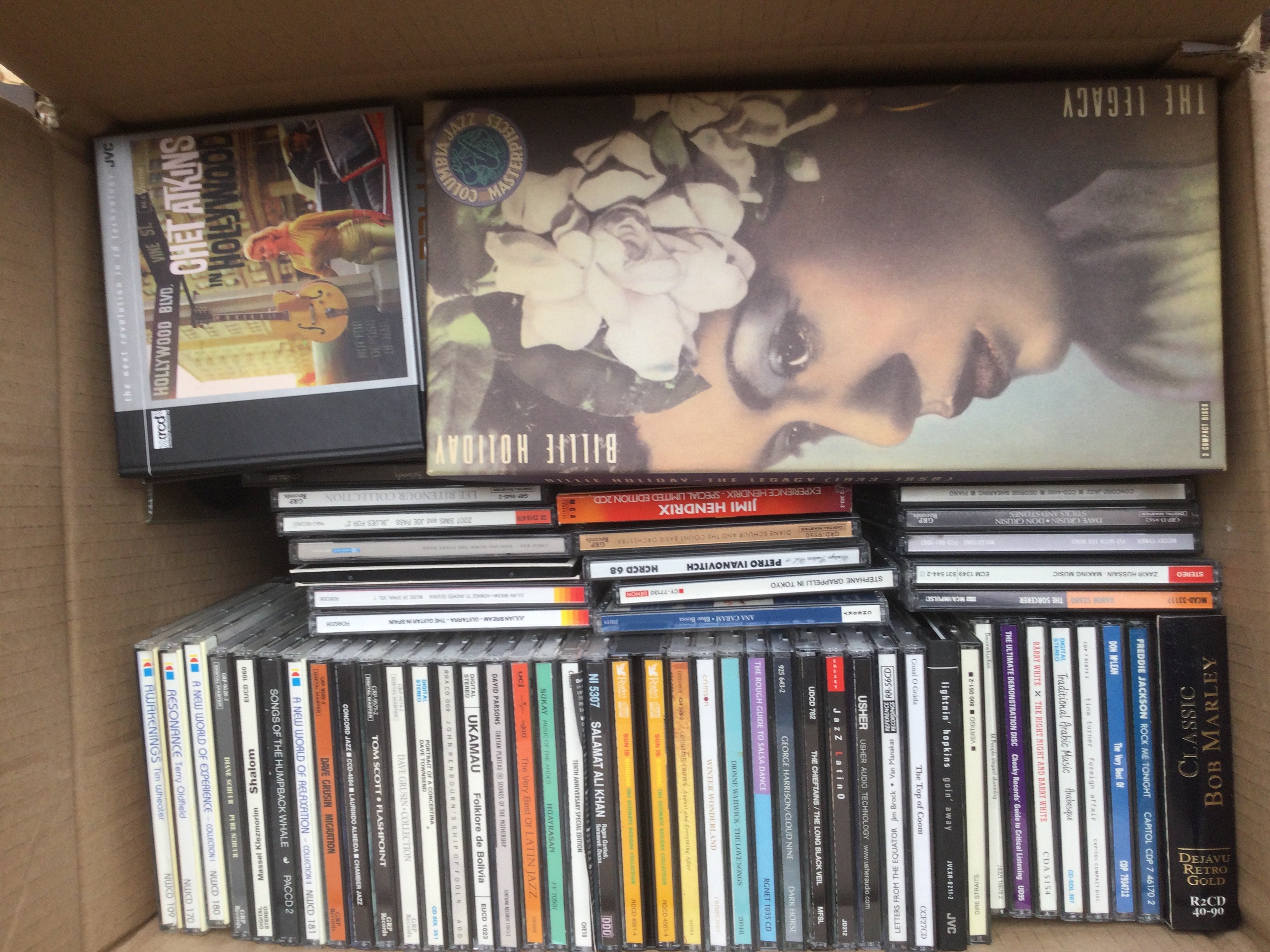 Two boxes of CDs by various artists including The Beatles, Oasis, Adele and many more.