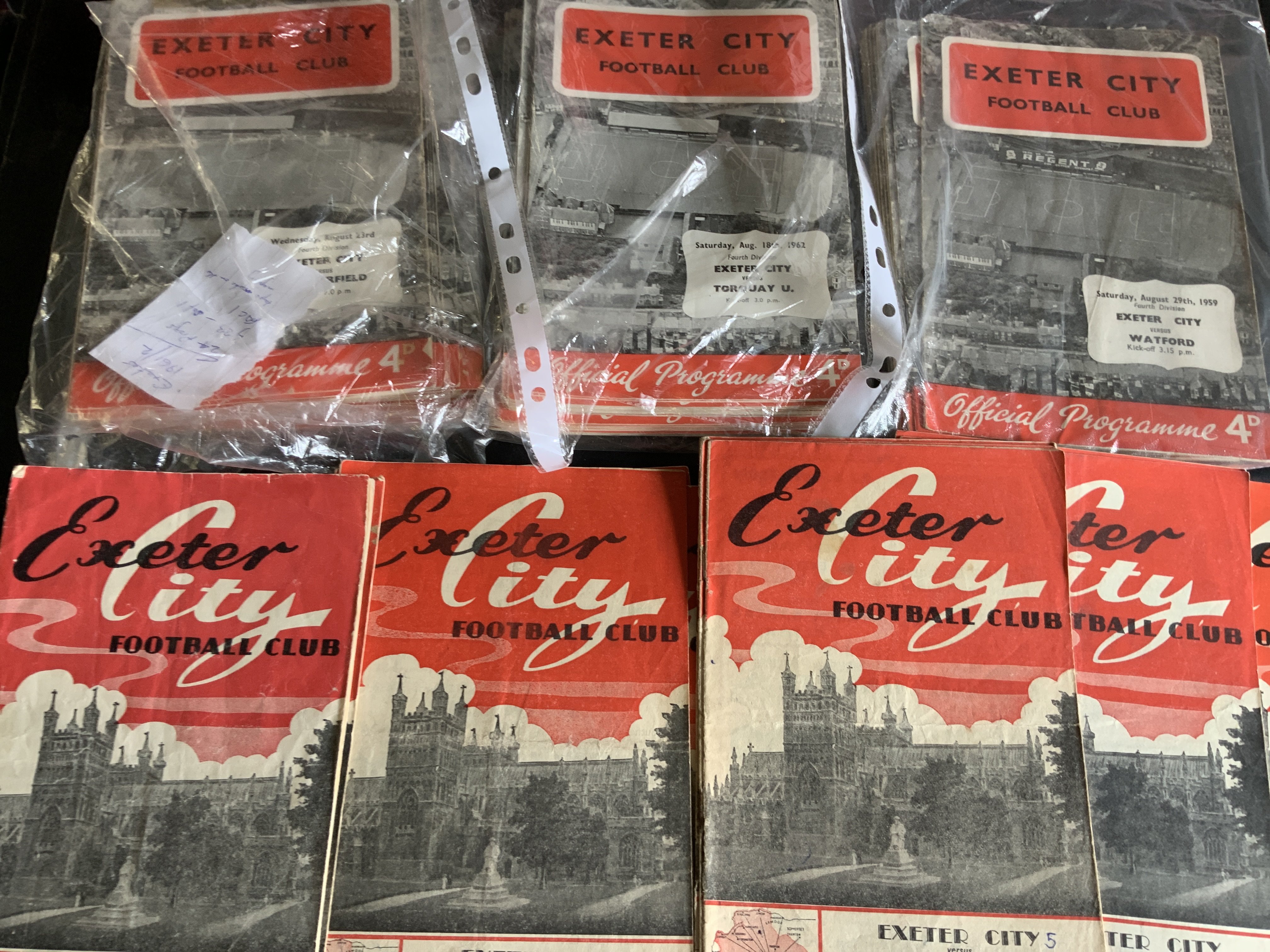Exeter City Home Football Programmes: Over 30 up to 59/60 plus a near complete set of 61/62. In total around 150 from the 60s plus some 70s. Instructions to sell. Mainly good. (est 230)