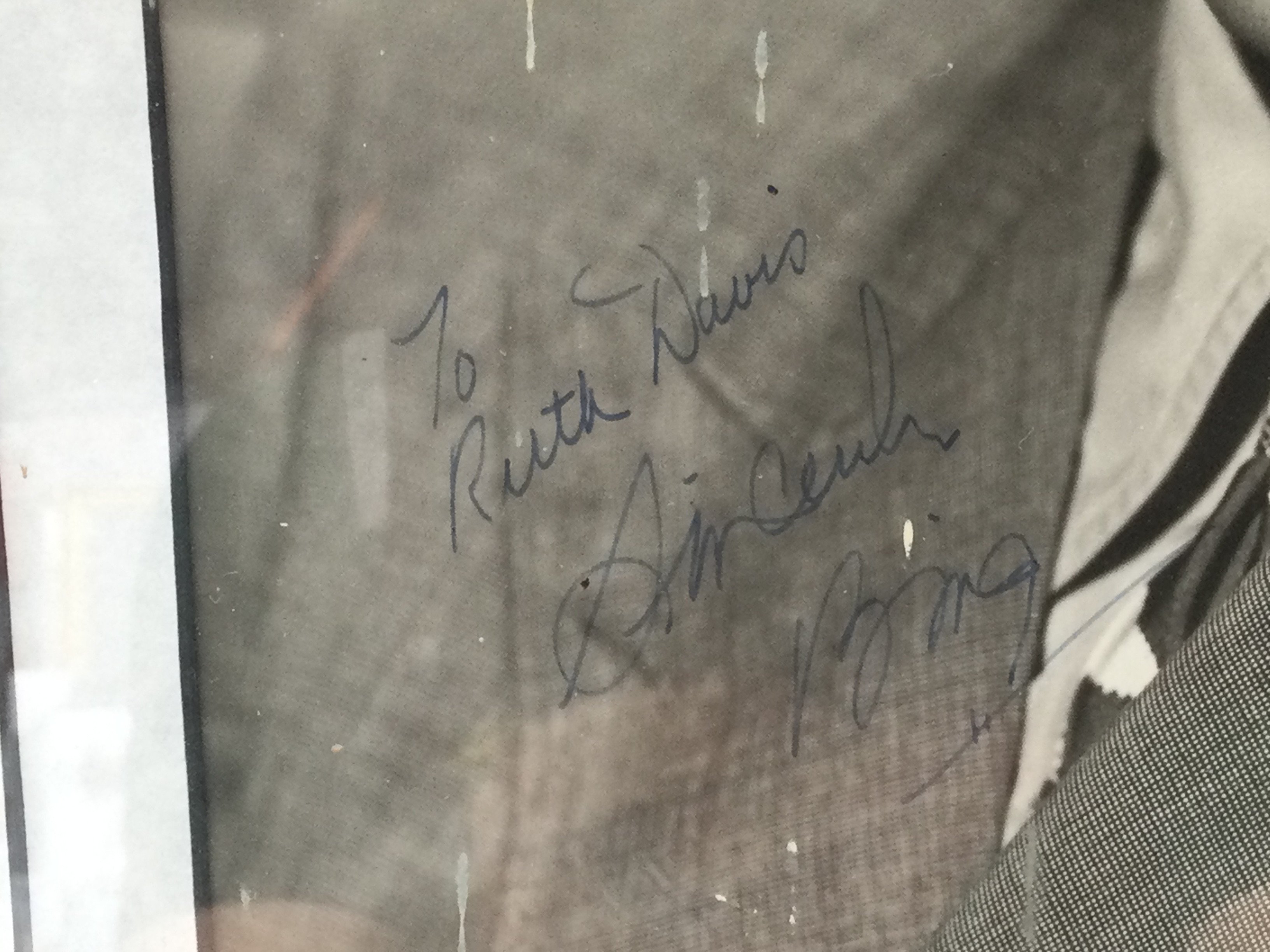A framed and glazed signed Bing Crosby display with COA, approx 34cm x 45cm.