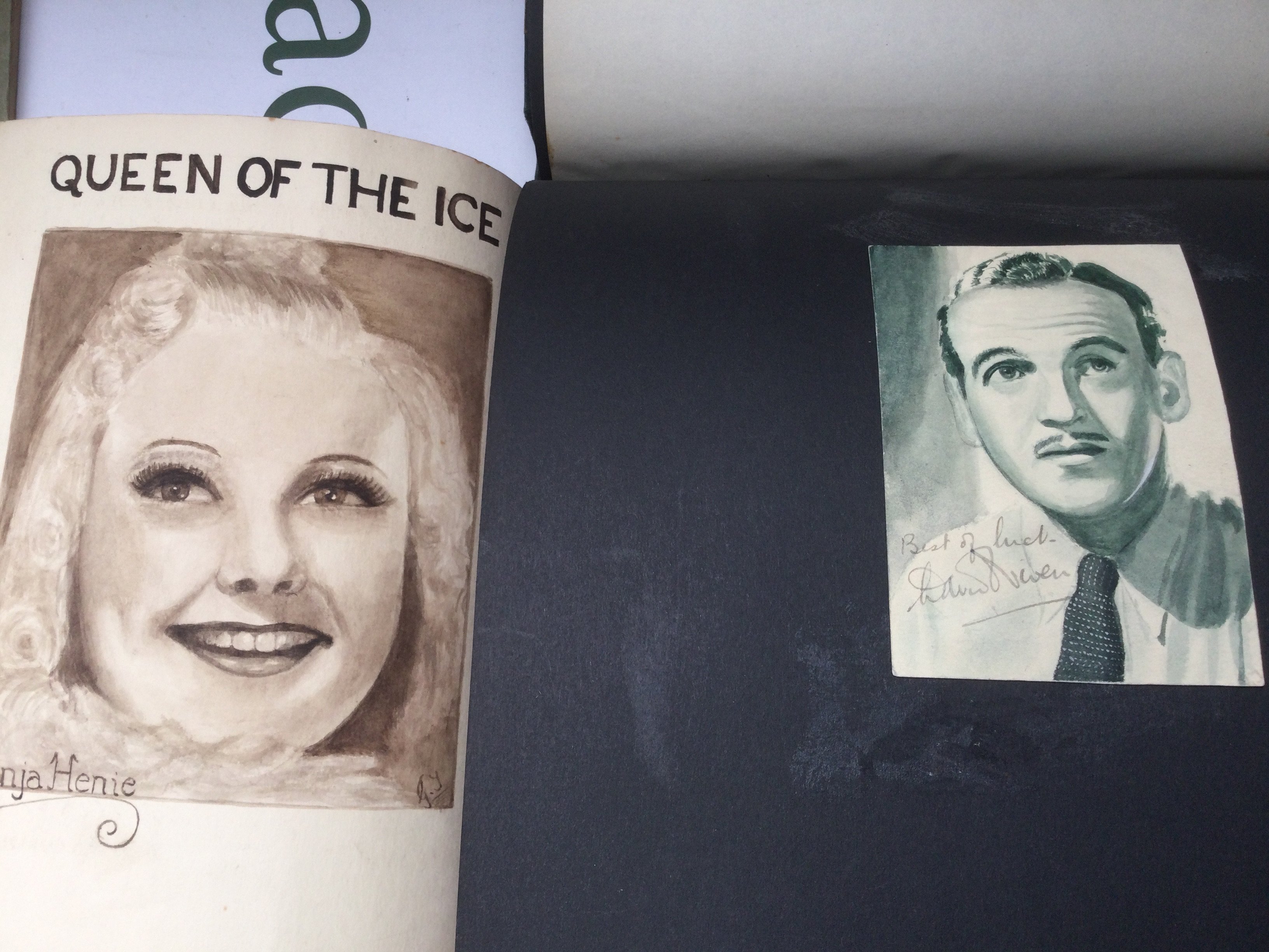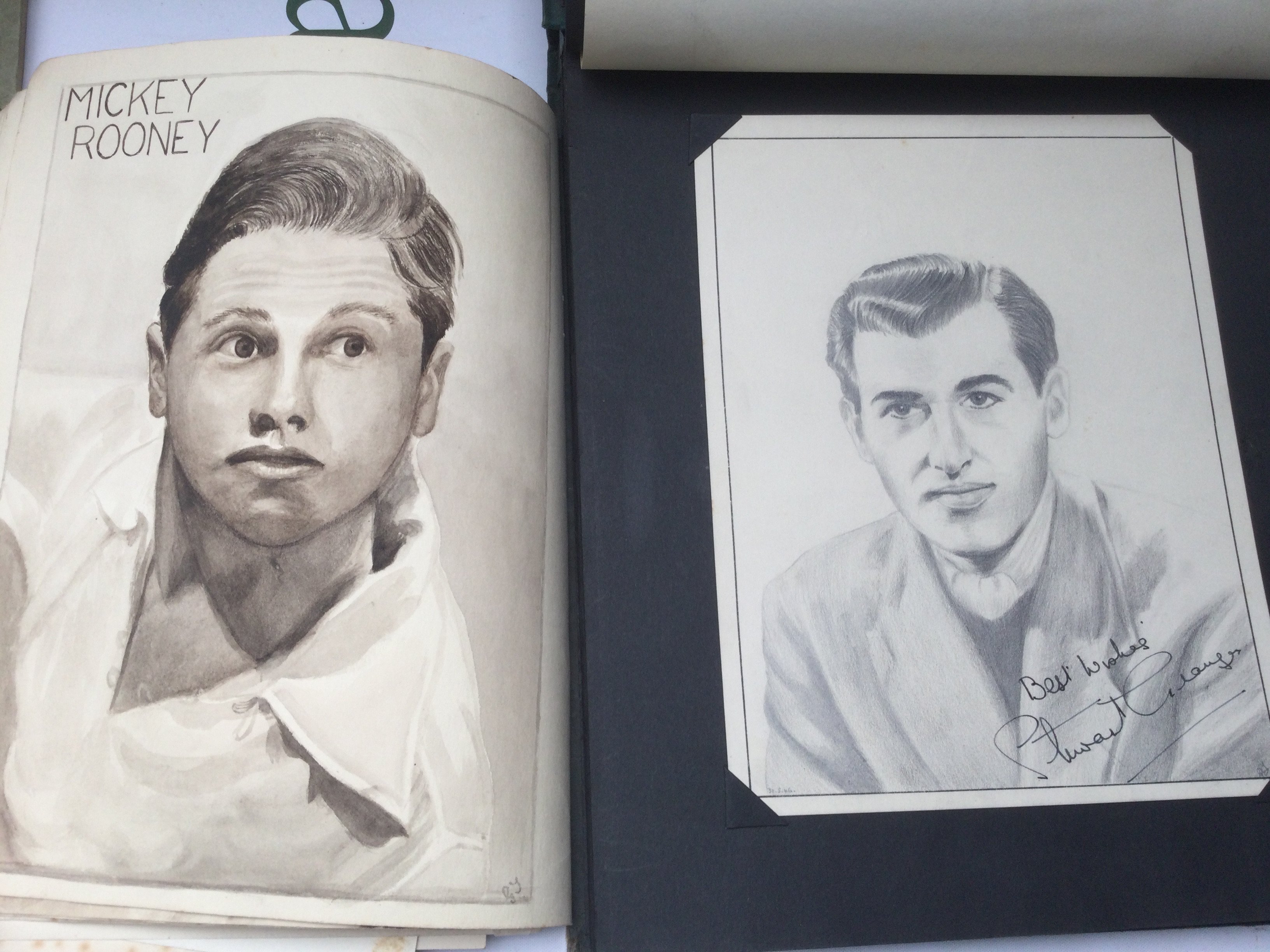 Three albums of sketches and watercolours of famous movie stars from the 1940s/50s onwards including 12 signed by various stars including David Niven, Mickey Rooney, Margaret Lockwood and others.