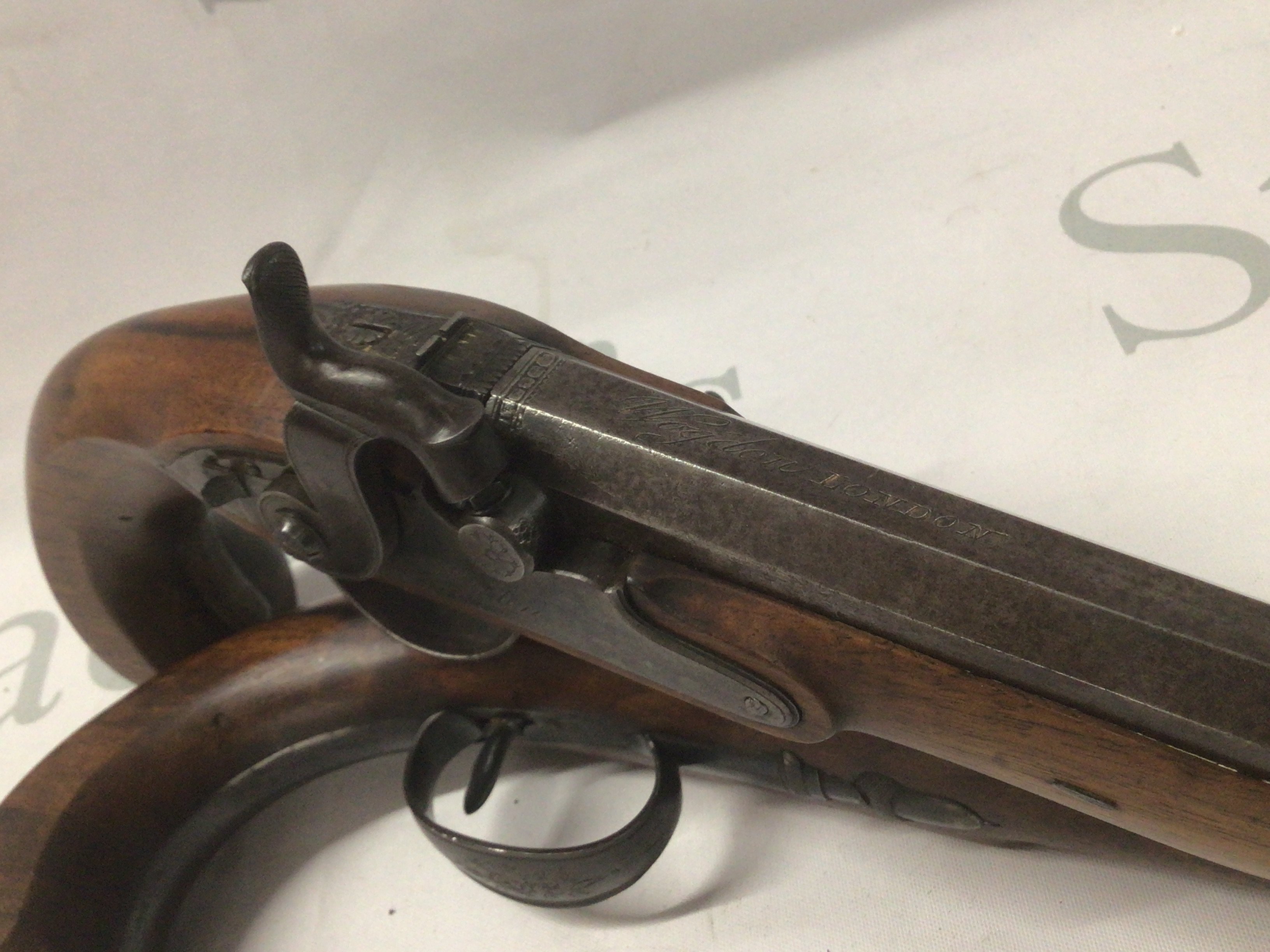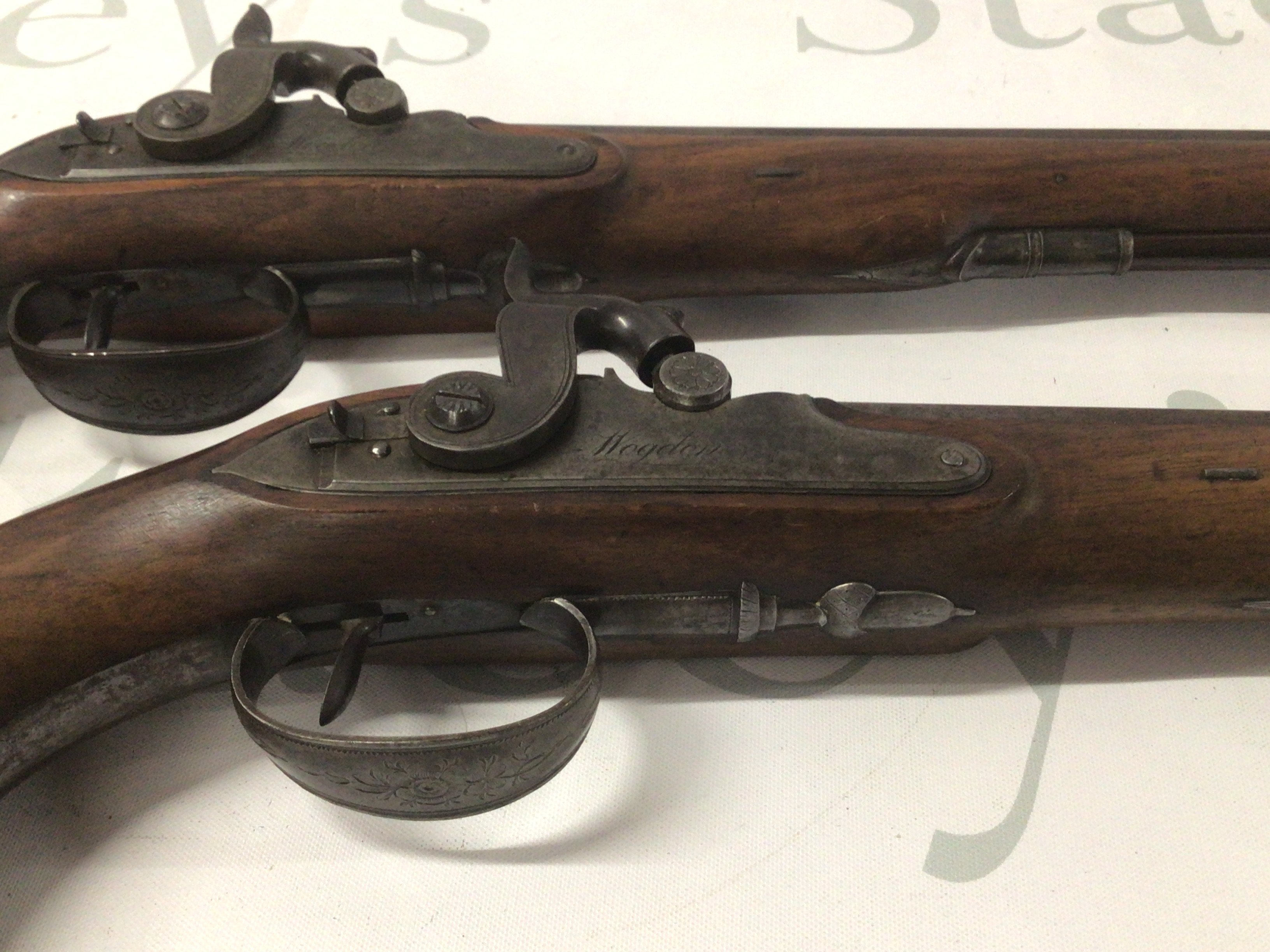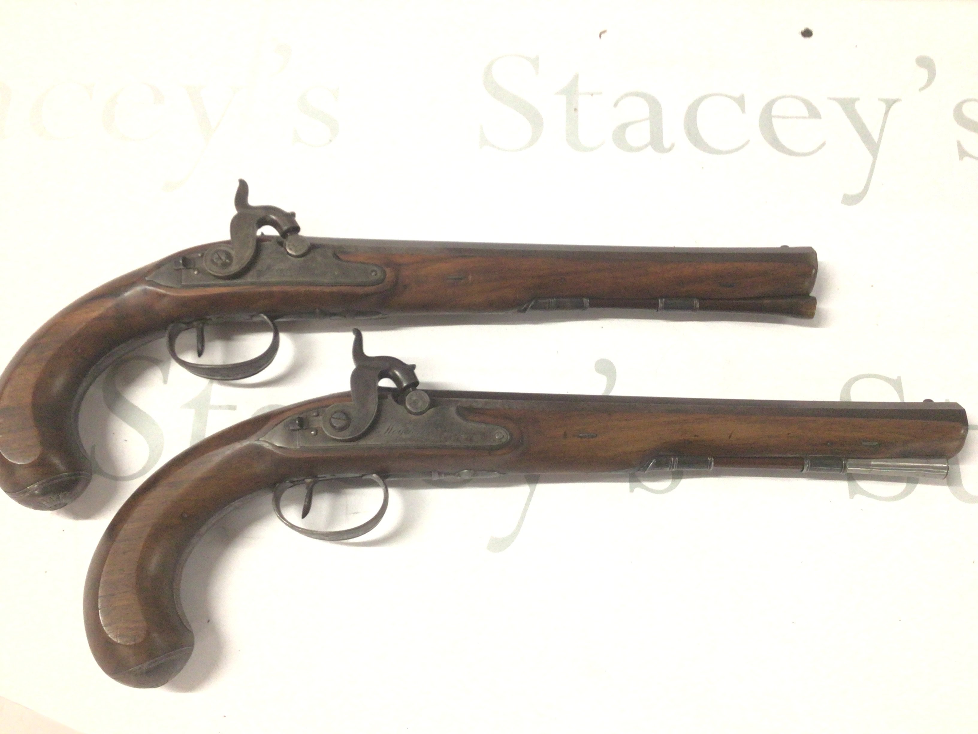 A Pair of Fine English 19th century duelling or sporting target pistols made by Robert Wogdon London the Percussion pistols with full walnut stock with engraved and acorn shaped trigger guard. The functional actions engraved Wogdon the octagonal barrels engraved Wogdon London slight variation on the ram rods. (2)