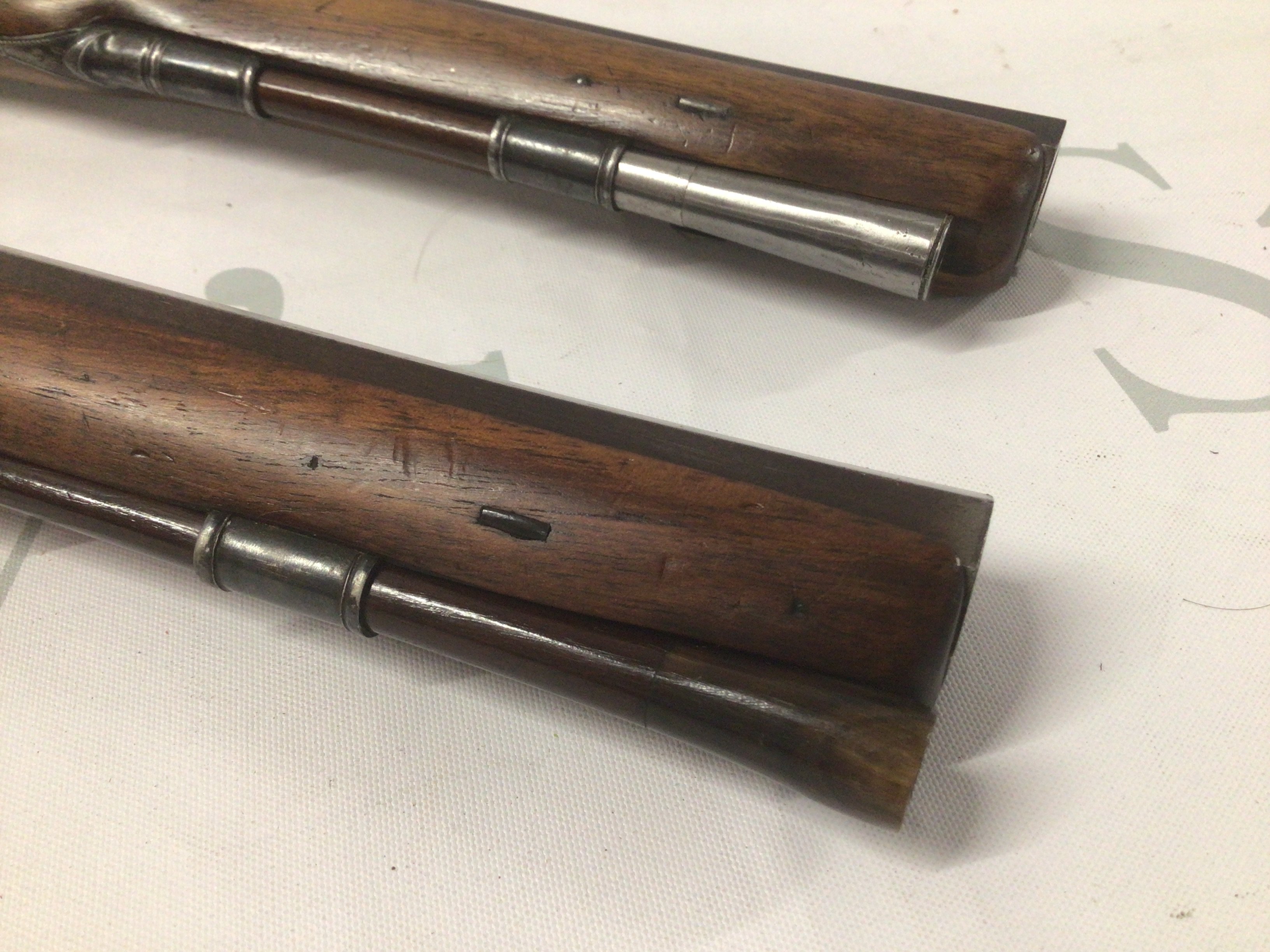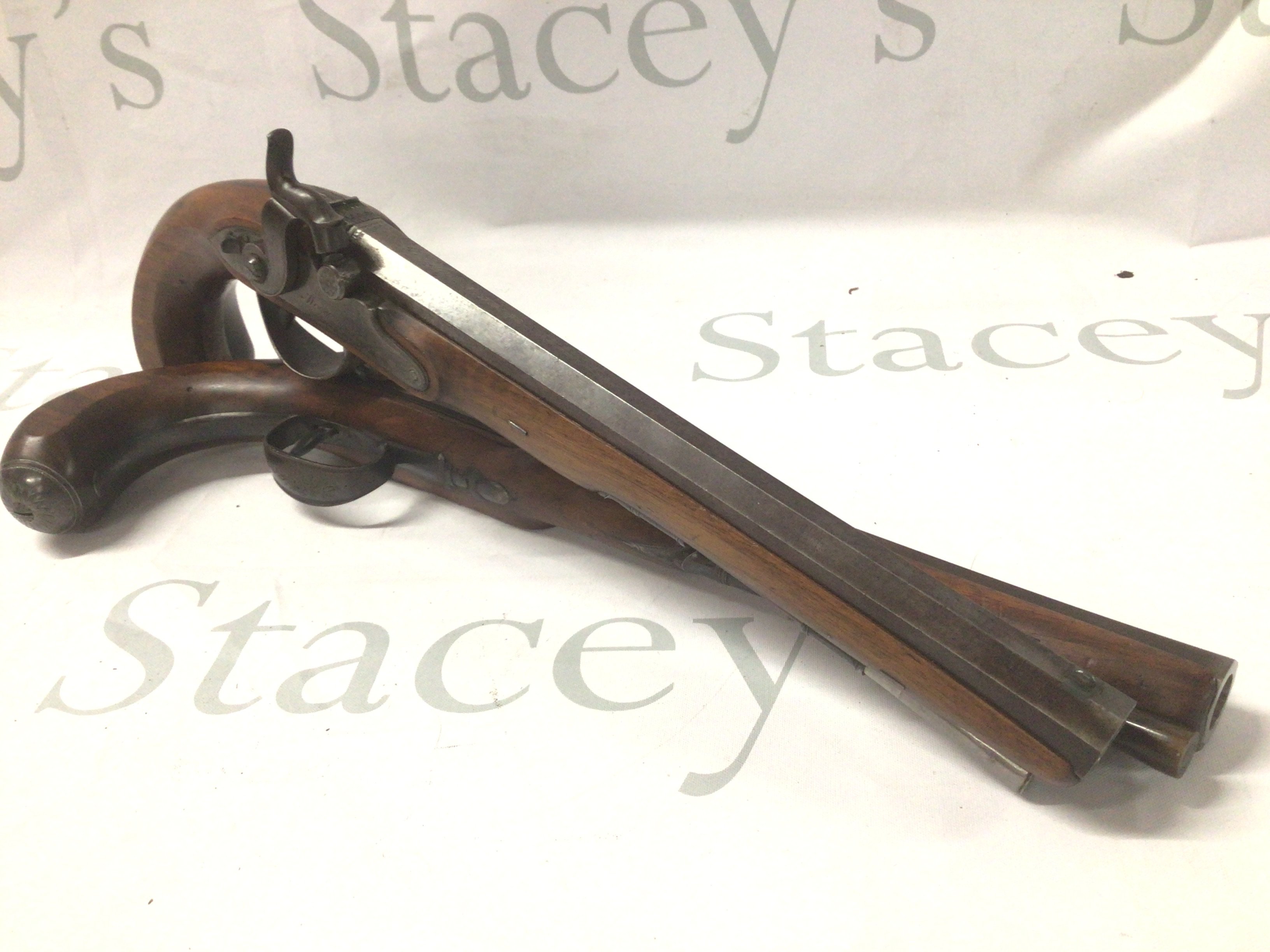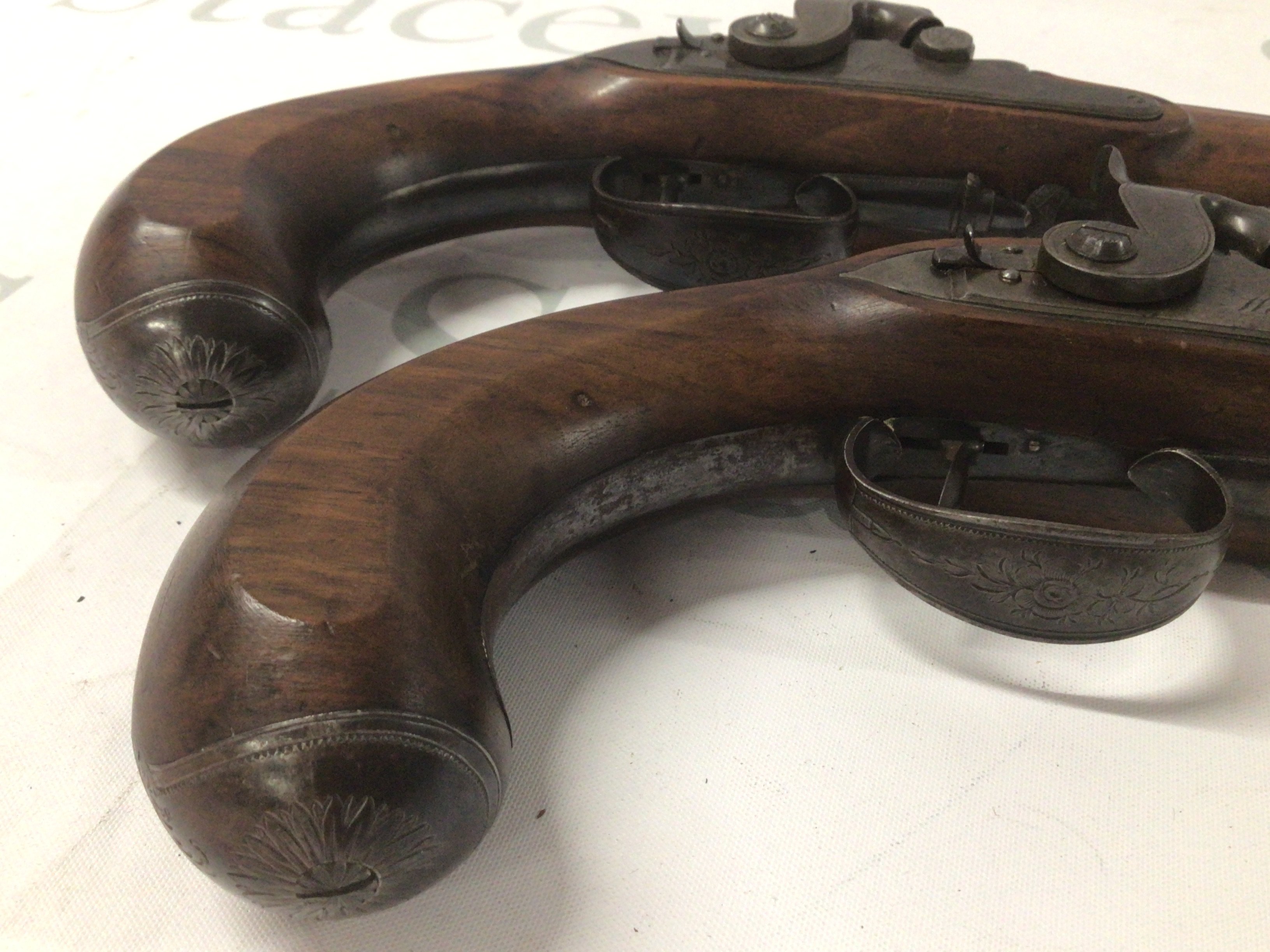 A Pair of Fine English 19th century duelling or sporting target pistols made by Robert Wogdon London the Percussion pistols with full walnut stock with engraved and acorn shaped trigger guard. The functional actions engraved Wogdon the octagonal barrels engraved Wogdon London slight variation on the ram rods. (2)