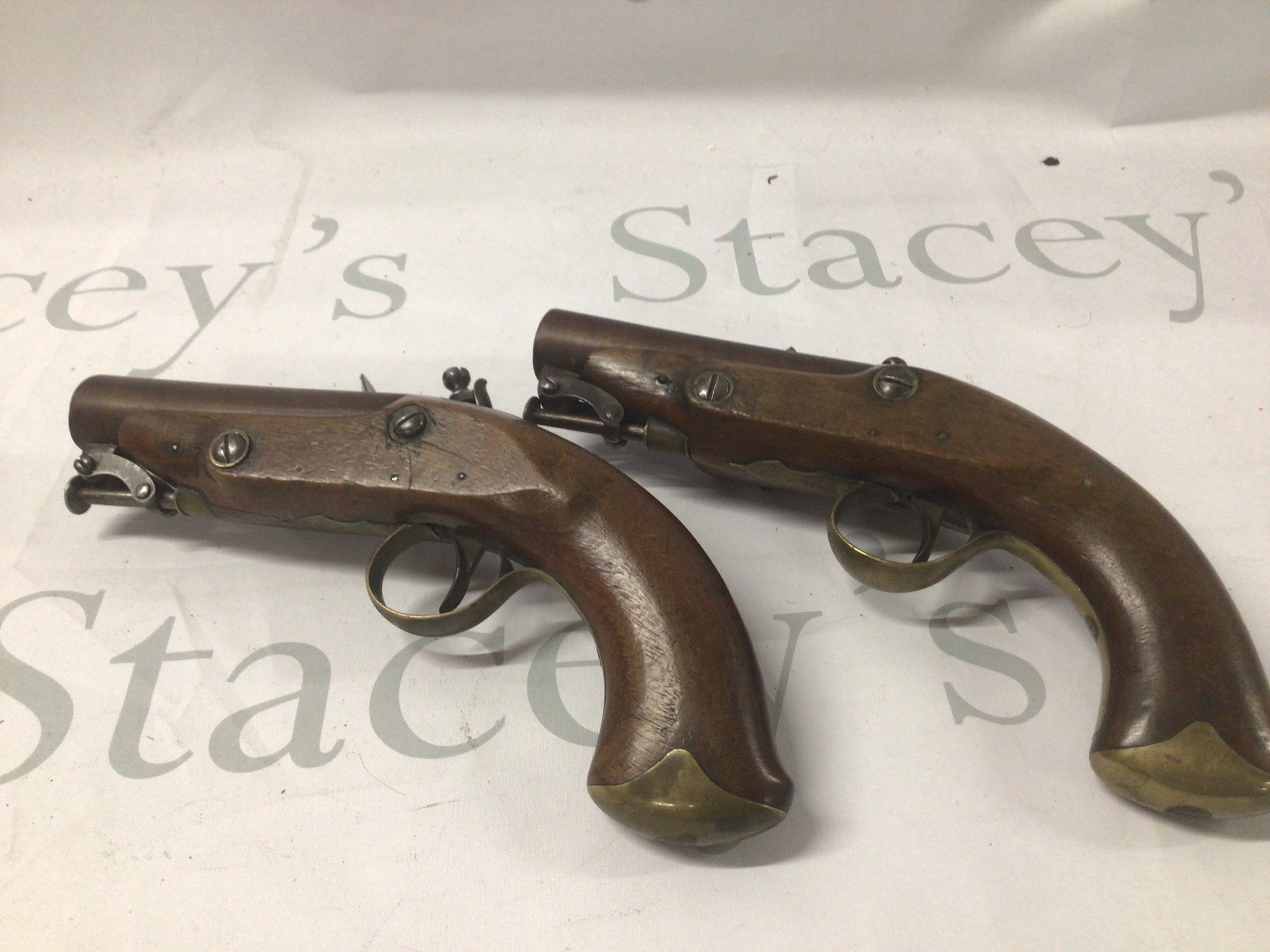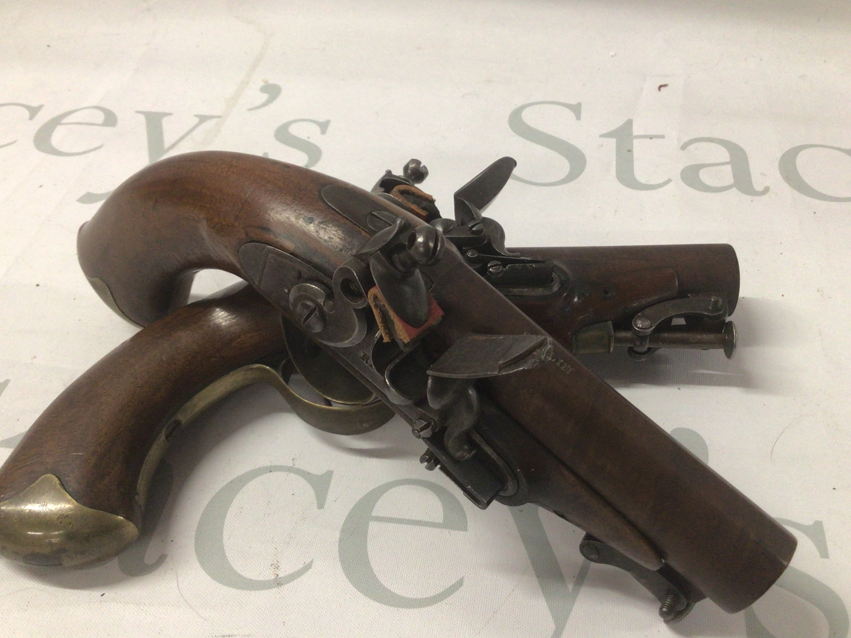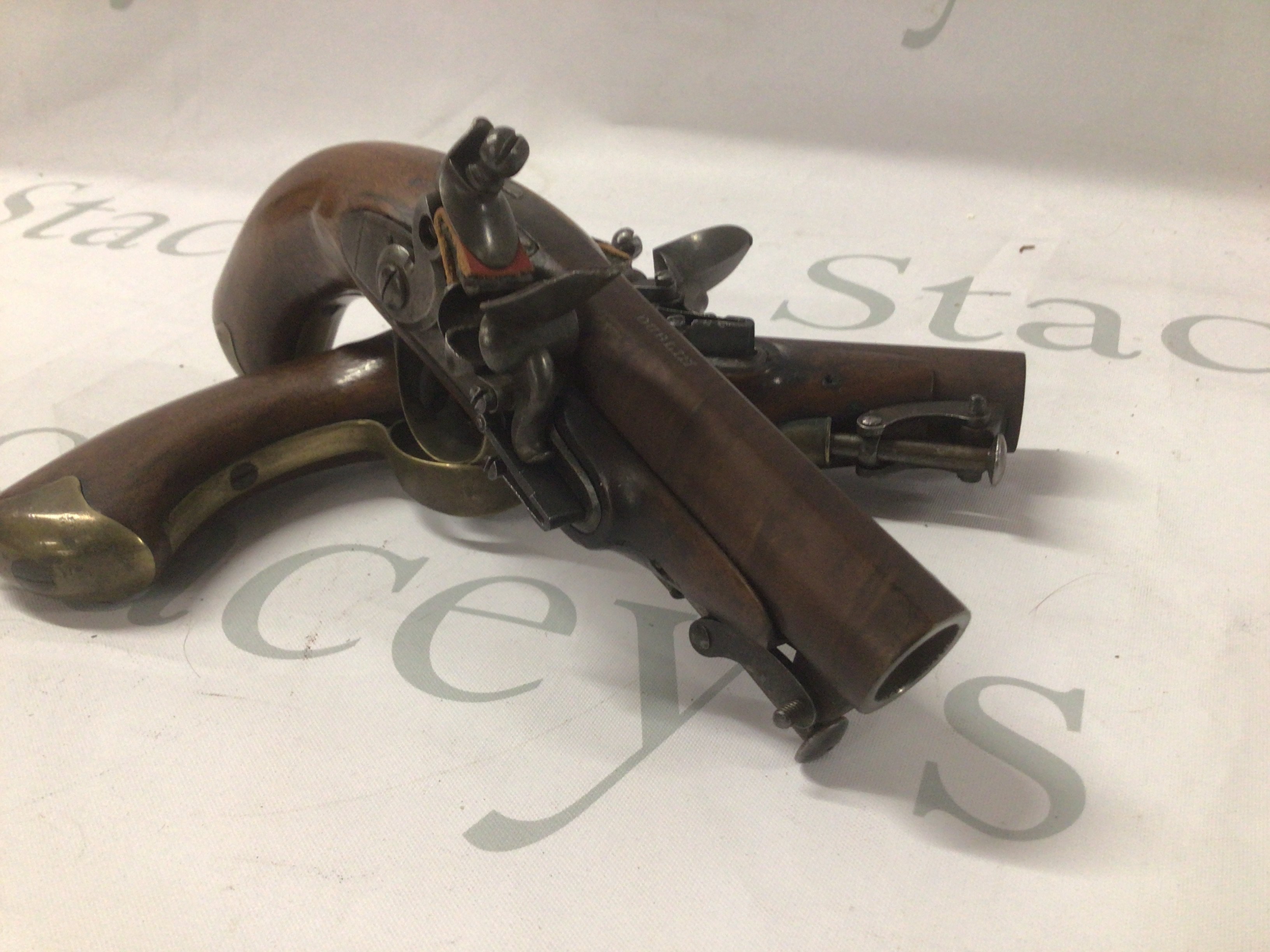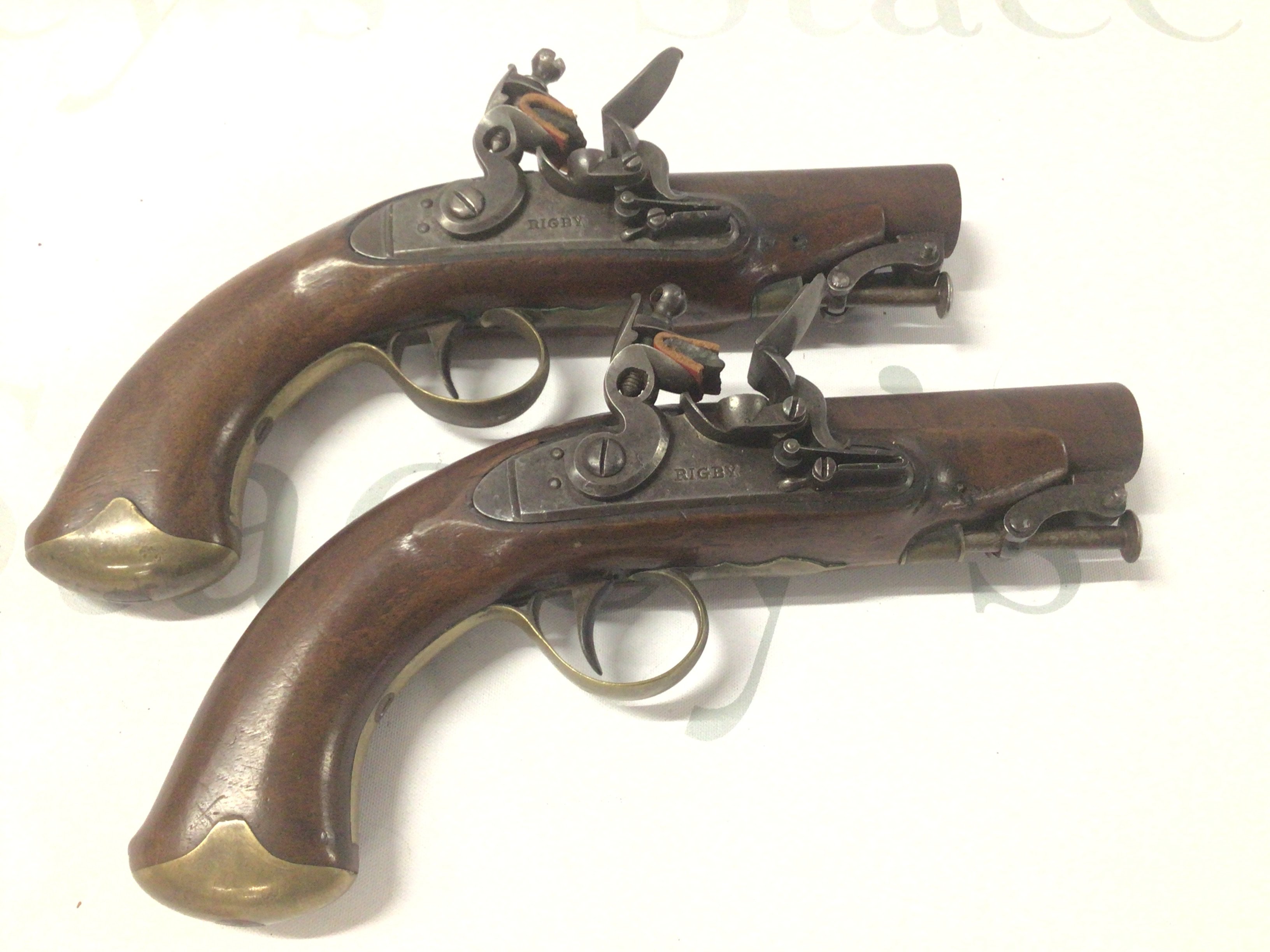 A pair of quality late 18th Century personnel protection flintlock Pistols maker Rigby Dublin with brass fittings the action stamped Rigby the large bore barrels engraved Dublin with fixed ram rods. Functional action.