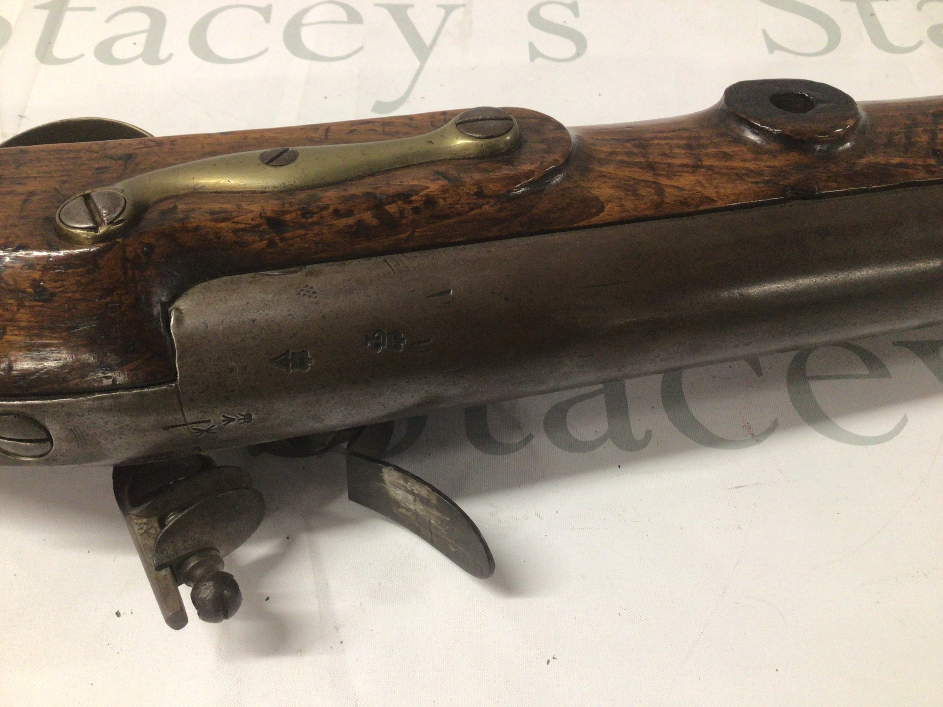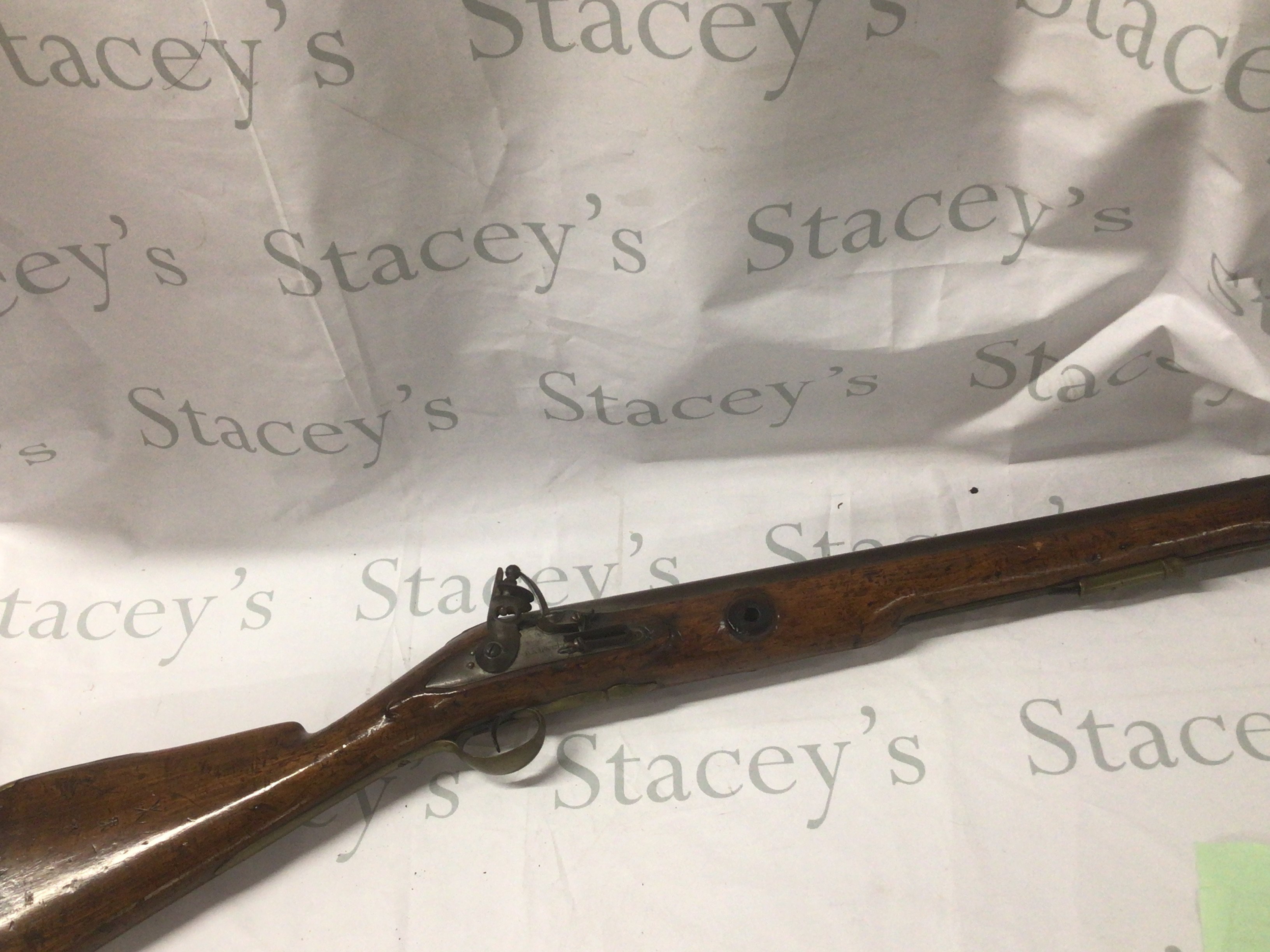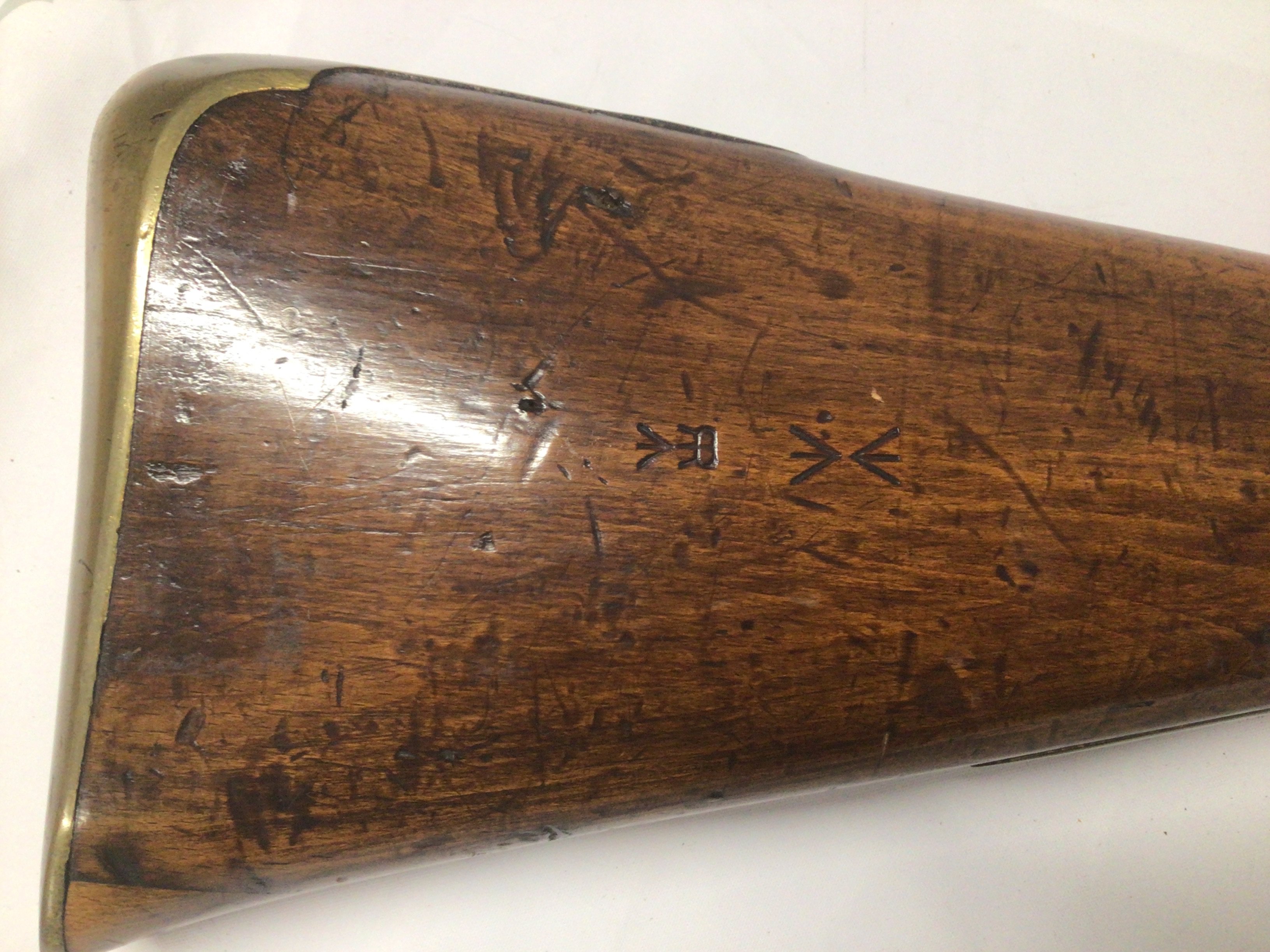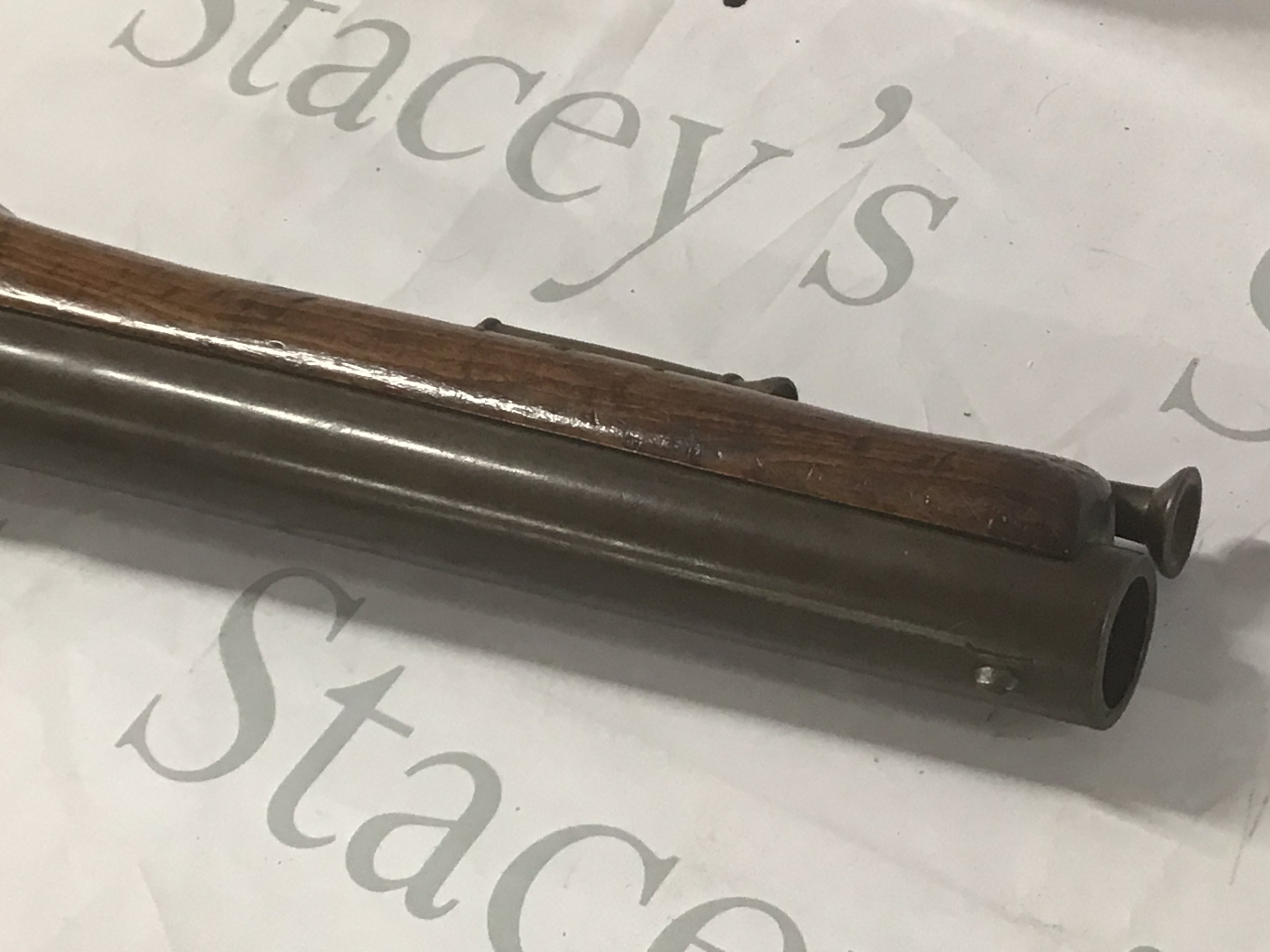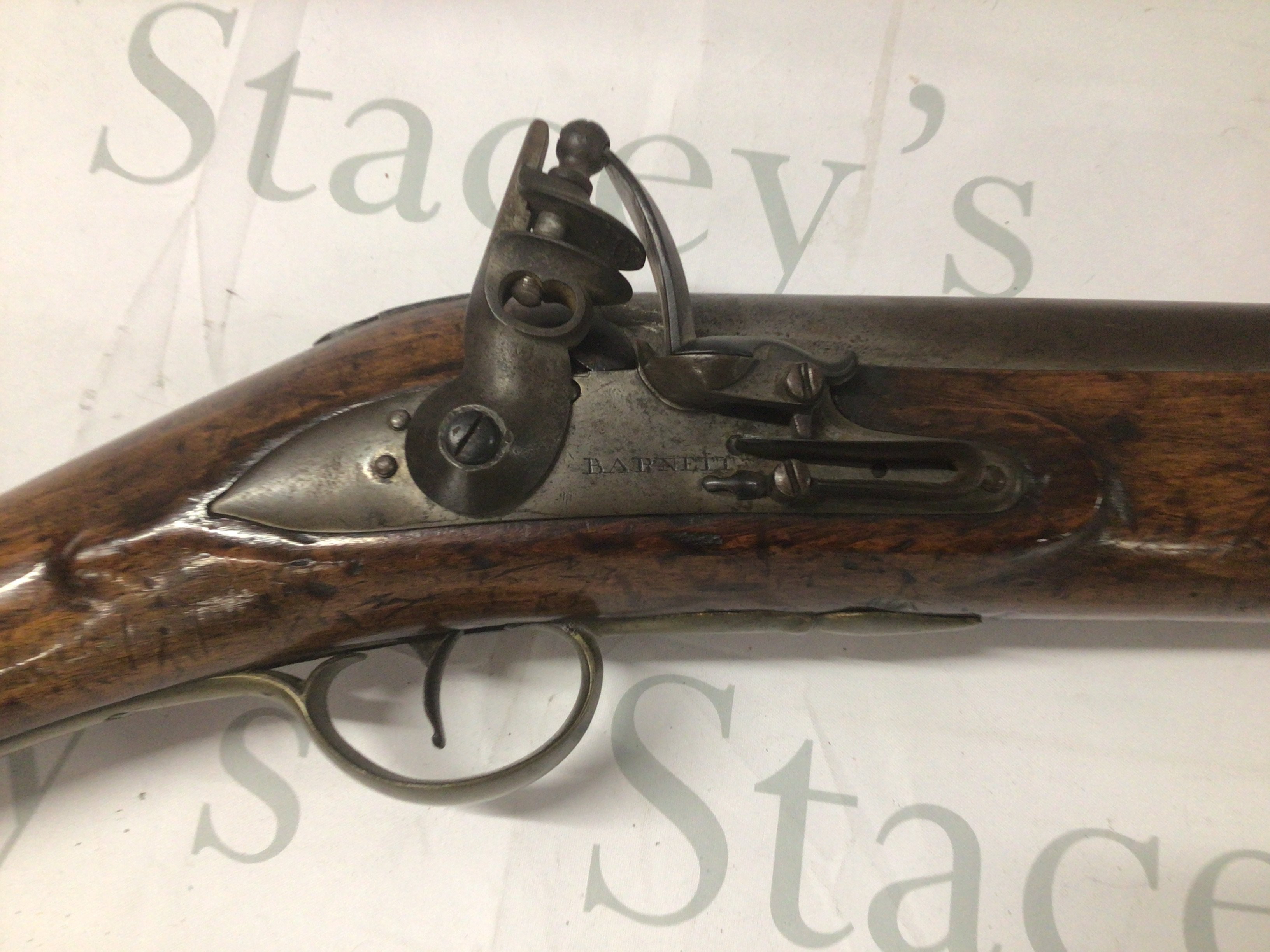 A Rare late 18th Century Flintlock Swivel gun possibly a navy deck gun the large gun with steel action stamped Barnett with brass fittings steel ram rod. Proof marks to the barrel possibly 4 bore the stock with further marks. JE Barnett gunsmiths of London founded 1796. Known supplies to The East India Dock Company and also manufacture of weapons used during the American Civil war.